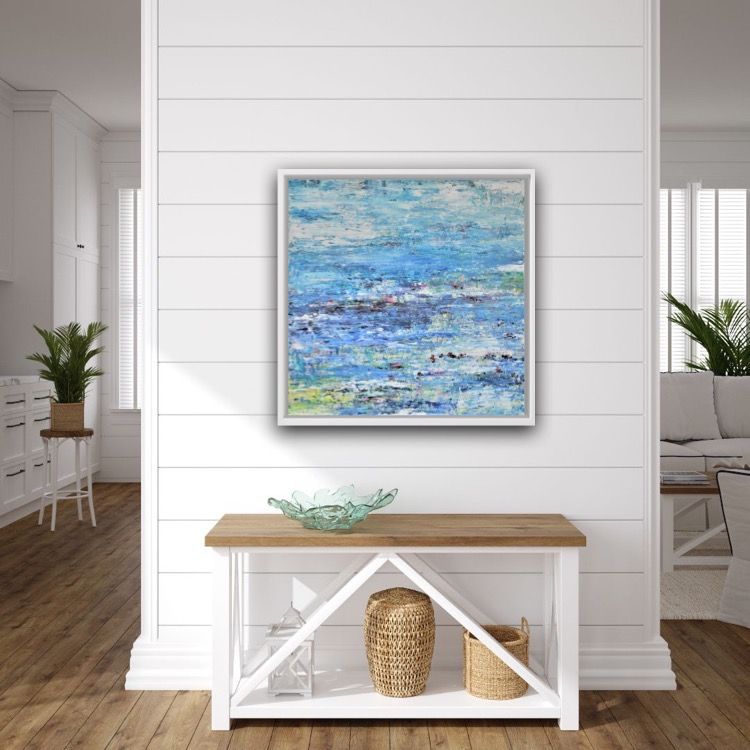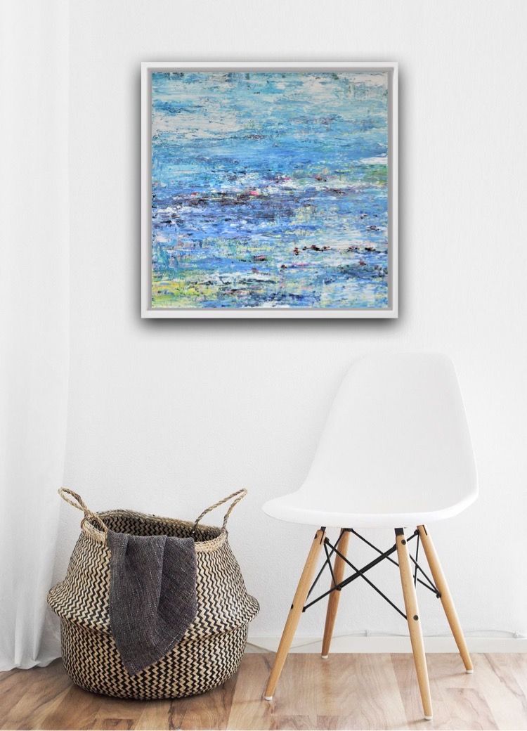 A Beautiful Day is an original abstract water feature landscape by emerging abstract artist Diane Whalley. The paint for this impressionist piece is applied not only with a brush but also with a palette knife creating thick texture and a feeling of movement through the water and the shimmering from