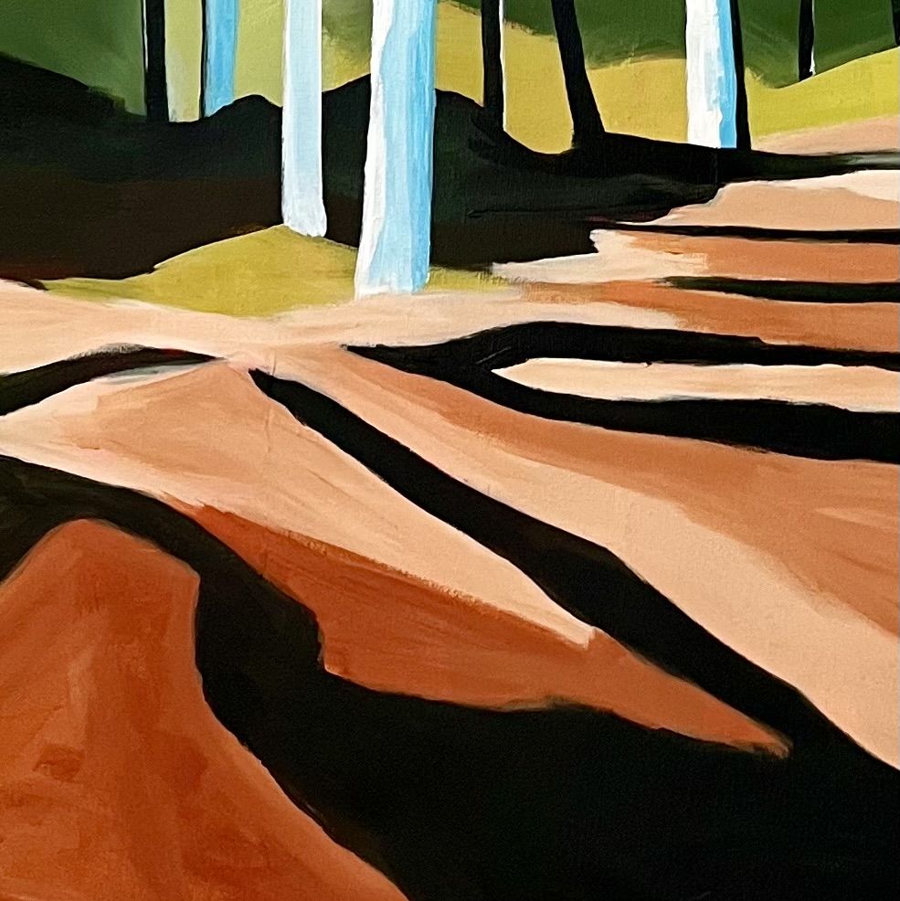 This piece is a meld of two countries. The palette and trees are inspired by the bush in West Australia and the composition is influenced by the Bourne Woods in Surrey. The clarity of the blue in Perth is like nothing else. The paints are applied directly on