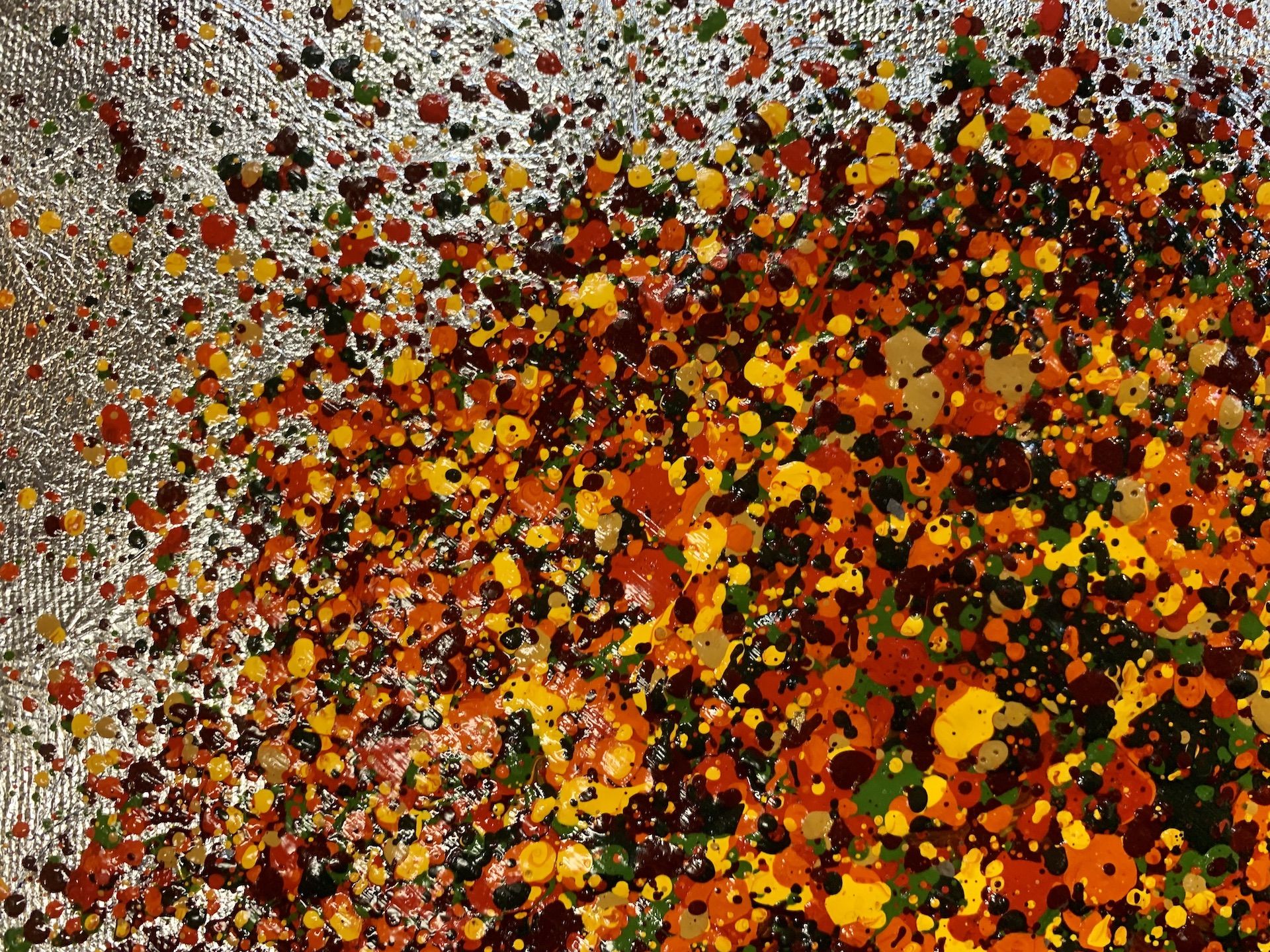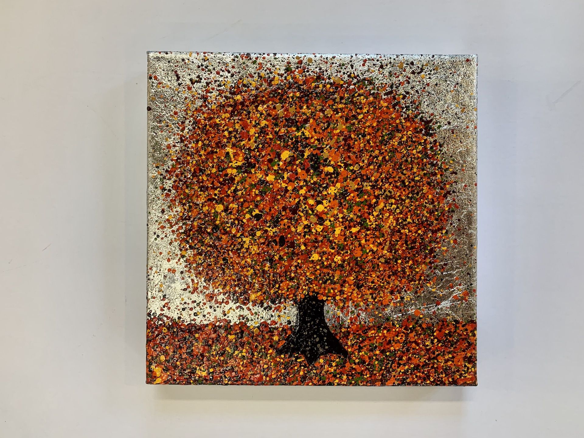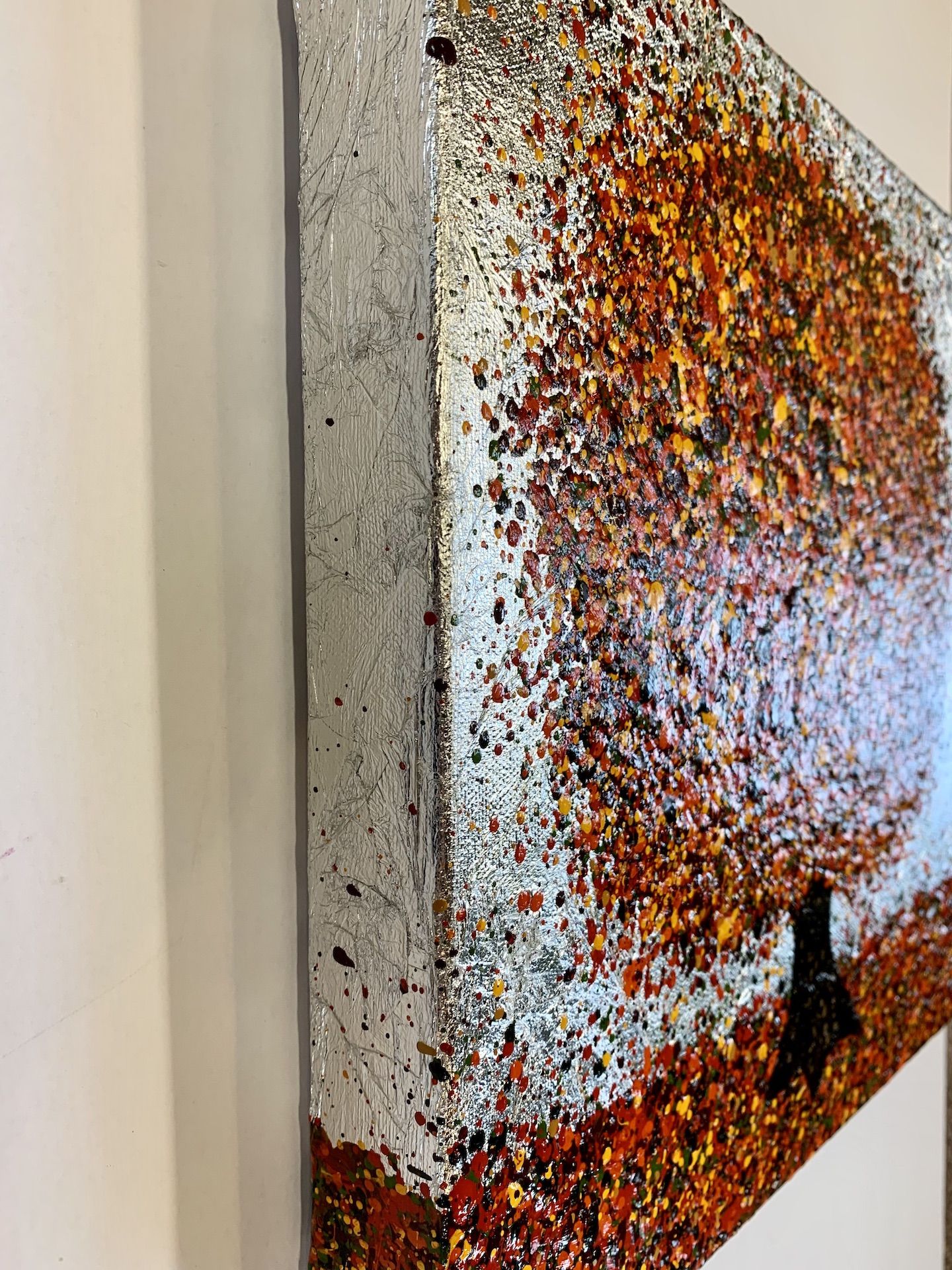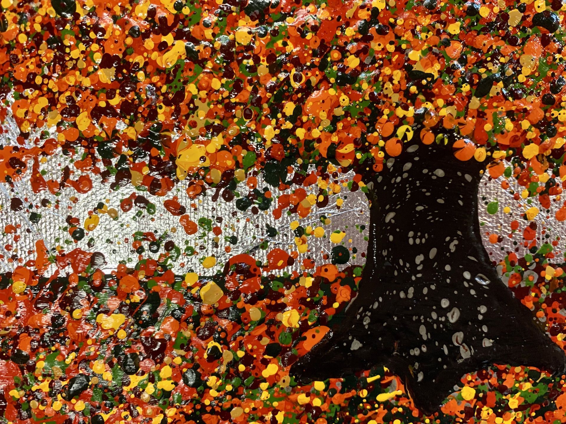 A Little Silver Autumn Sunshine is a signed original acrylic painting on canvas by Nicky Chubb of a red and orange floral tree in a field of blossoms of the same colours against a silver sky.