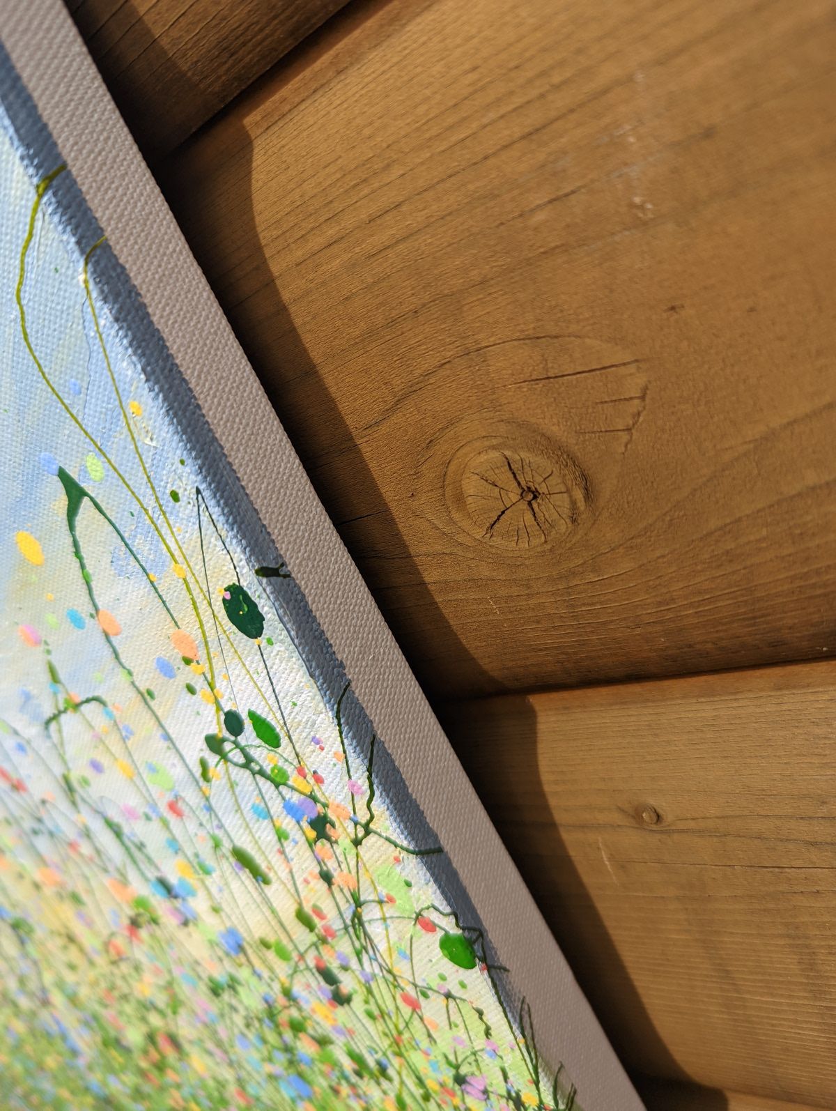 A Mornings Chorus - An Original semi-abstract painting by Lucy Moore. Using her signature string grass technique Lucy has created a semi-abstract twist to her classic meadow paintings. Colourful pastels flowers beneath a sunlit skyline. This piece would brighten any home or office, bring a little of the outside inside.