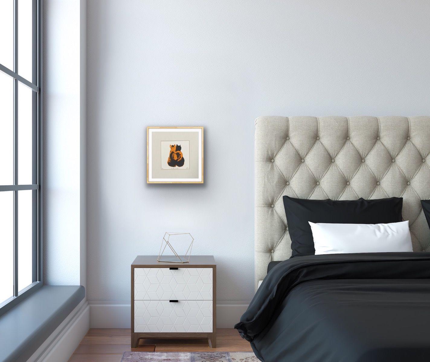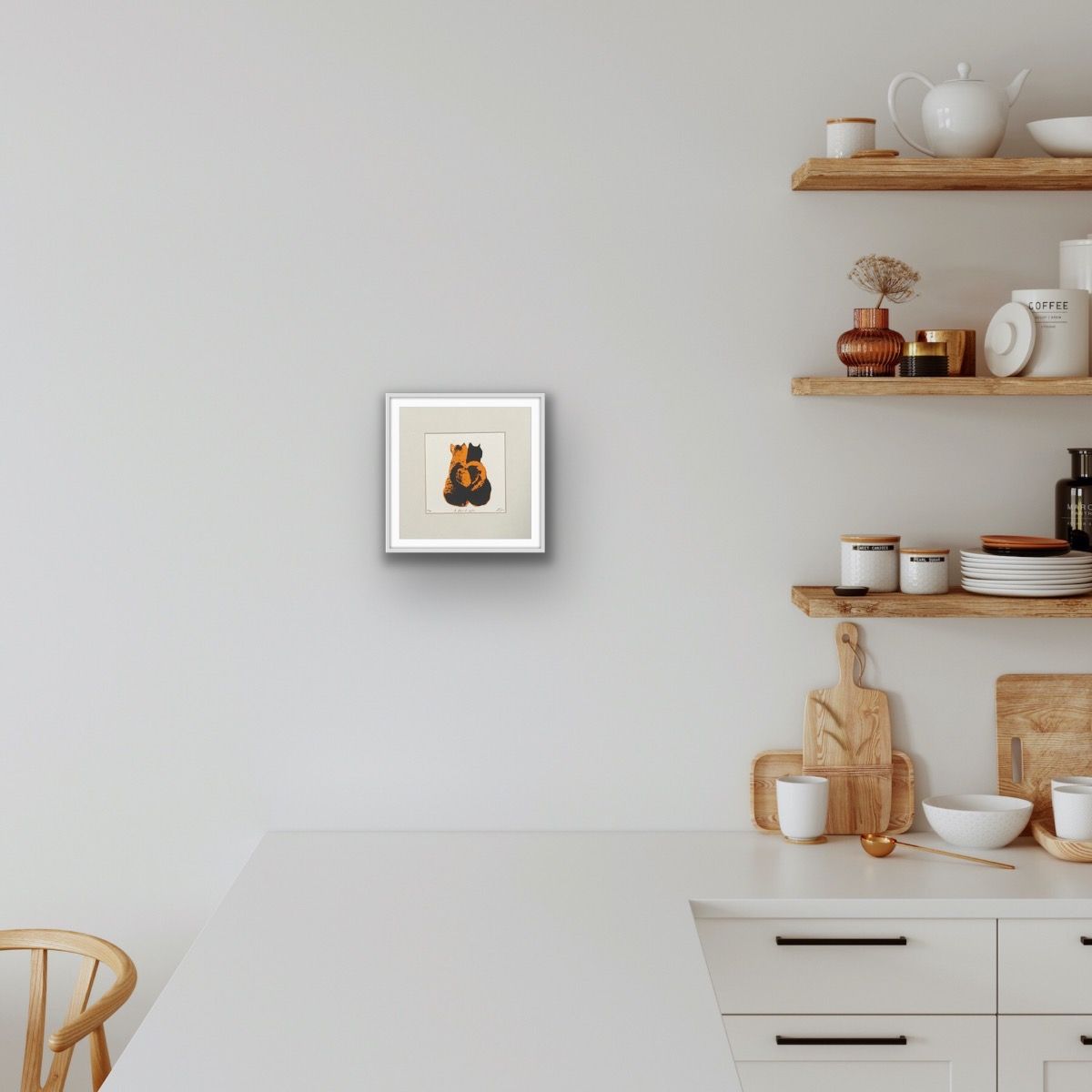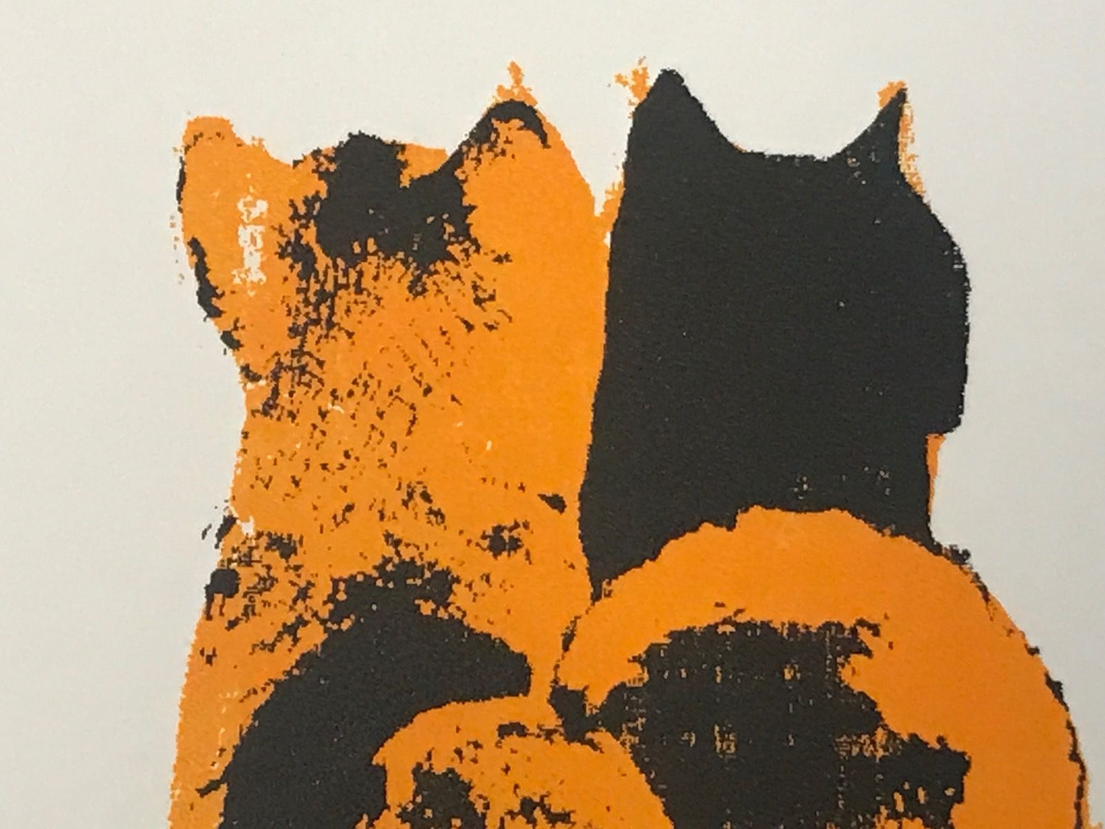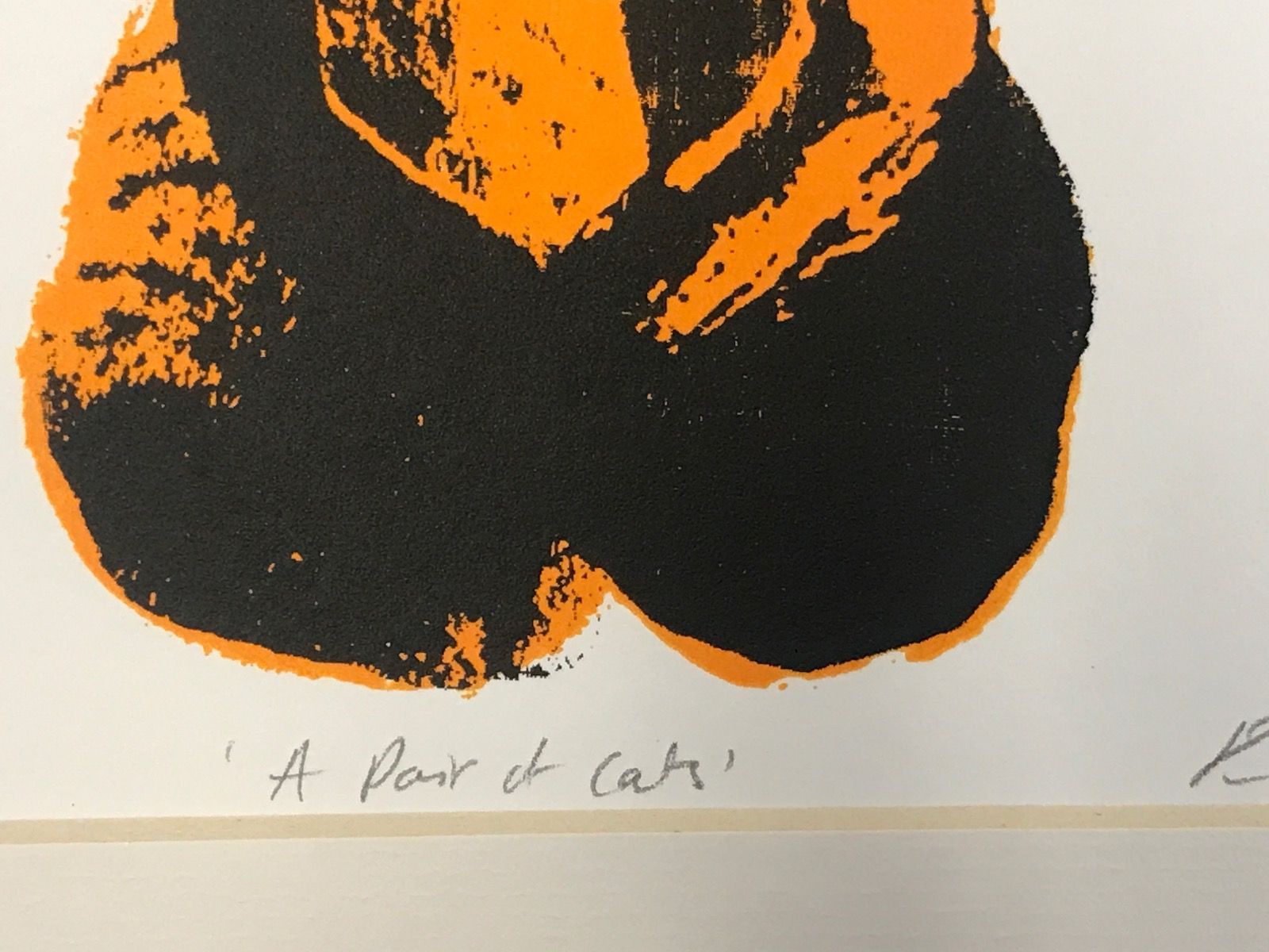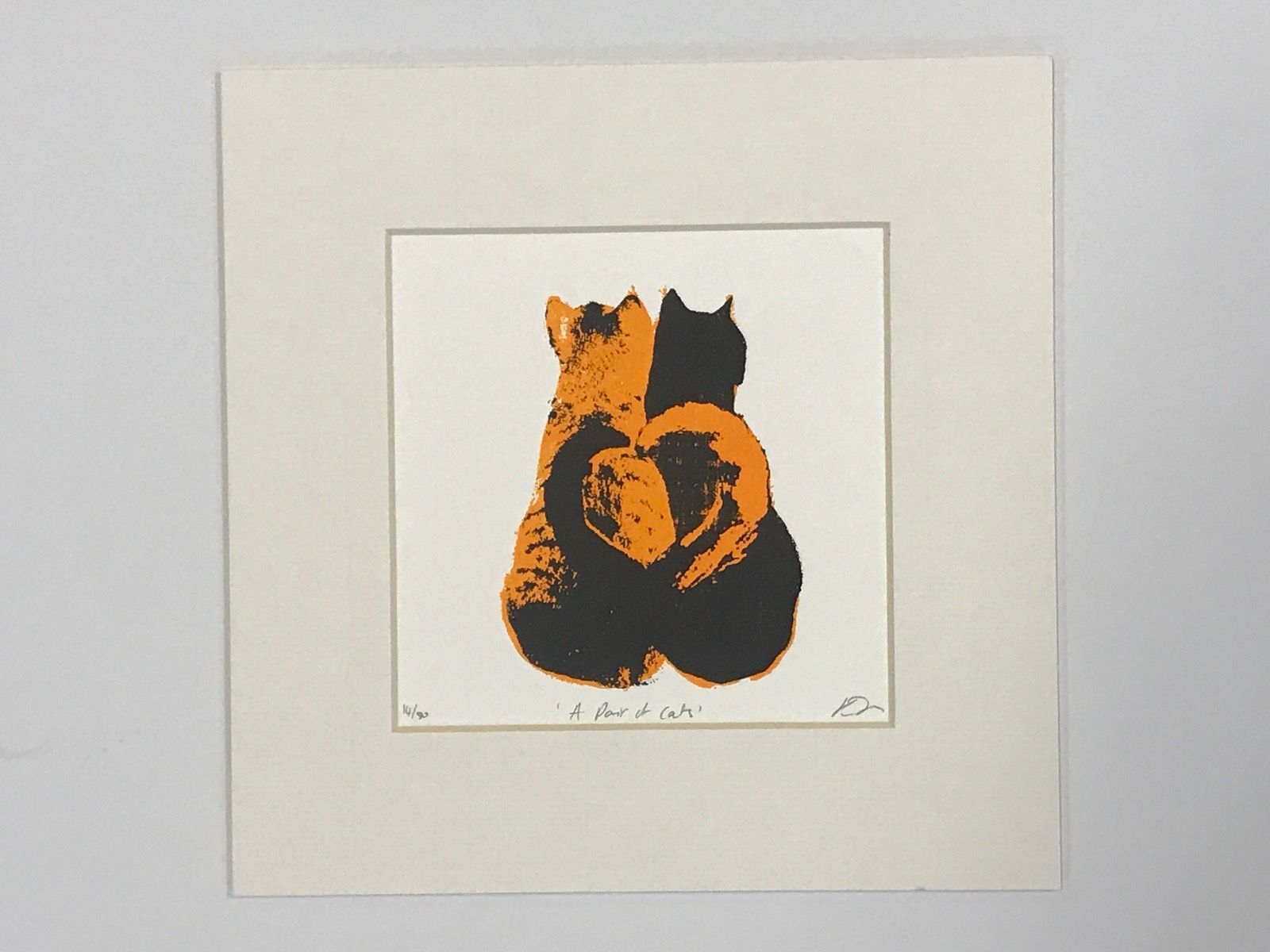 Katie Edwards A Pair of Cats Original Silkscreen Print Edition of 50 Size: H 20cm x W 20cm Please note that in situ images are purely an indication of how a piece may look. 'A Pair of Cats' Original Silkscreen Print by Katie Edwards Colourful and fun illustration representing True Romance in the animal