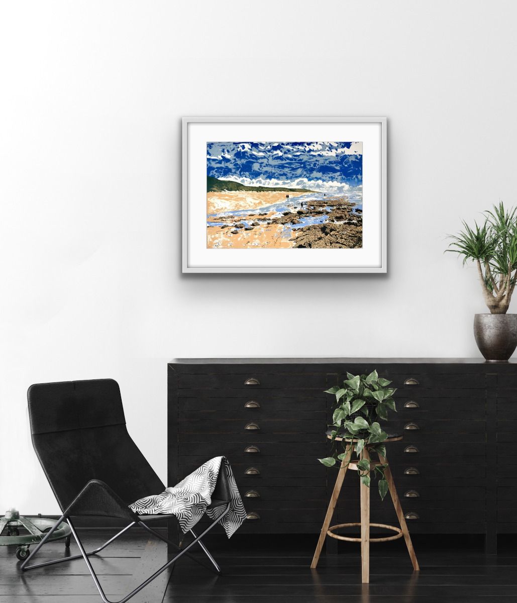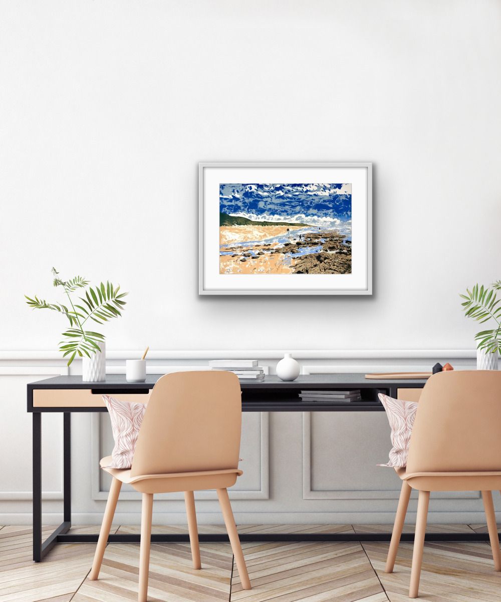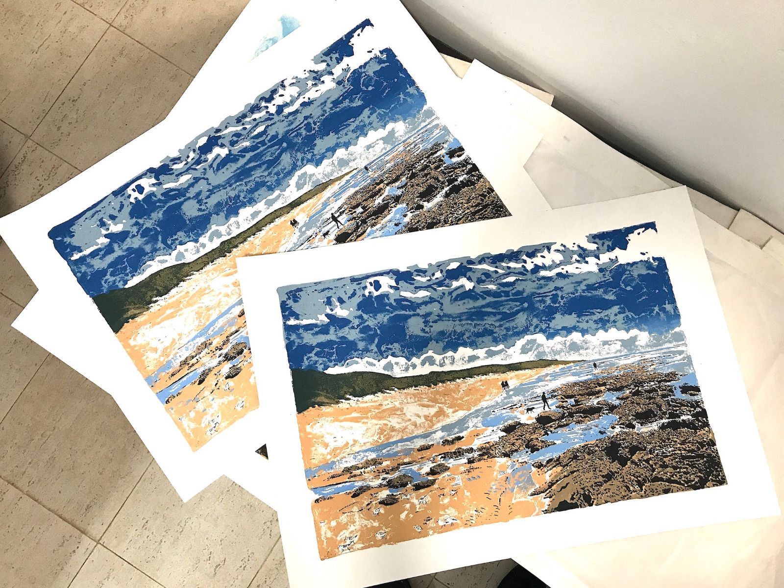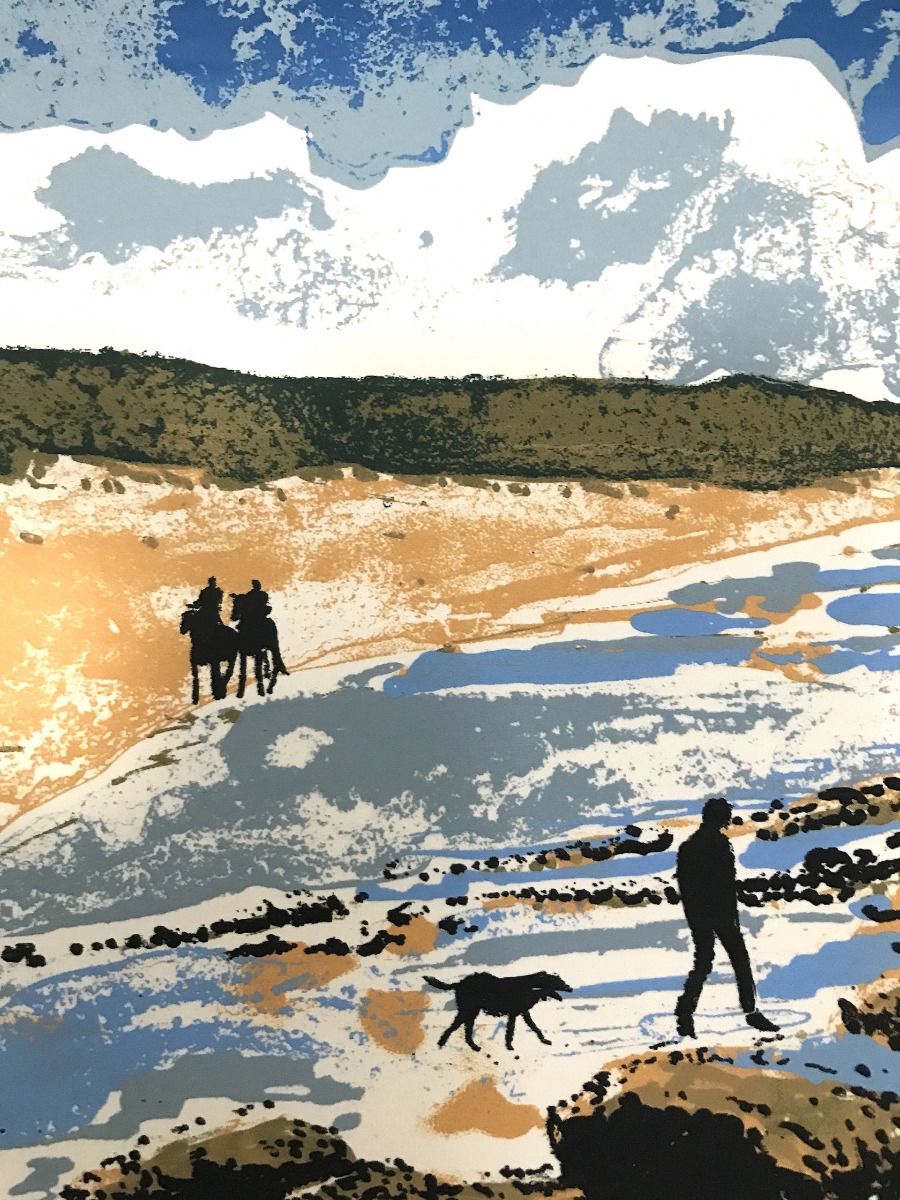 A Walk on the Beach' is a snap-shot of bright and breezy day at the beach. This fresh and evocative print captures the bright light of summer on the coast where one can almost smell the salt in the air. This 7 colour silkscreen is made on a heavyweight 300 gram