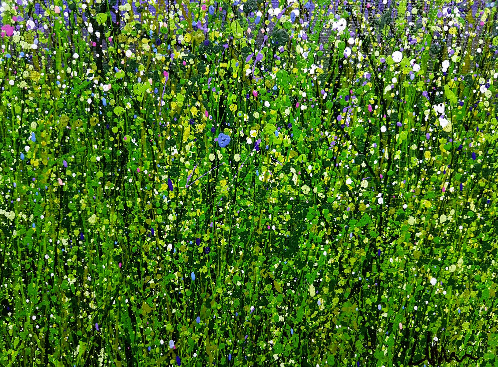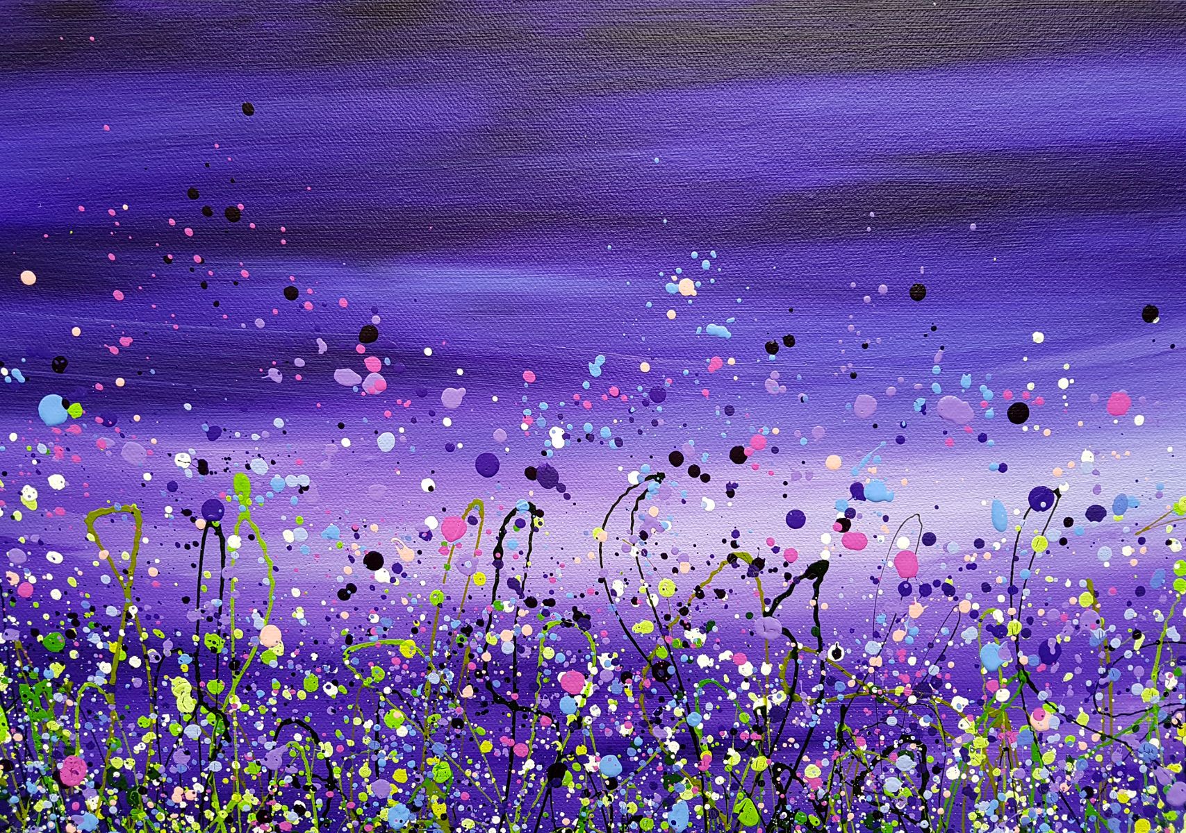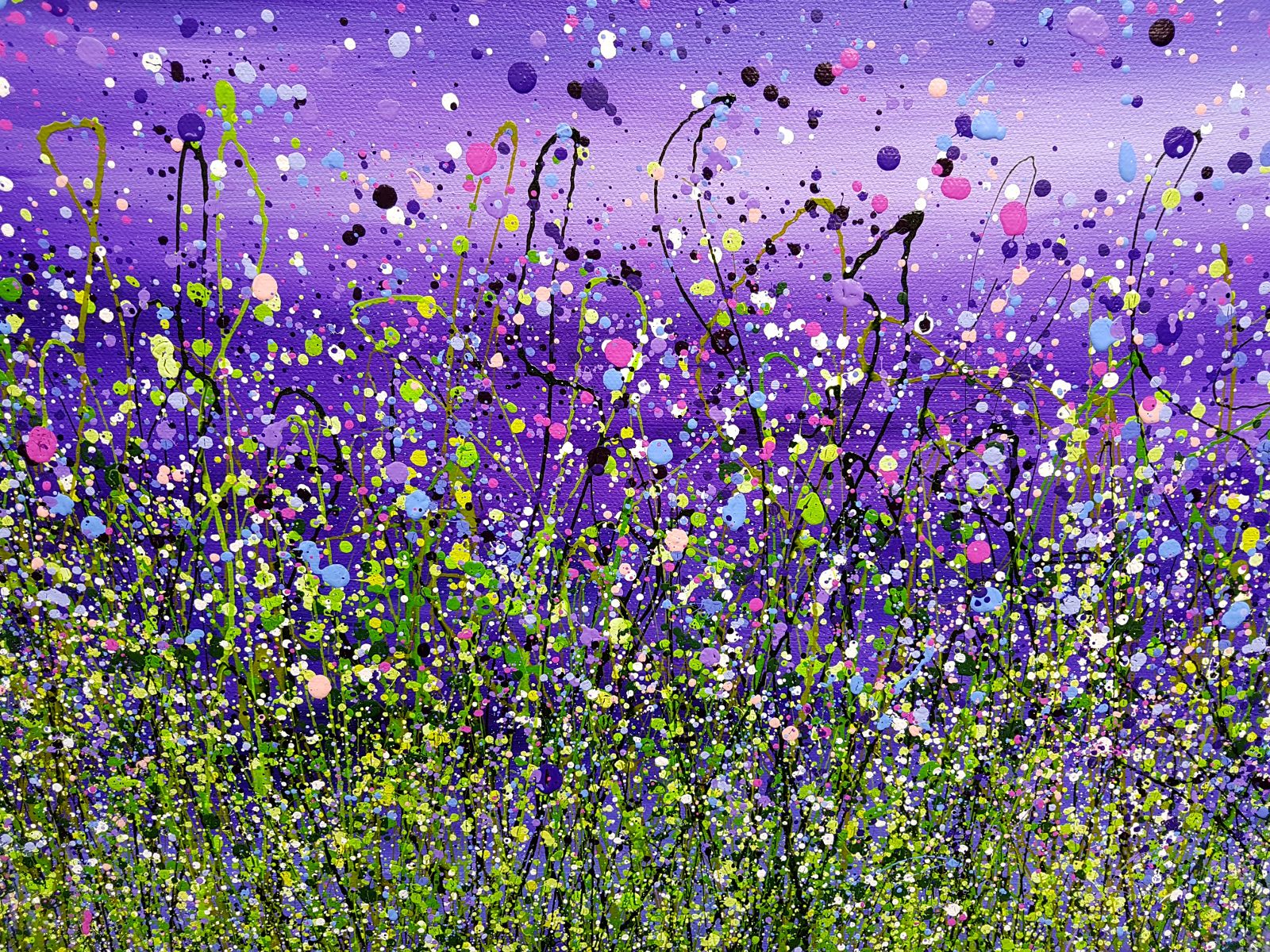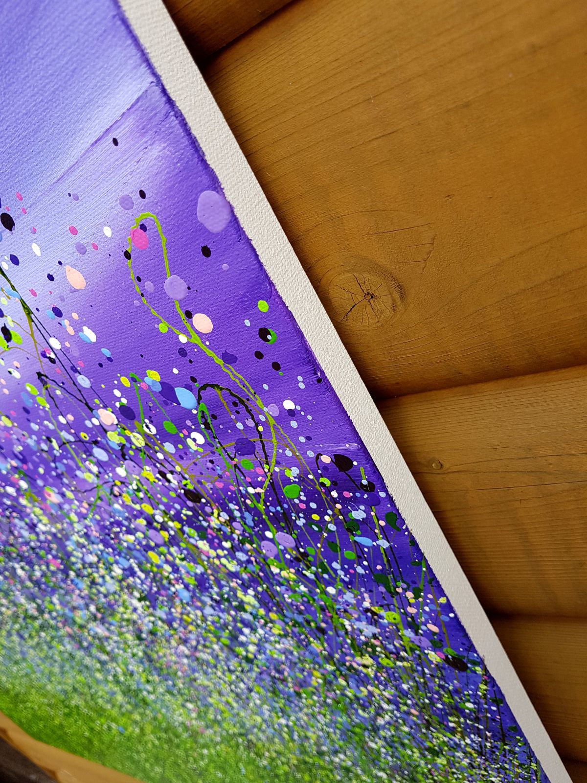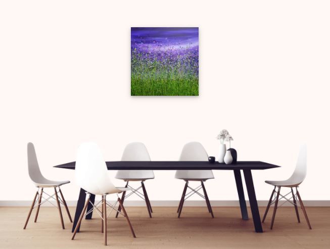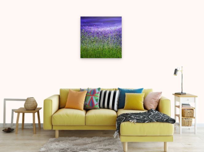Amethyst Dream 3 is an original semi-abstract painting by Lucy Moore. Using her signature string grass technique Lucy has created an early morning view of her classic meadow paintings. With an abstract twist I’ve created a vibrant statement meadow. This piece would brighten any home or office, bring a little