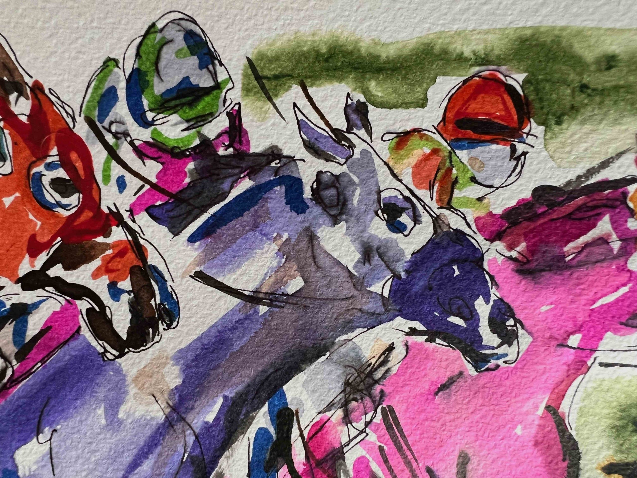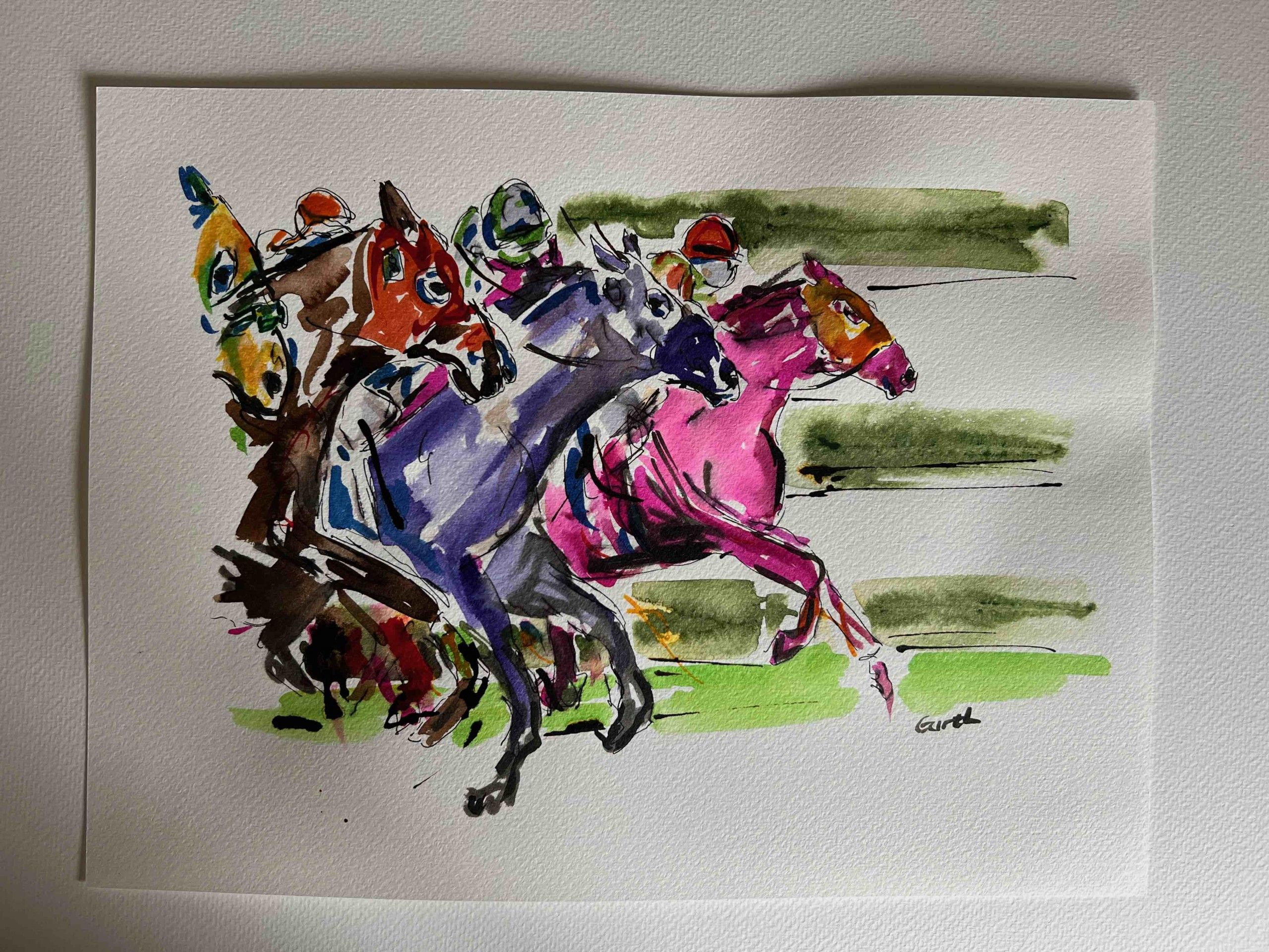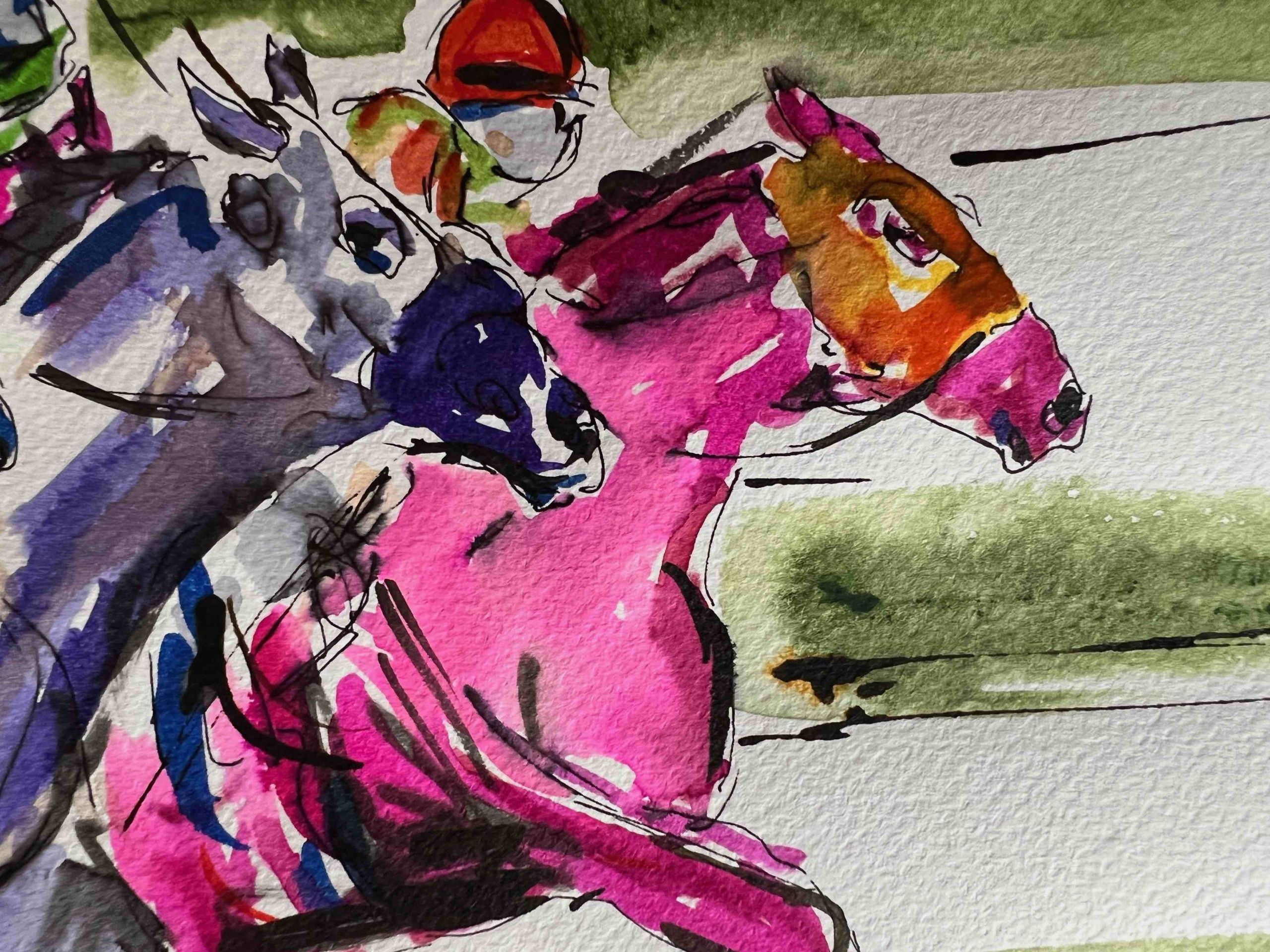 Garth Bayley Across the Line -Horses Racing Original pen and ink painting on watercolour paper Pen and ink on paper Image size: H24 cm x W32 cm x D 0.1cm Sold Unframed Please note that in situ images are purely an indication of how a piece may look. Red Rumps -Horses Racing an original painting by