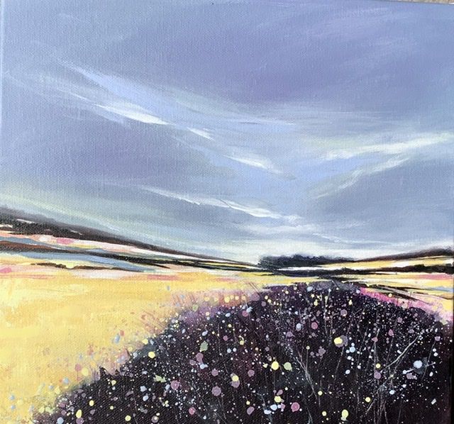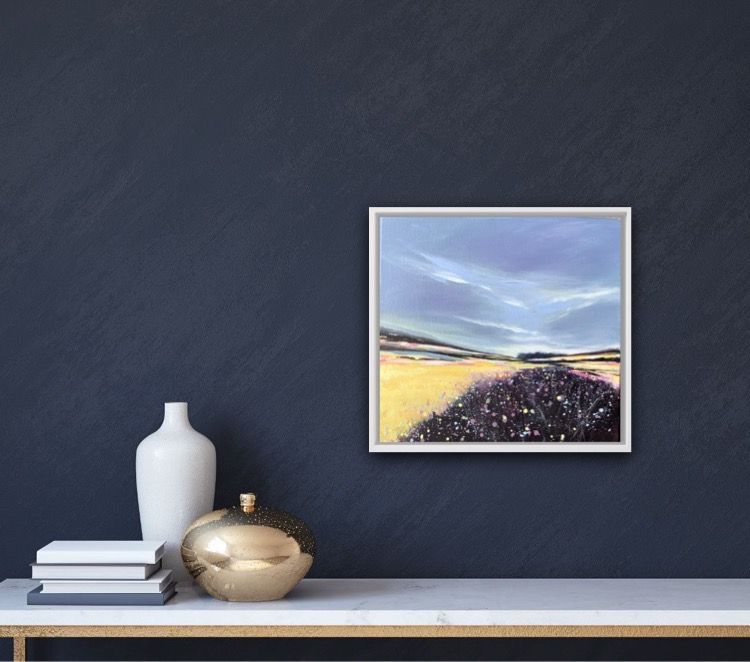 Adele Riley I Can Hear the Sea Original Landscape Painting Acrylic Paint and Ink on Boxed Canvas Canvas Size: H 30cm x W 30cm D 5cm Framed Size: H 35cm x W 35cm x D 5.5cm Sold Framed in a White Oak Float Frame I can hear the sea, is an original contemporary landscape painting by Adele