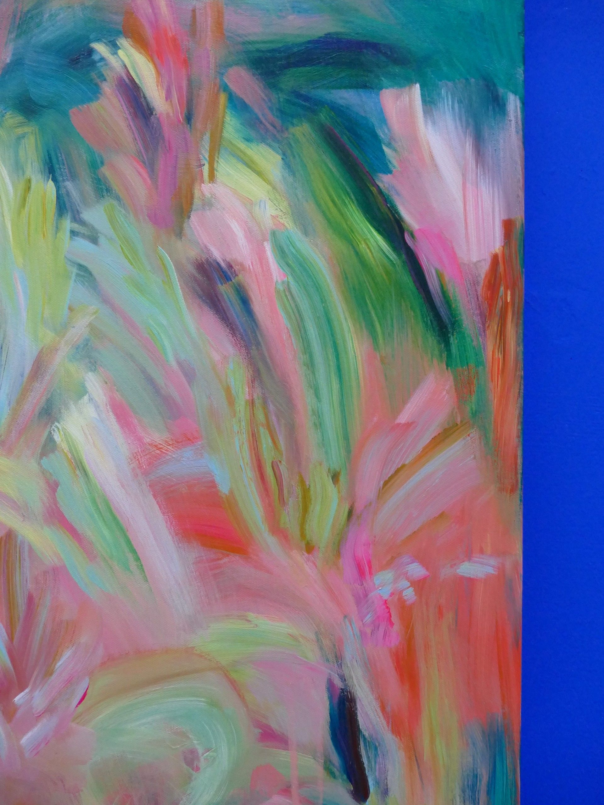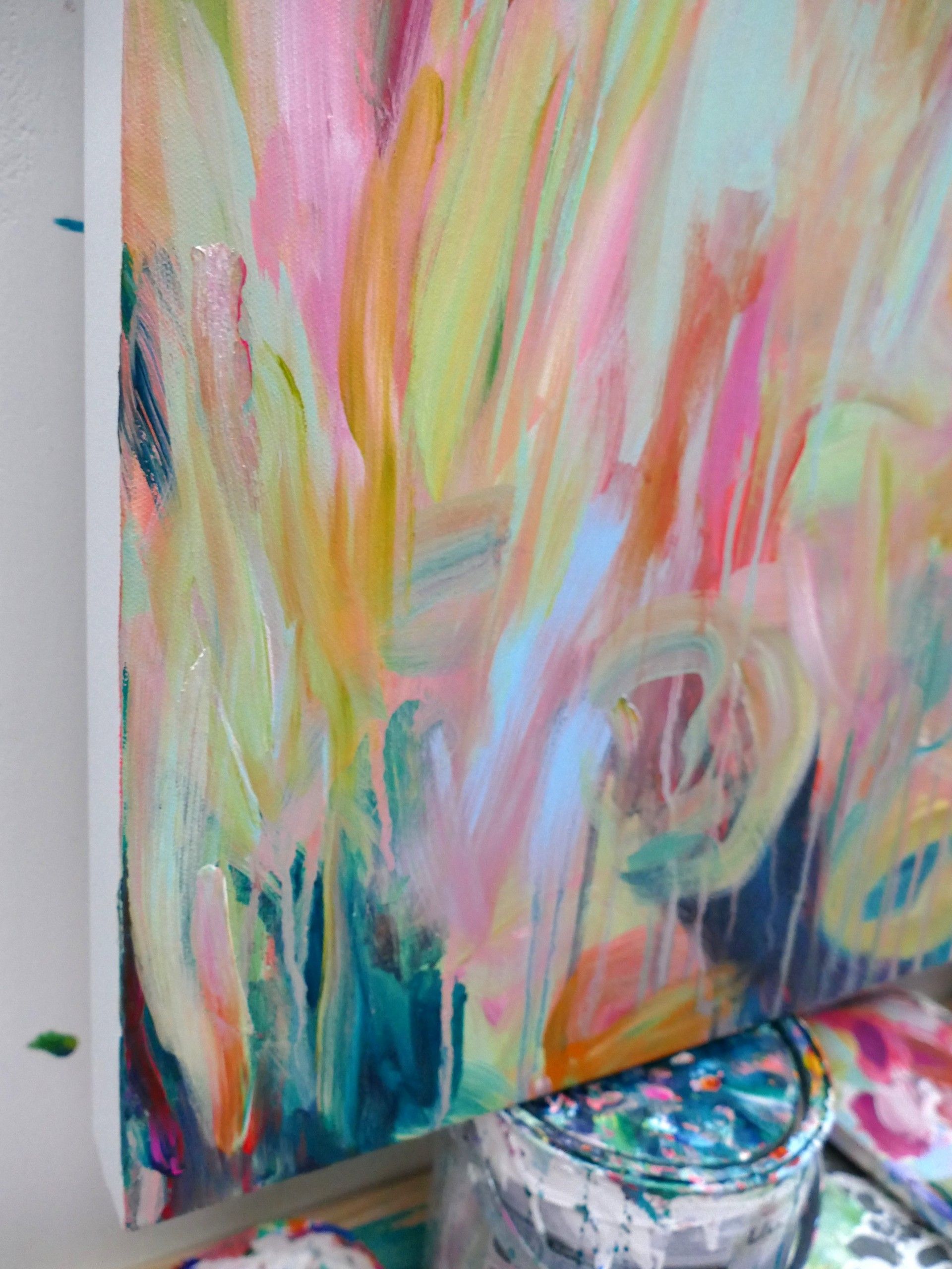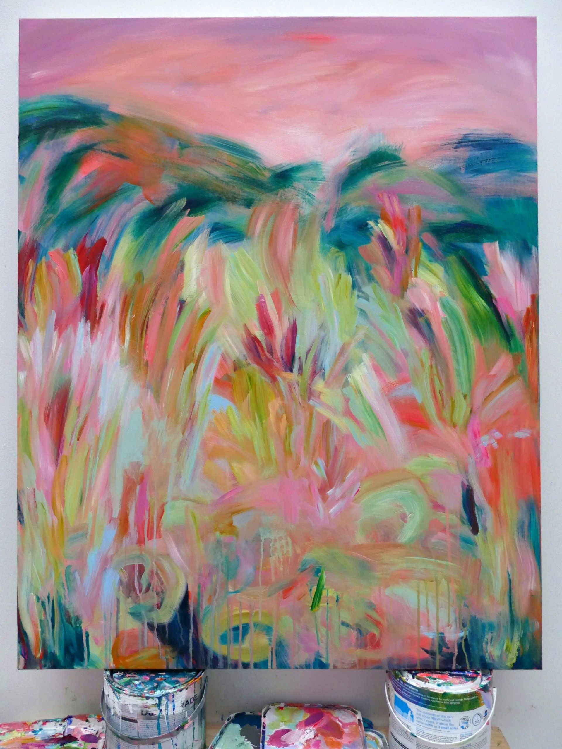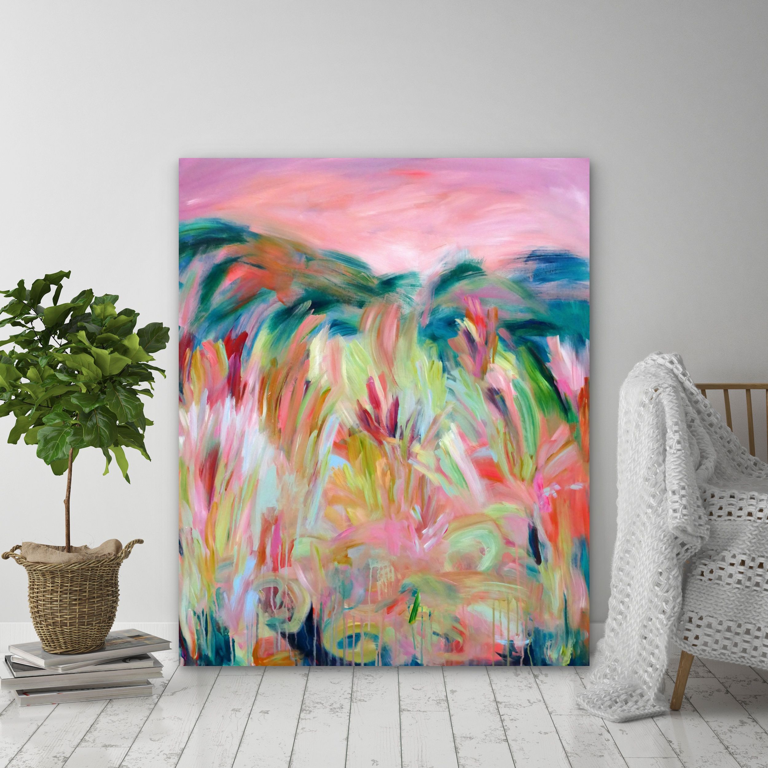Hope and Dreams is an original abstract Landscape painting by Alanna Eakin. The painting is inspired by the saturated colours of the USA desert and is part of an ongoing series. Gestural brushstrokes give suggestions of plants and mountains. The painting as a matt UV varnish protection.