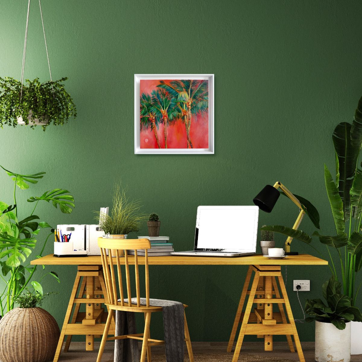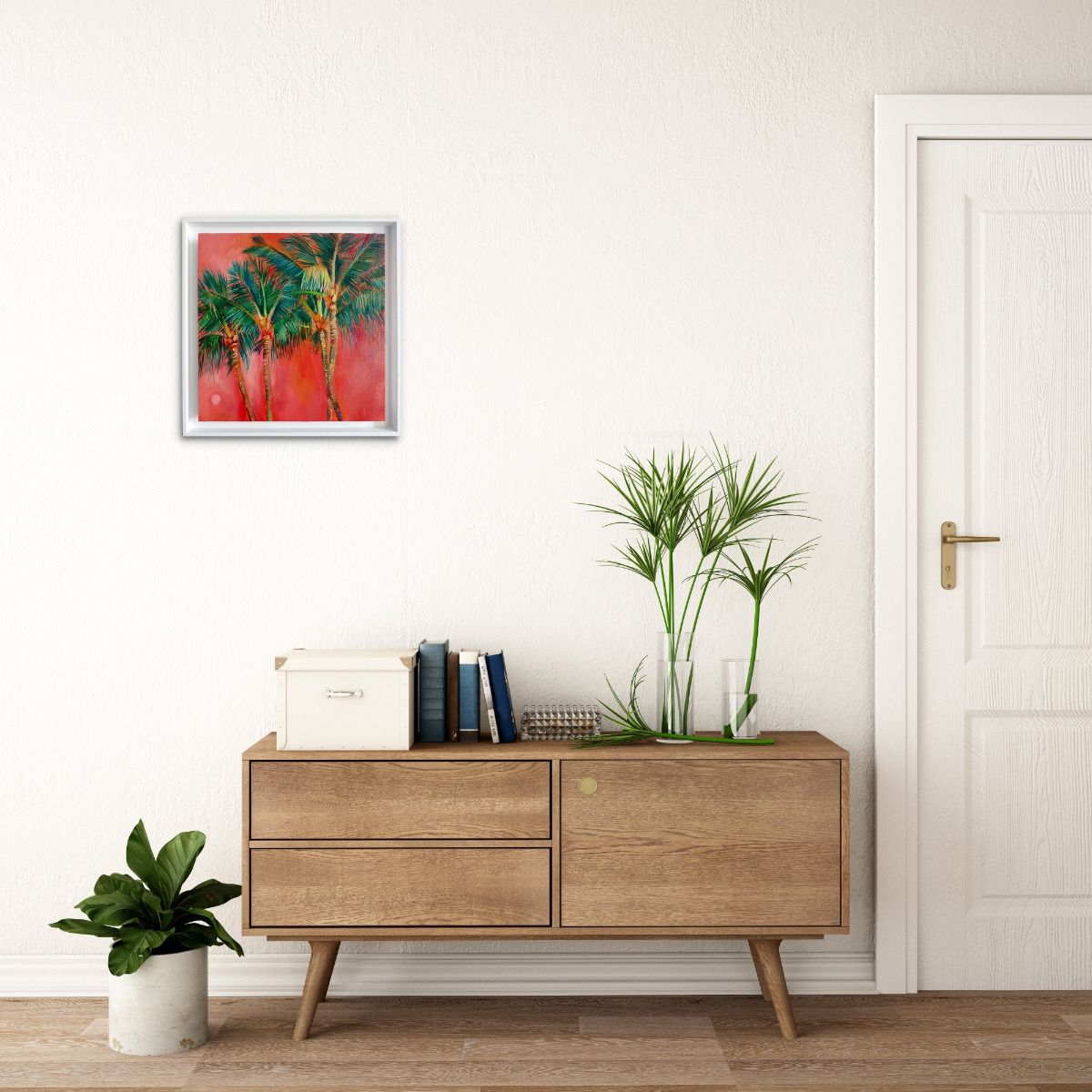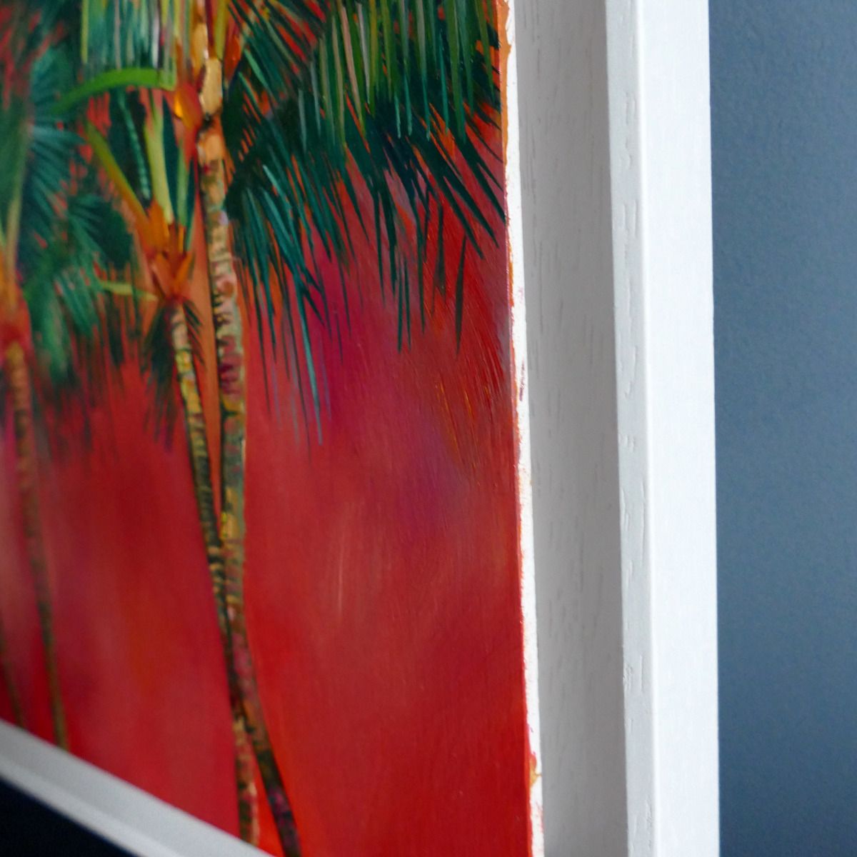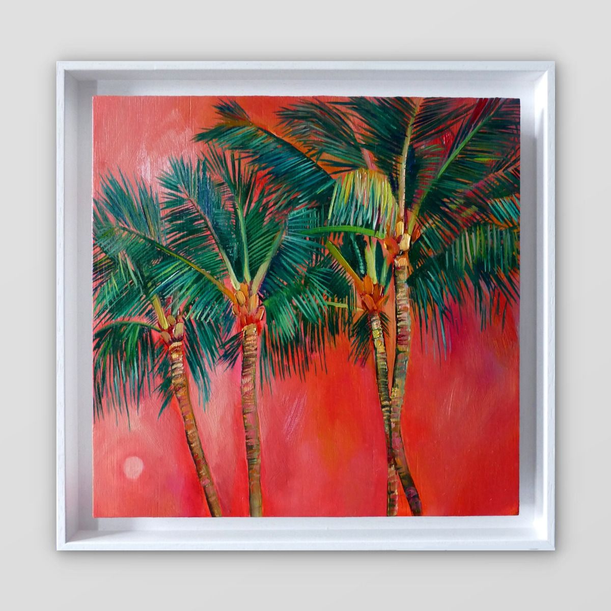 From a series of palm tree paintings featuring palm trees from around the globe high up in the sky. The series began during the first lockdown when we were all dreaming of varied scenery from around the world. Each of the pieces are named after beaches, cities or towns. Painted