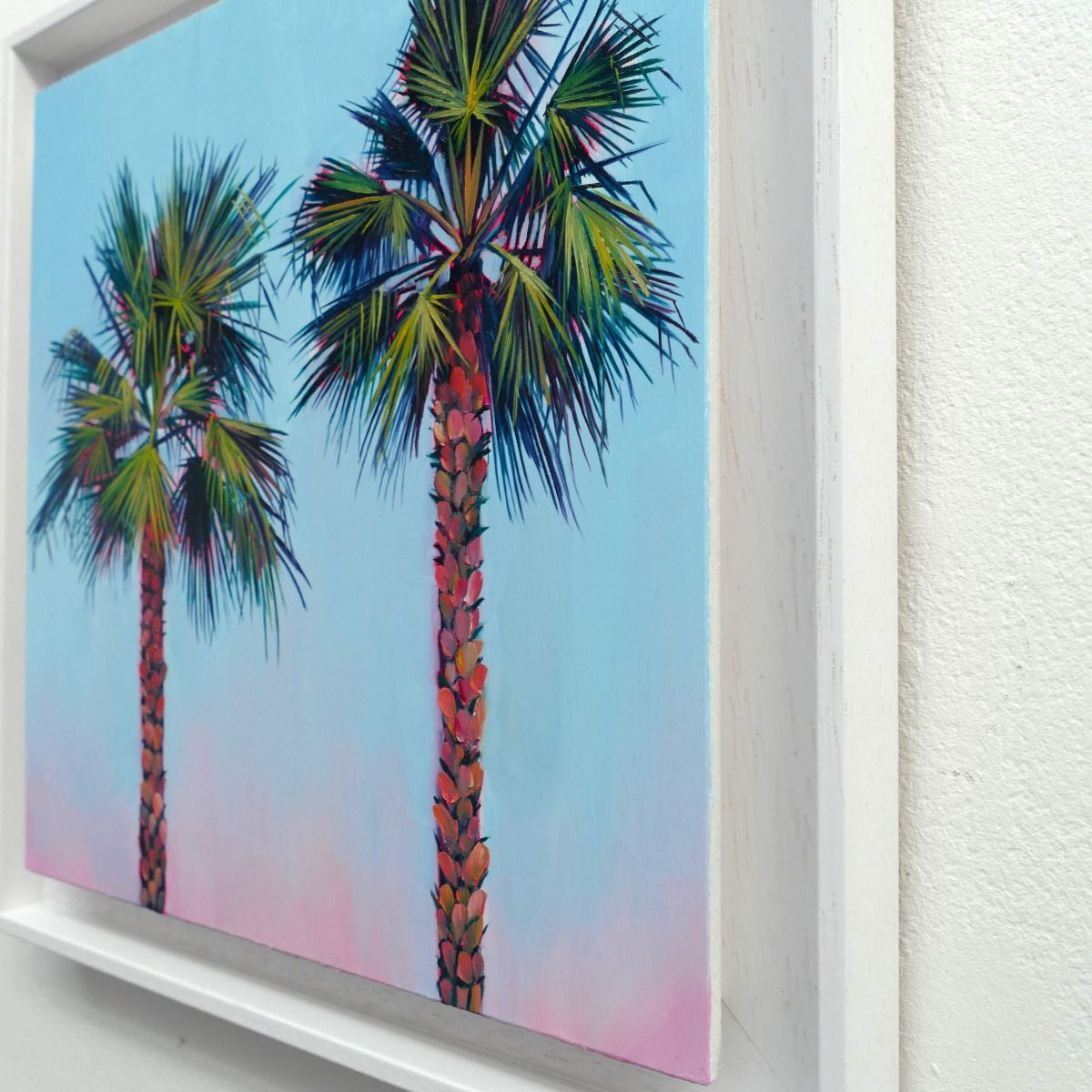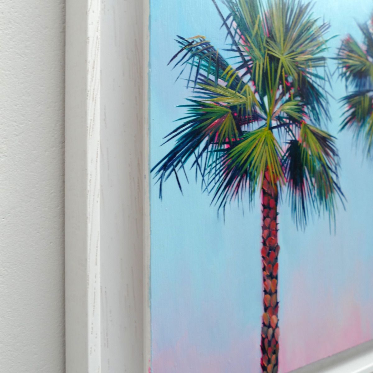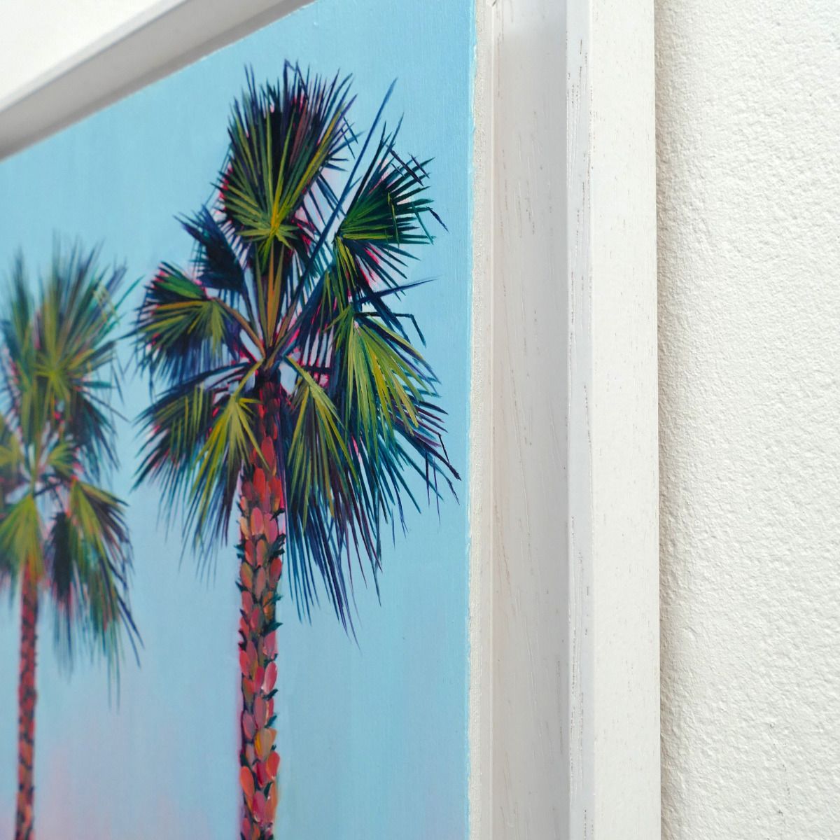 Inspired by all the places we wish we were. The artist paints expressively and with lots of colour. Oil paint on gesso wood panel. Framed in a white wooden painted frame. Ready to hang