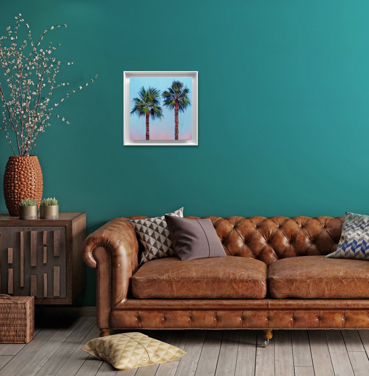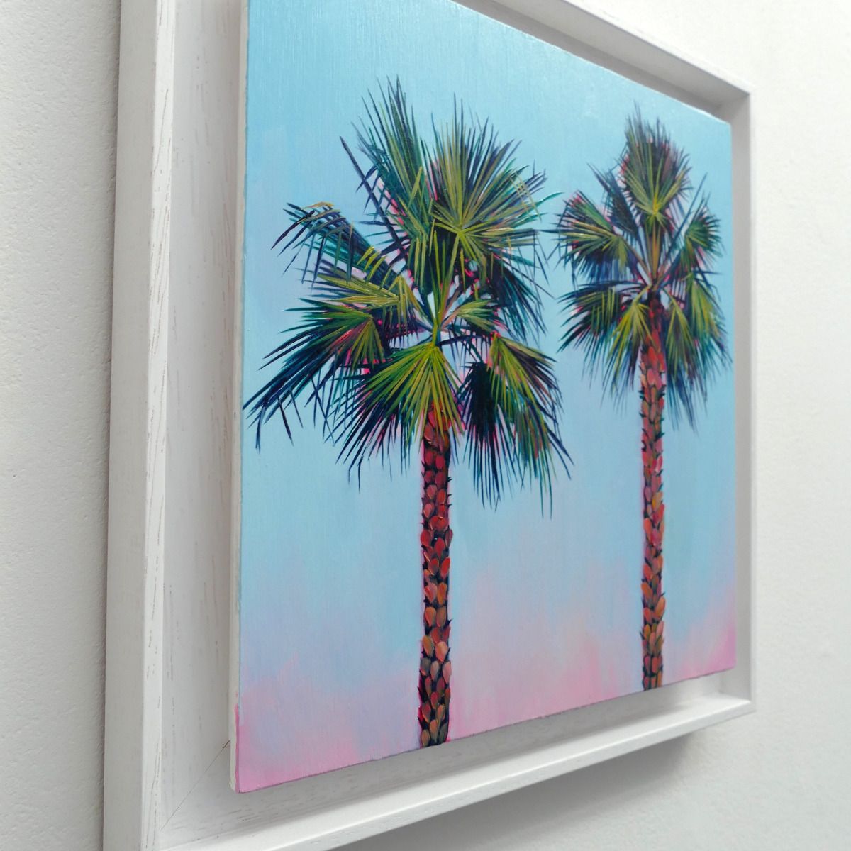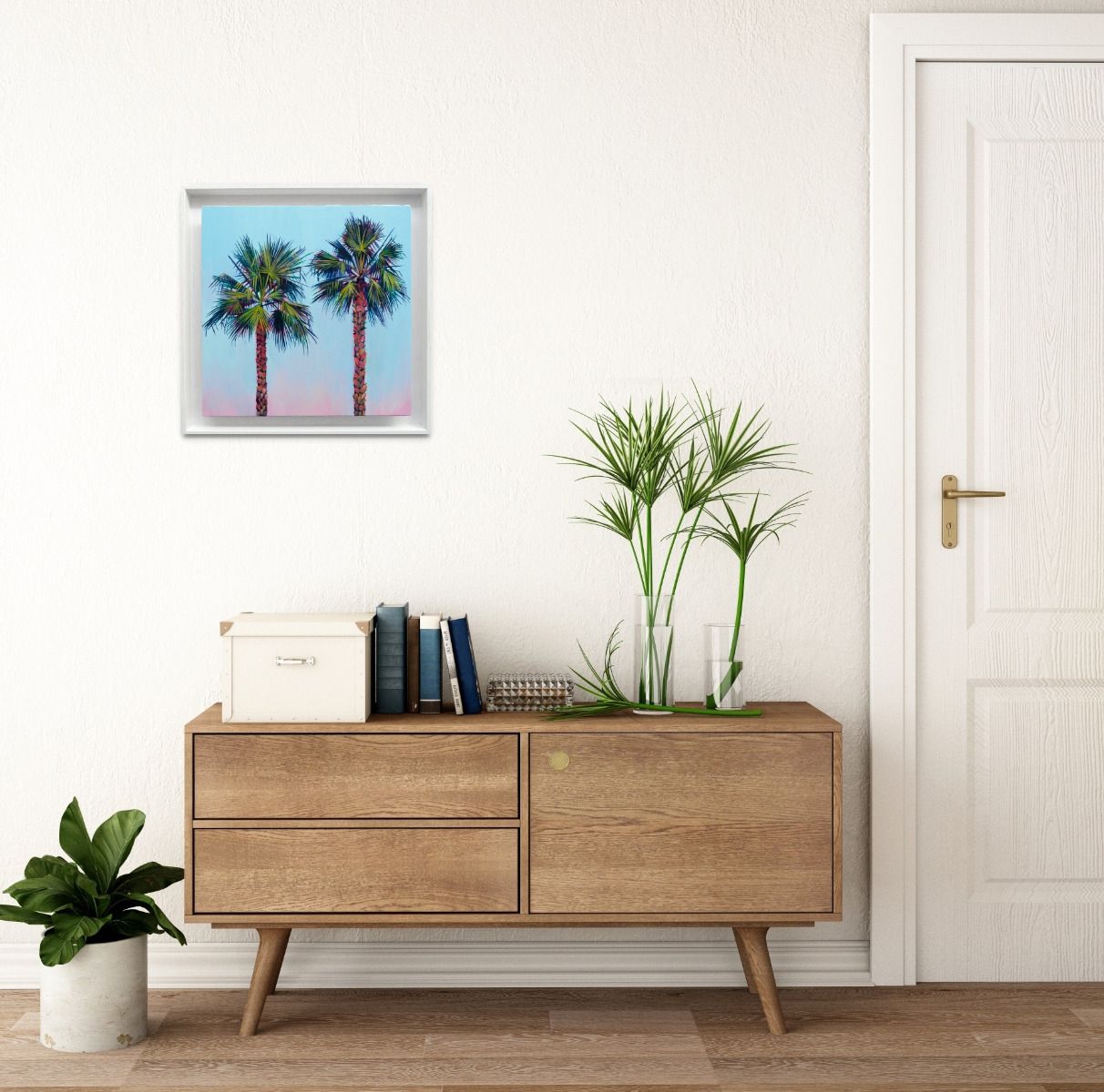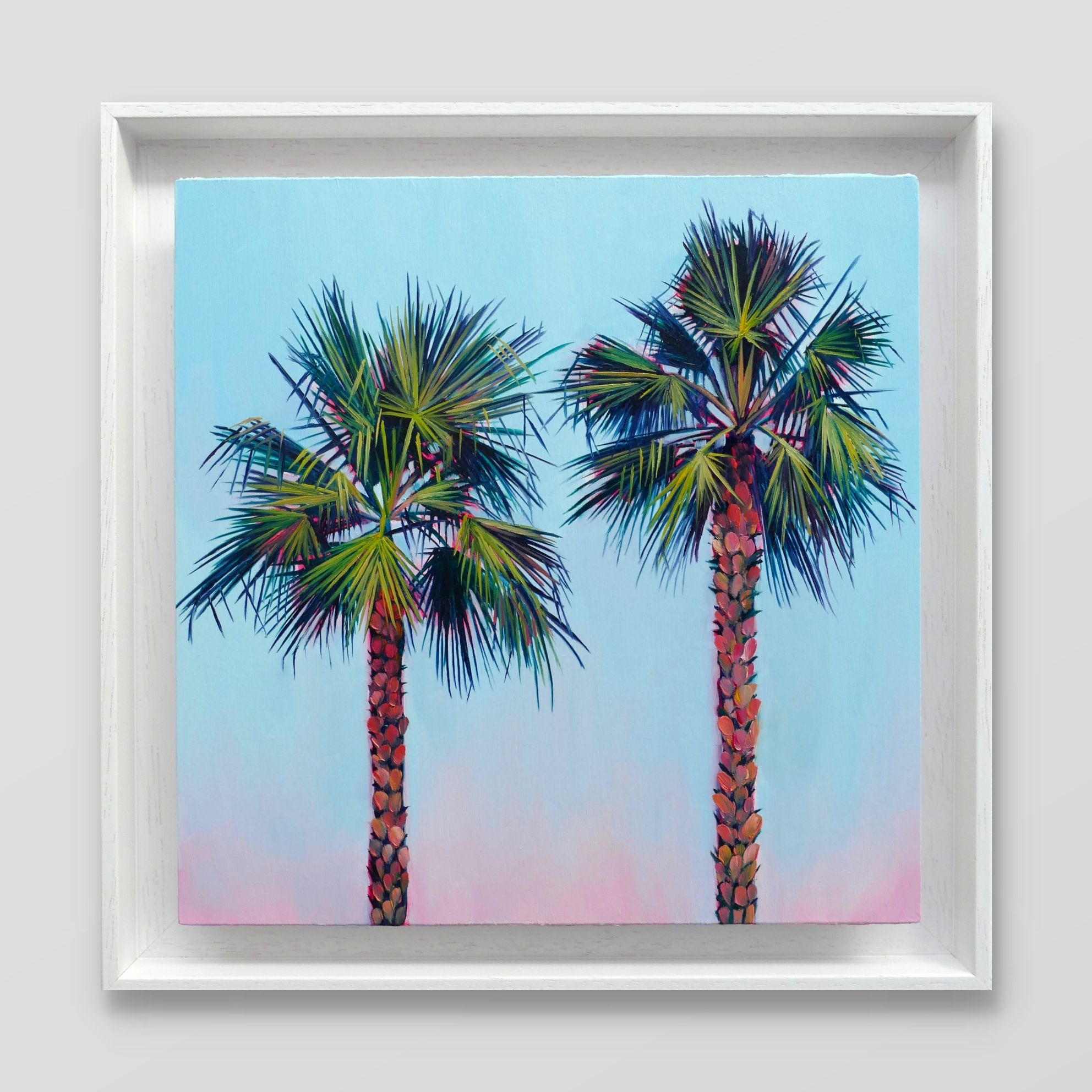 Inspired by all the places we wish we were. The artist paints expressively and with lots of colour. Oil paint on gesso wood panel. Framed in a white wooden painted frame. Ready to hang