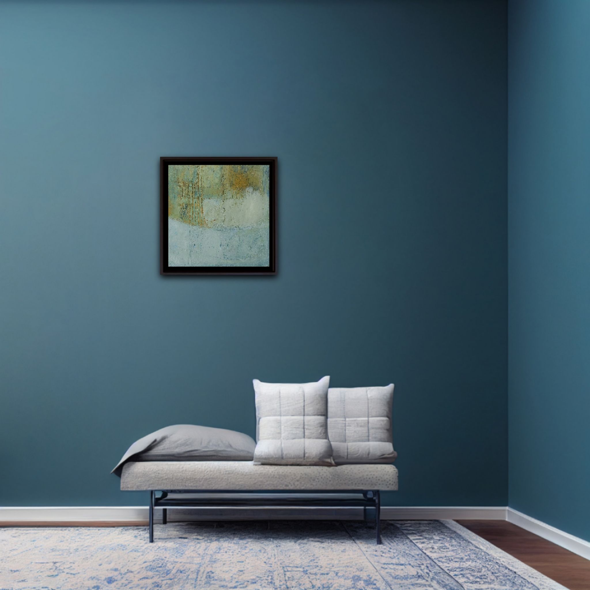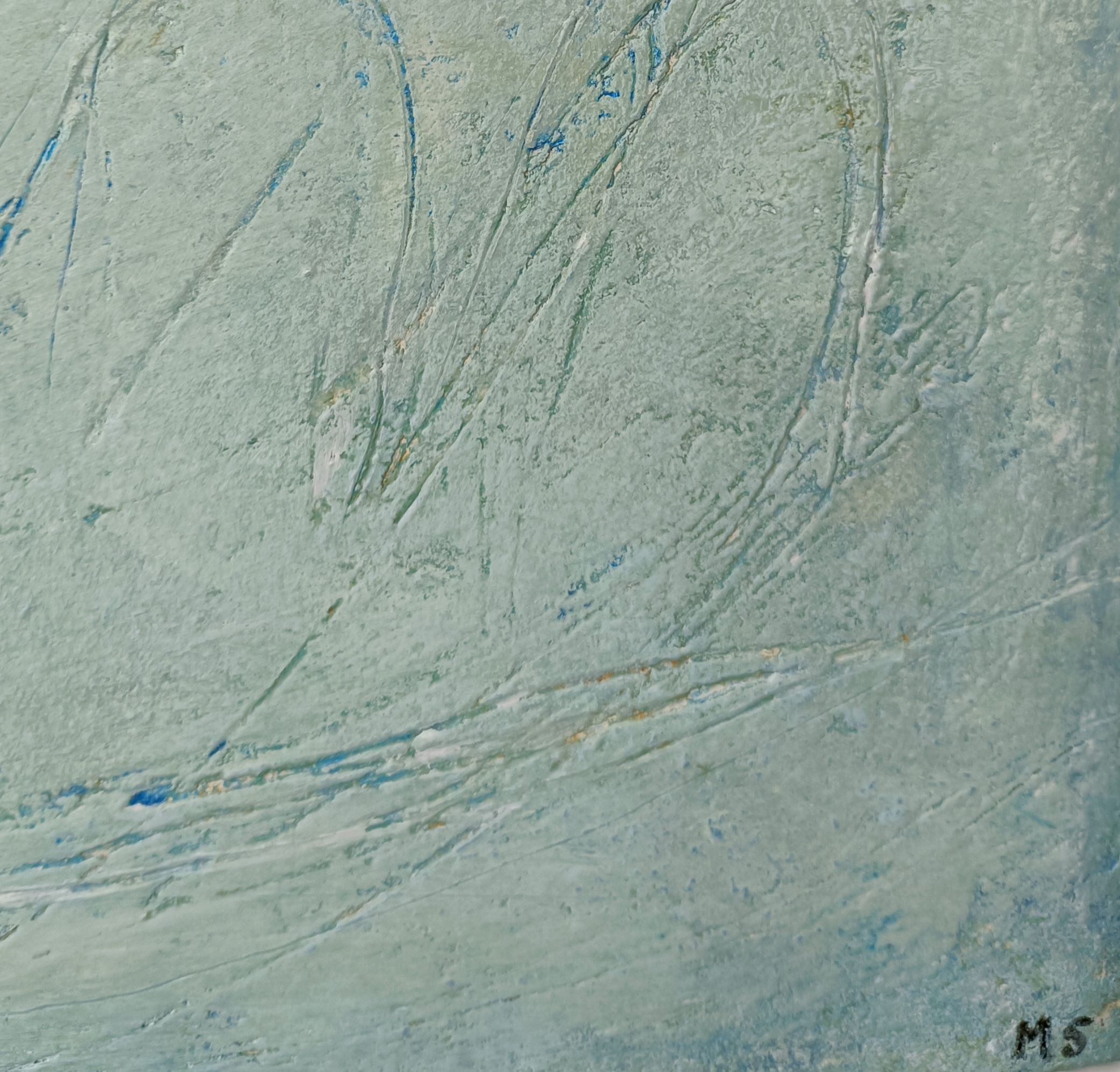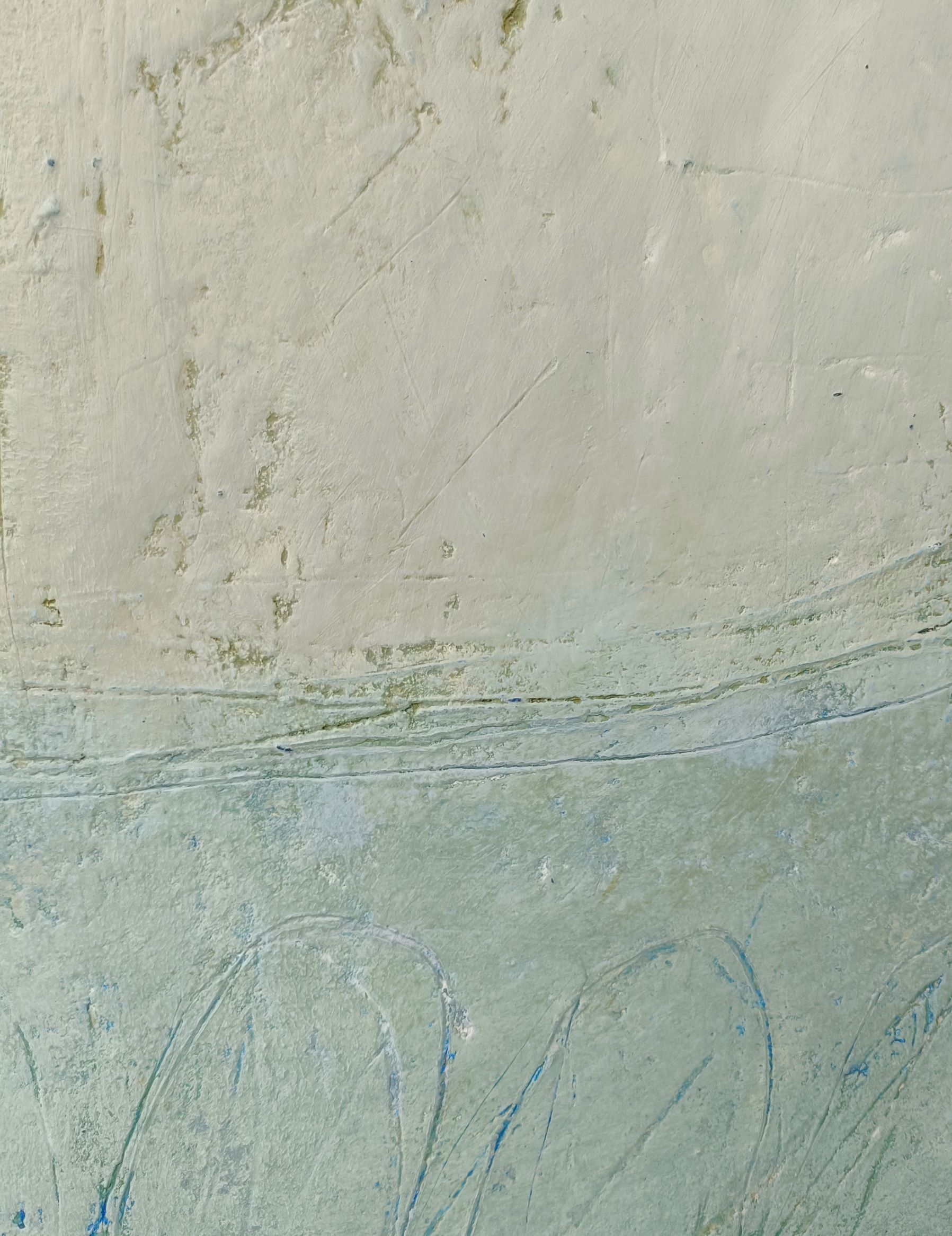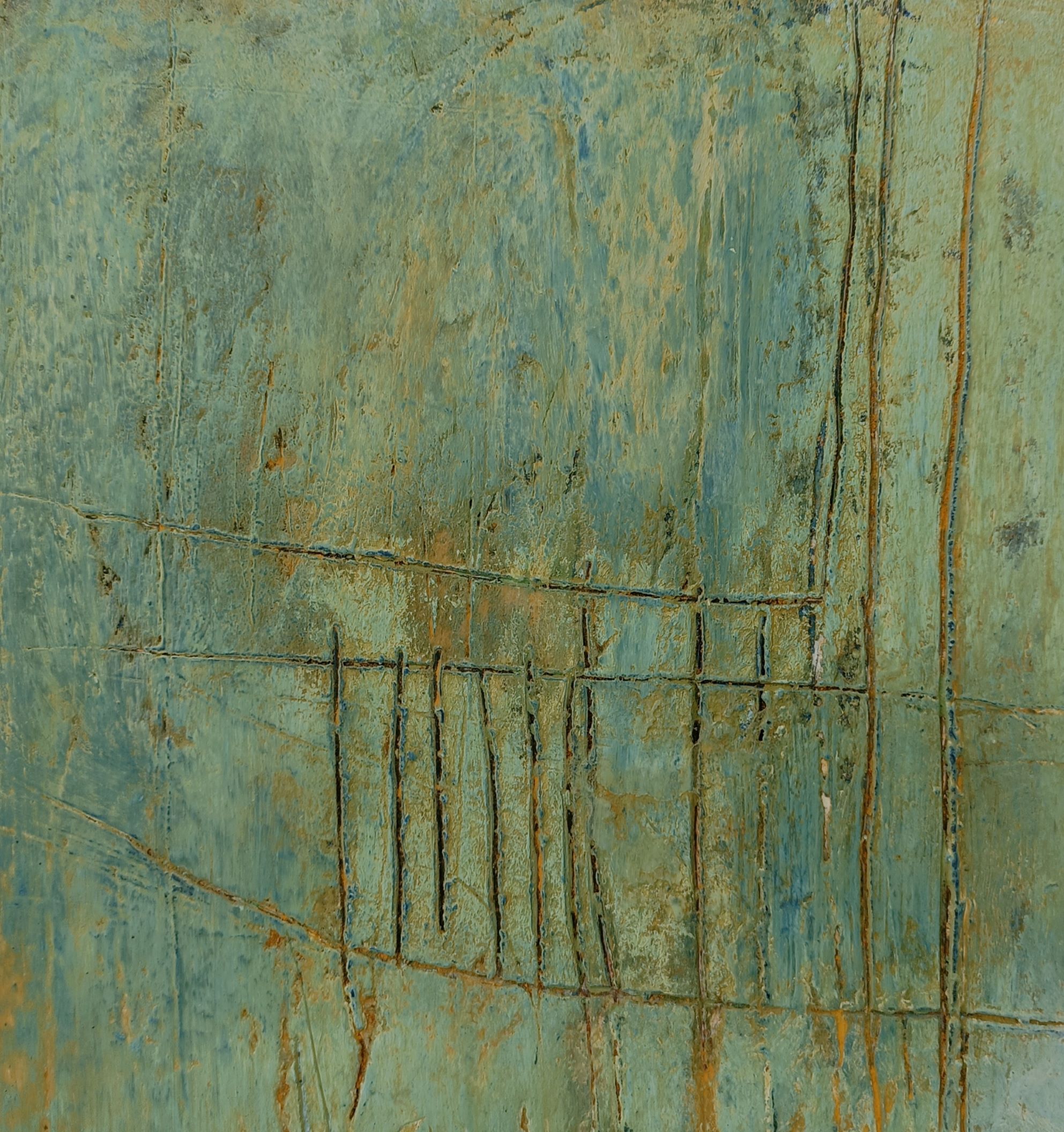 All That Matters is an original work by Mary Scott. In this work, I was concerned with creating an ancient surface, weather-beaten, scale uncertain, just old rock of the beautiful greenish, gold hues one finds on the coast at Gwithian, one of the my favourite stretches of coastline hereabouts in
