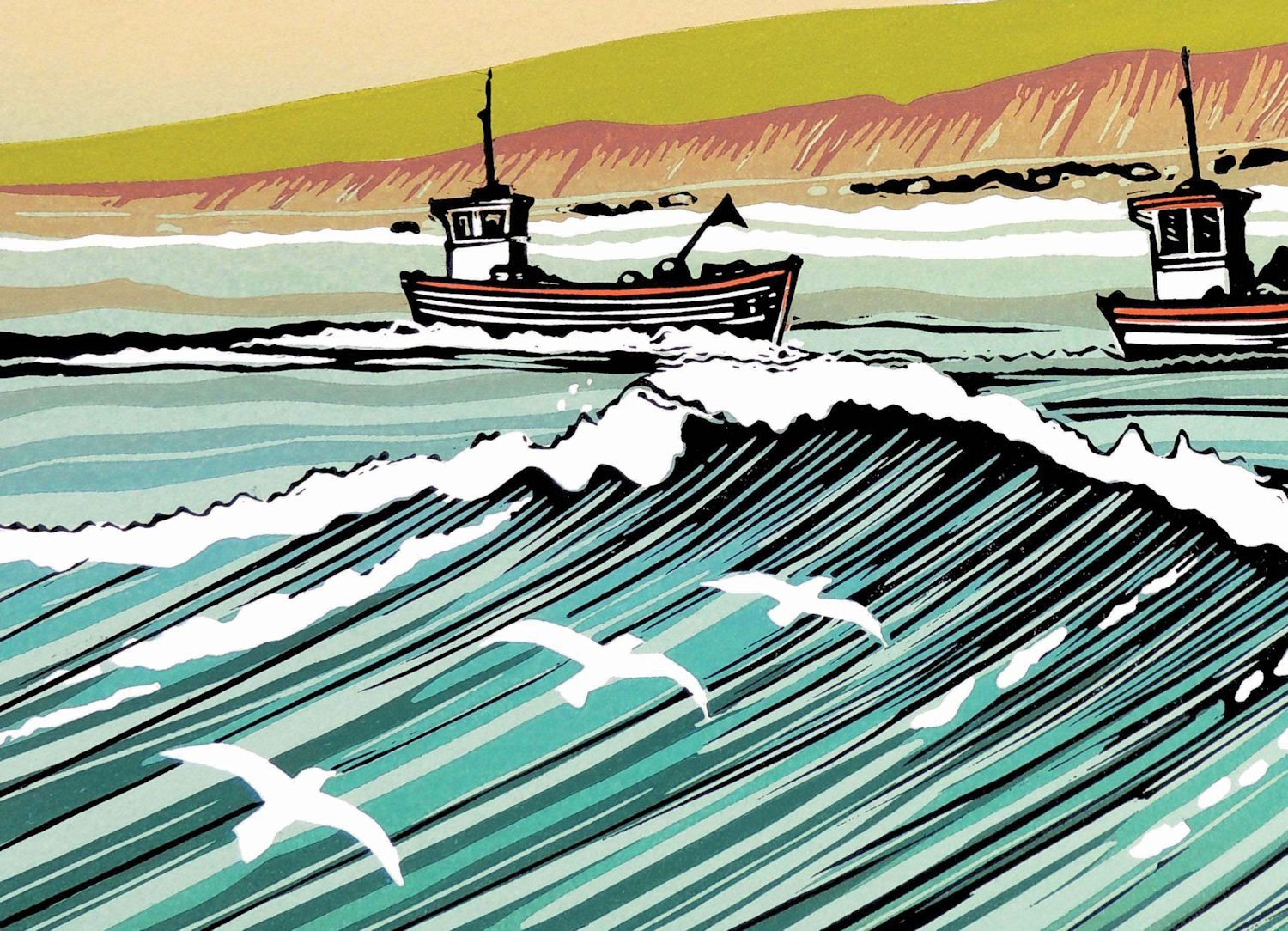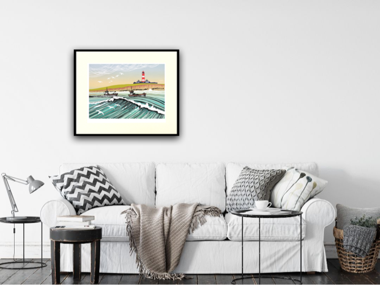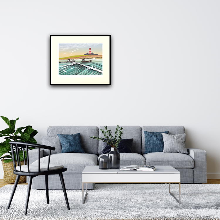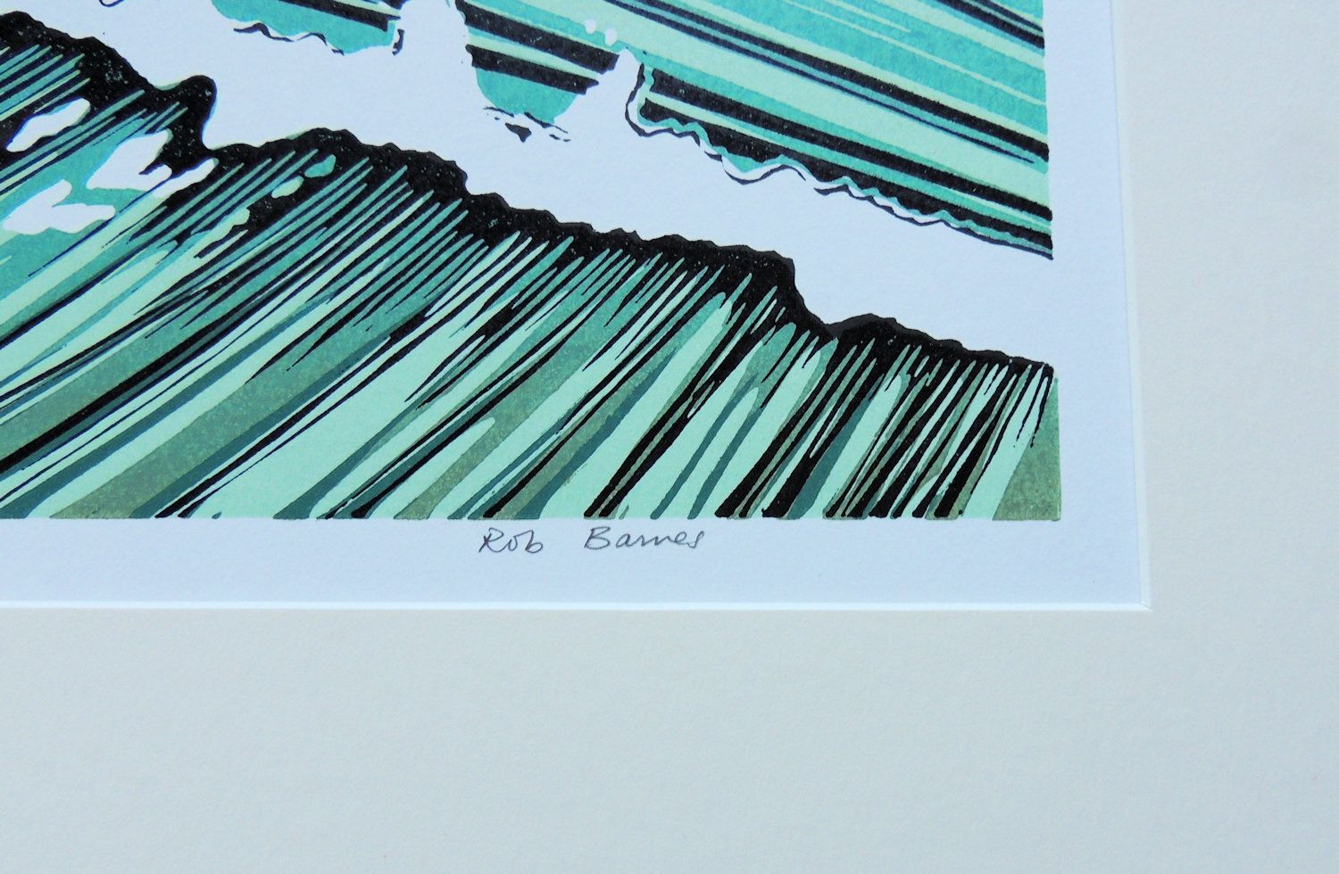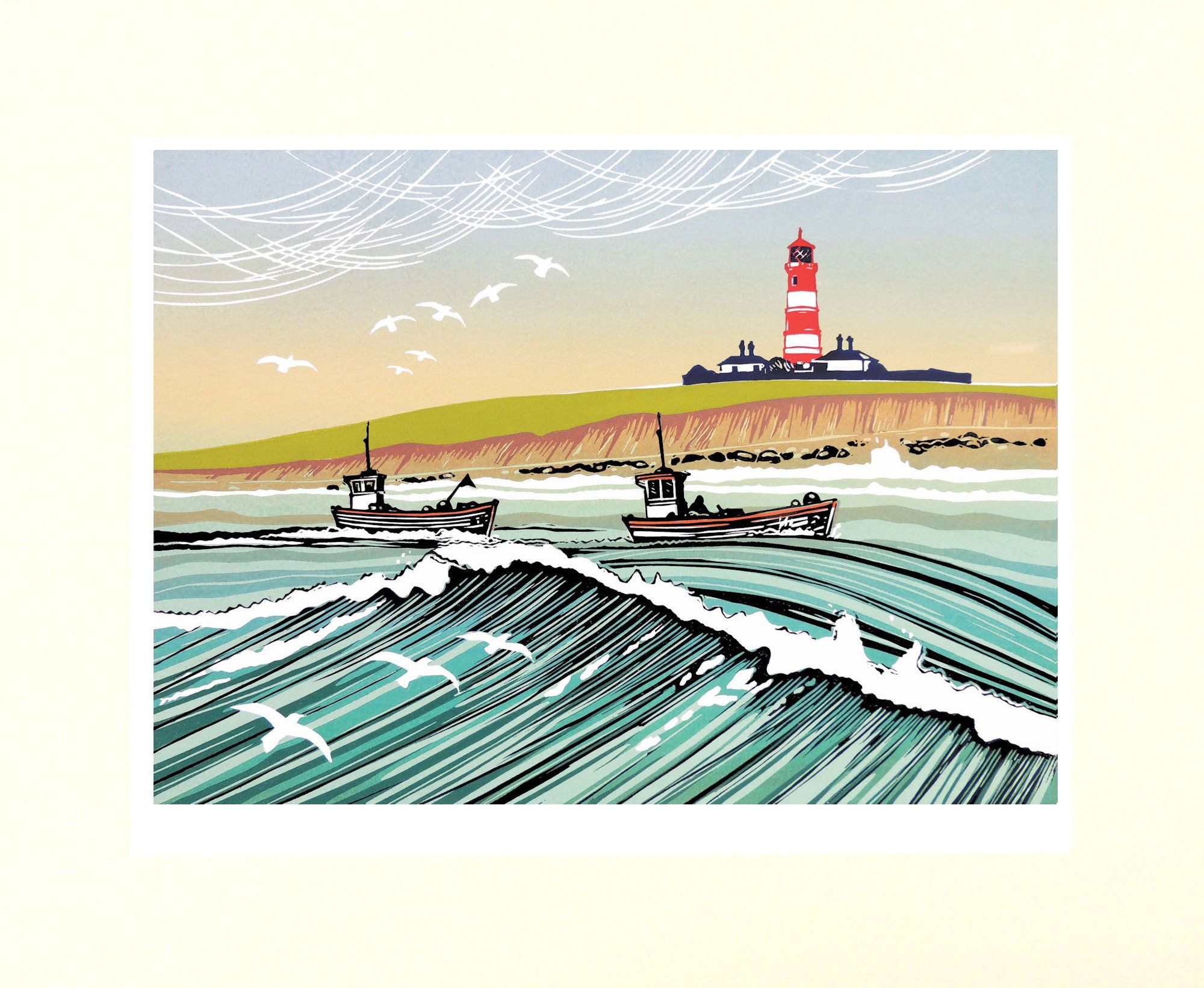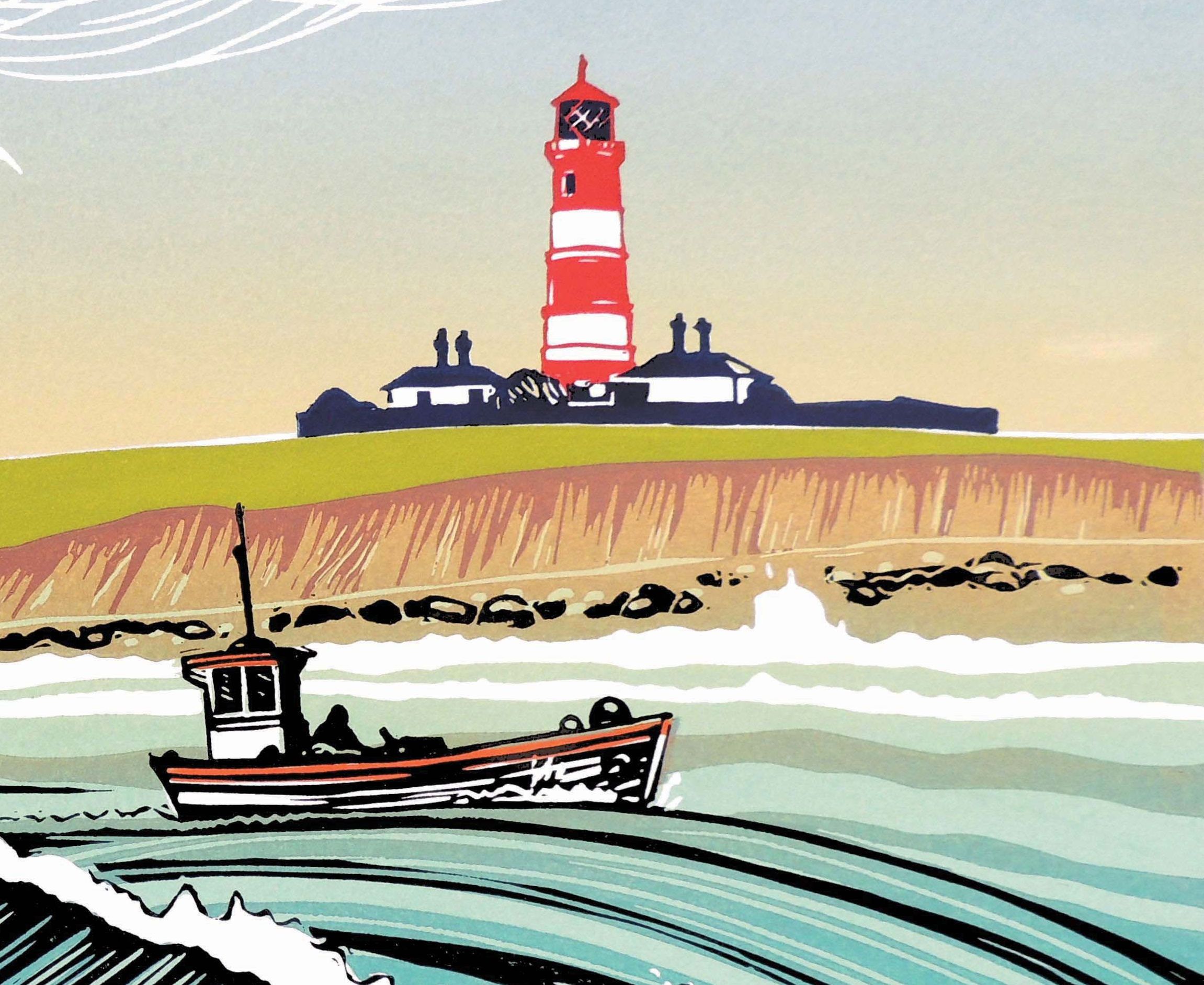 Along the Coast is a limited edition print by Rob Barnes. Edition of 50. This linocut was inspired by being on a fishing boat many years ago, but this time looking towards the lighthouse on the Norfolk Coast. I was inspired by the movement of the waves seen against the long