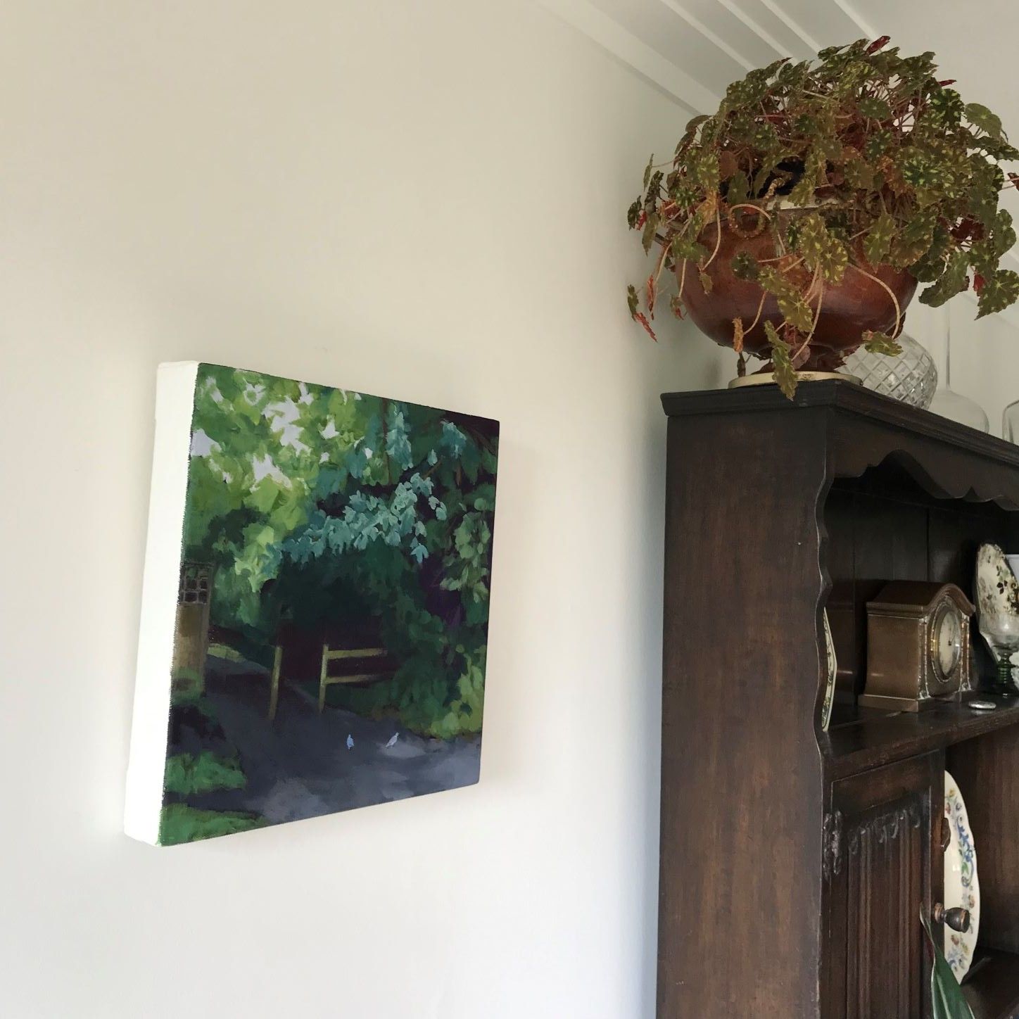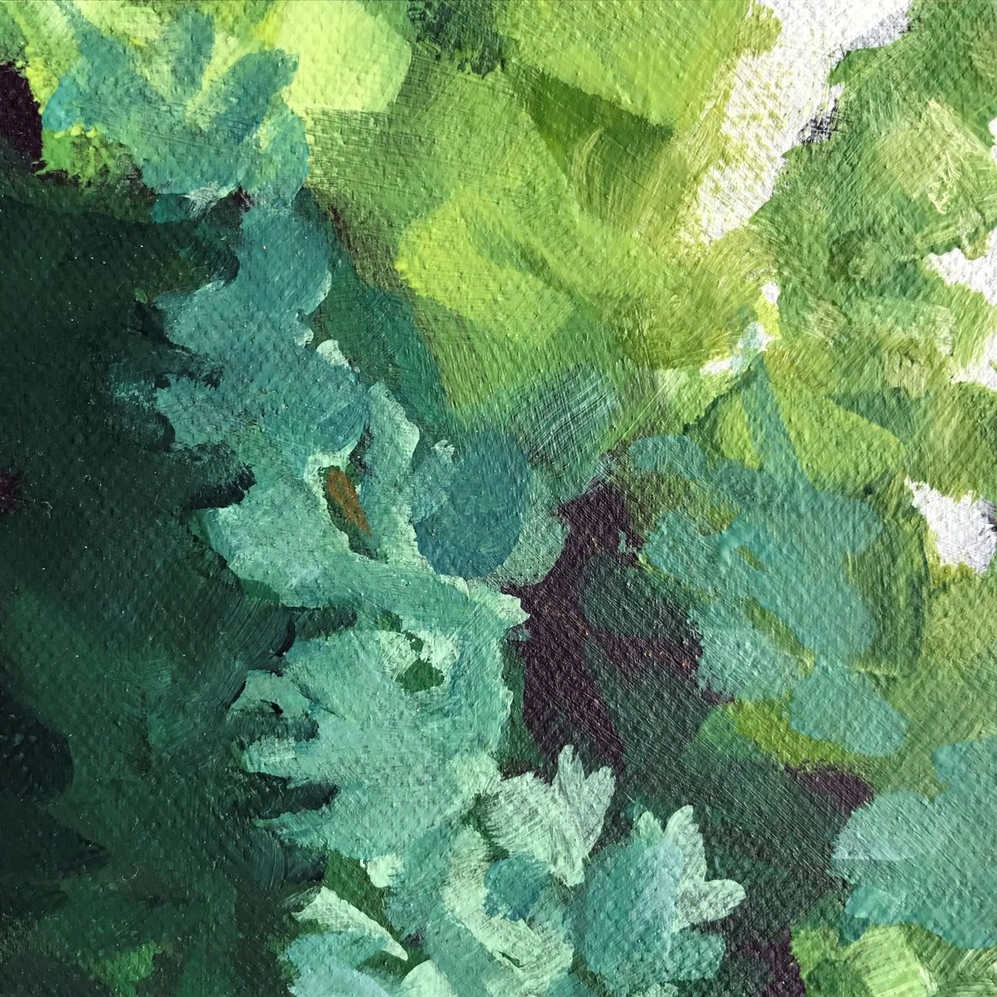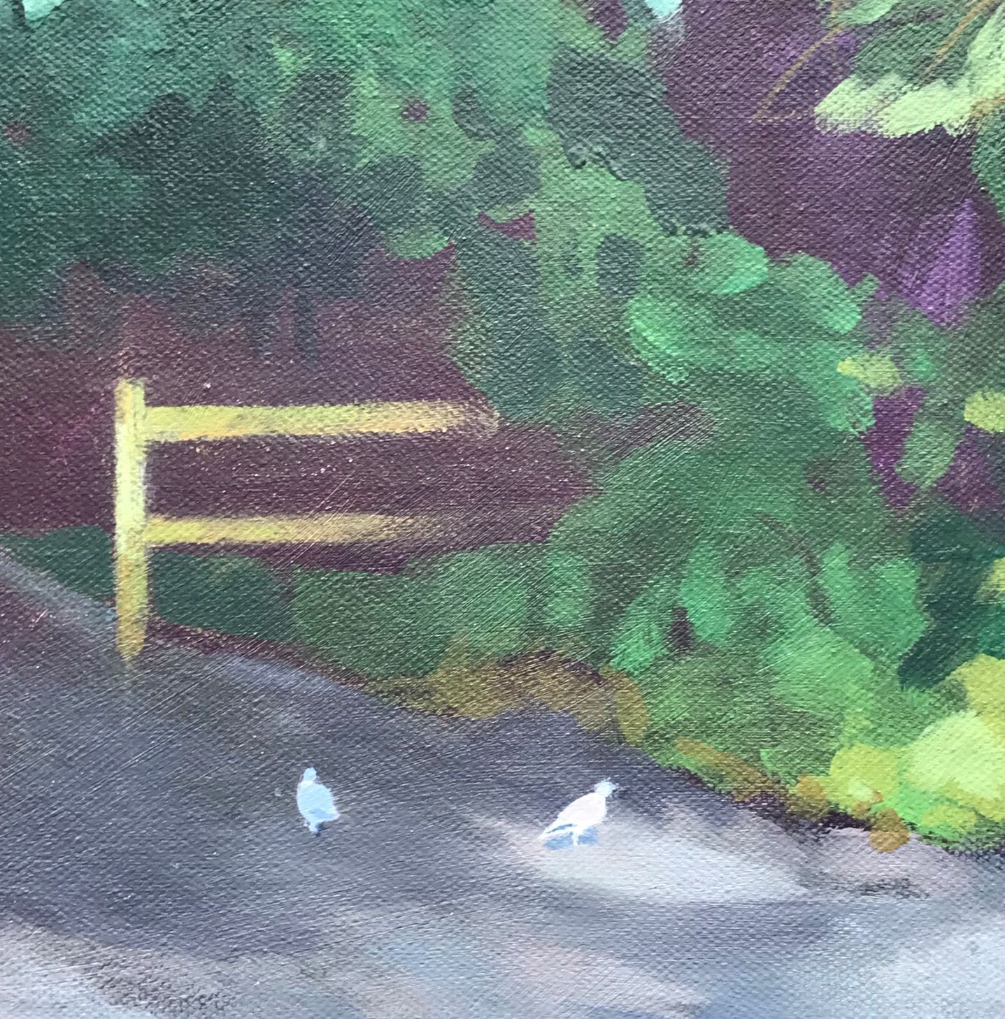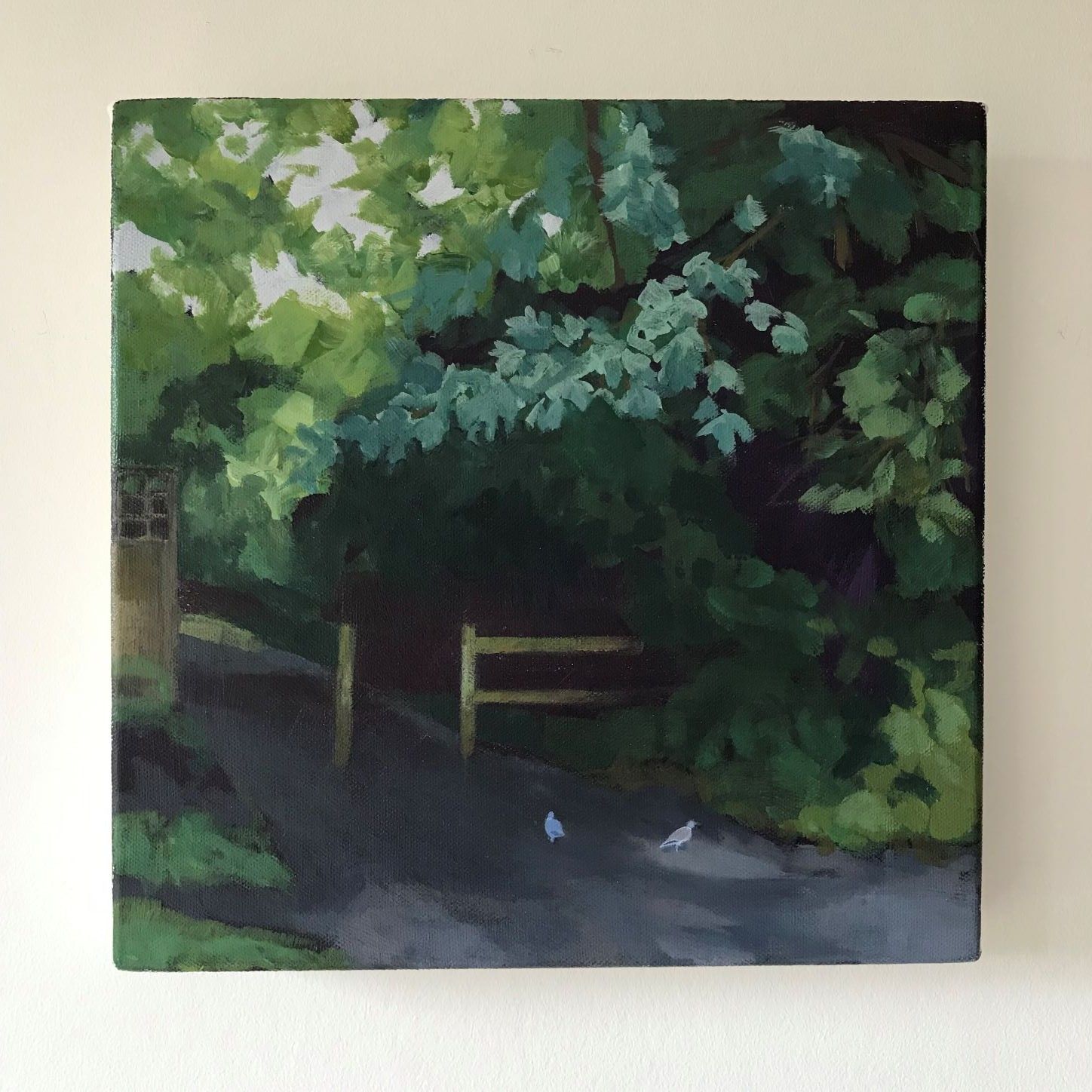 A shaded stretch on the path under the trees will soon emerge into the light again. Are we beginning to see a way out of our troubles? Varied greens and rich dark brush strokes give strong tonal contrast in this acrylic painting on a deep canvas.