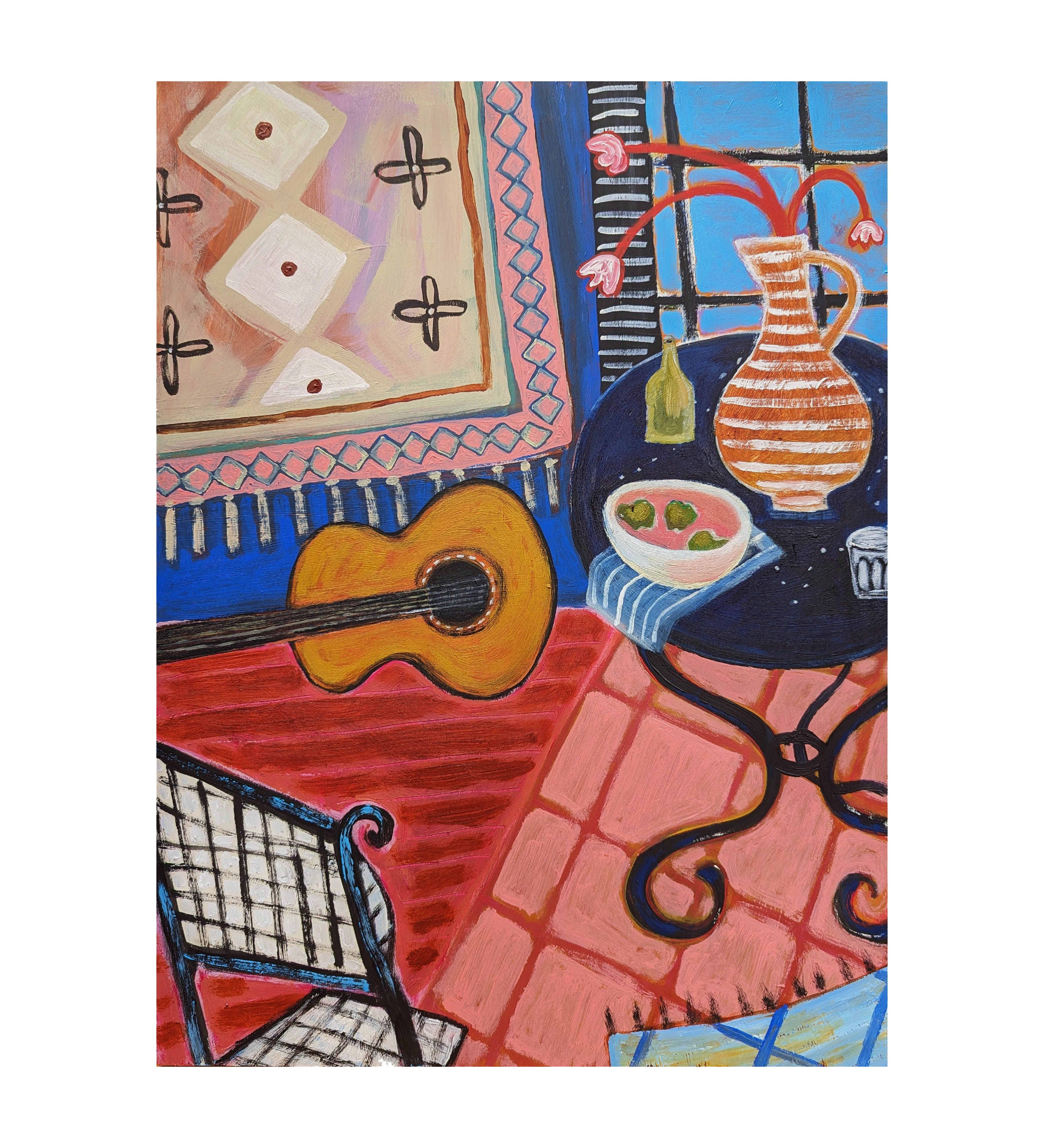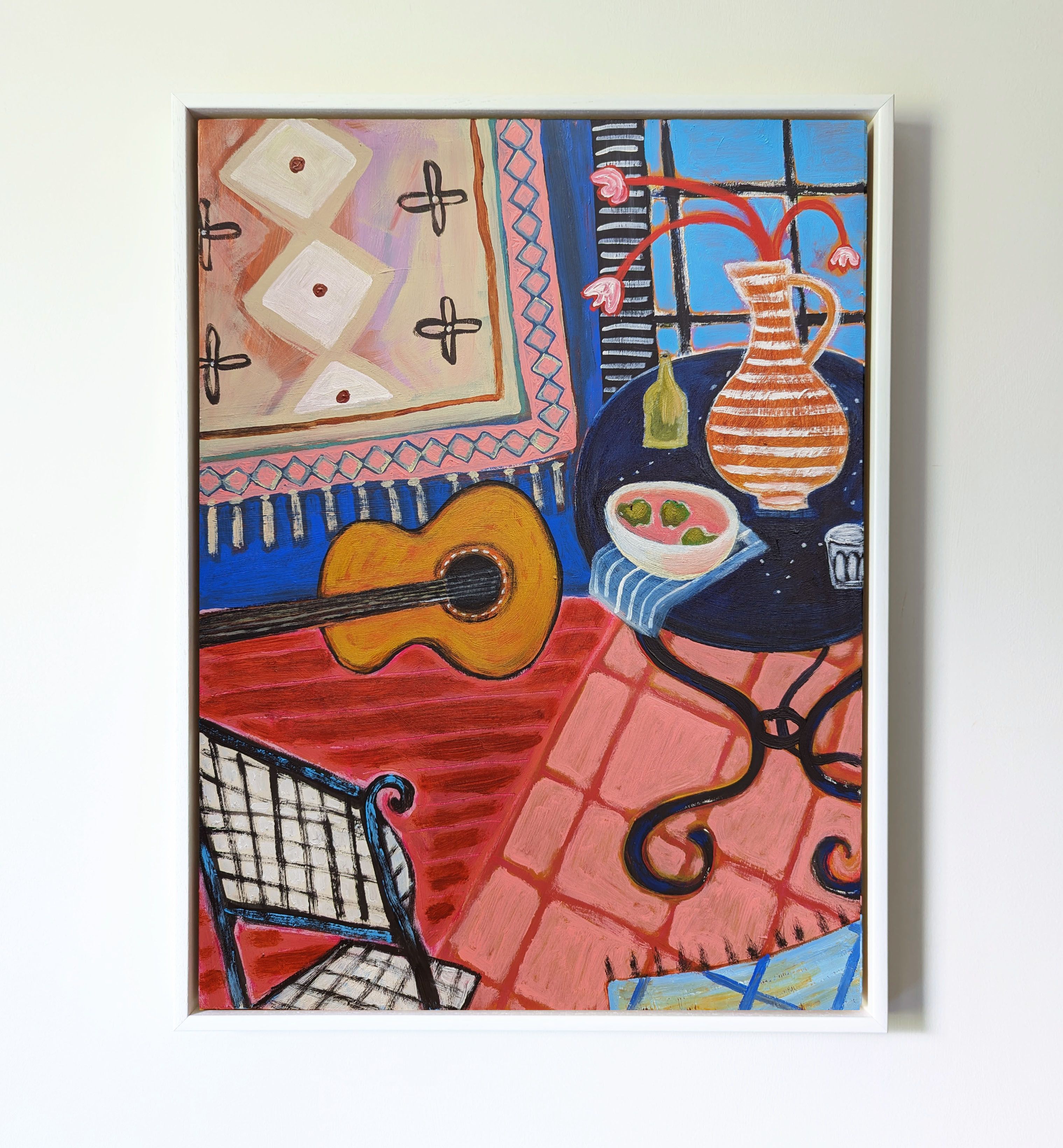 This artwork presents a vibrant and joyful contemporary interpretation of a traditional interior with a still life. The composition skillfully utilises the graphic intersection of shapes to guide the viewer's gaze through the scene, while also conveying a narrative relating to Amy's guitar. The artist's energetic and bold brushstrokes, along