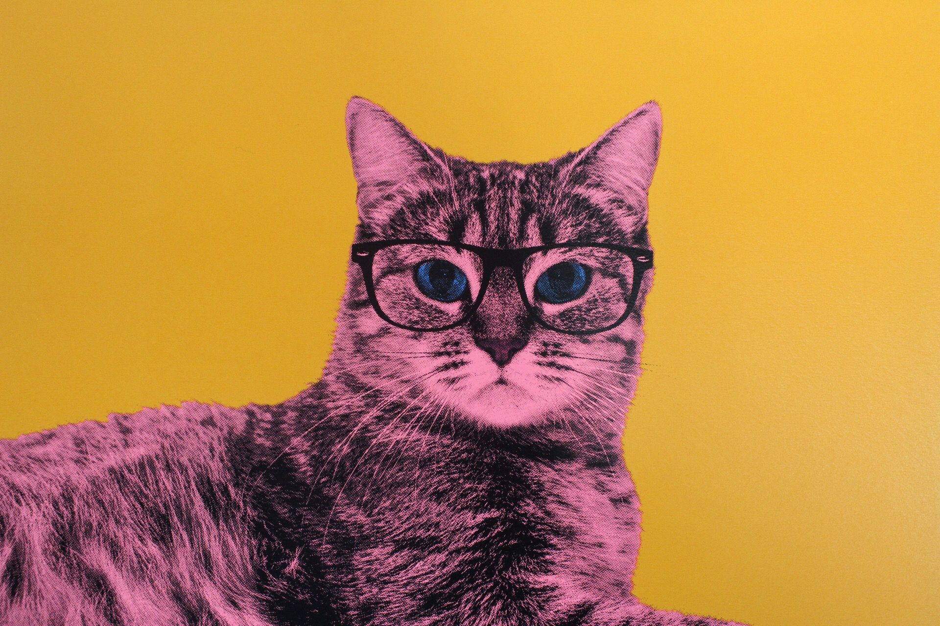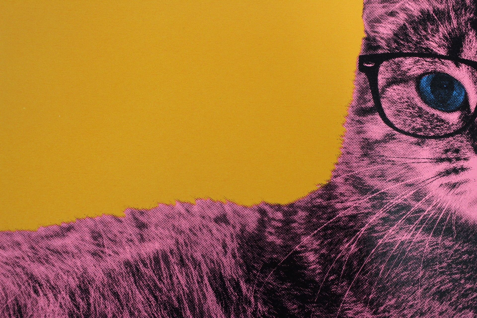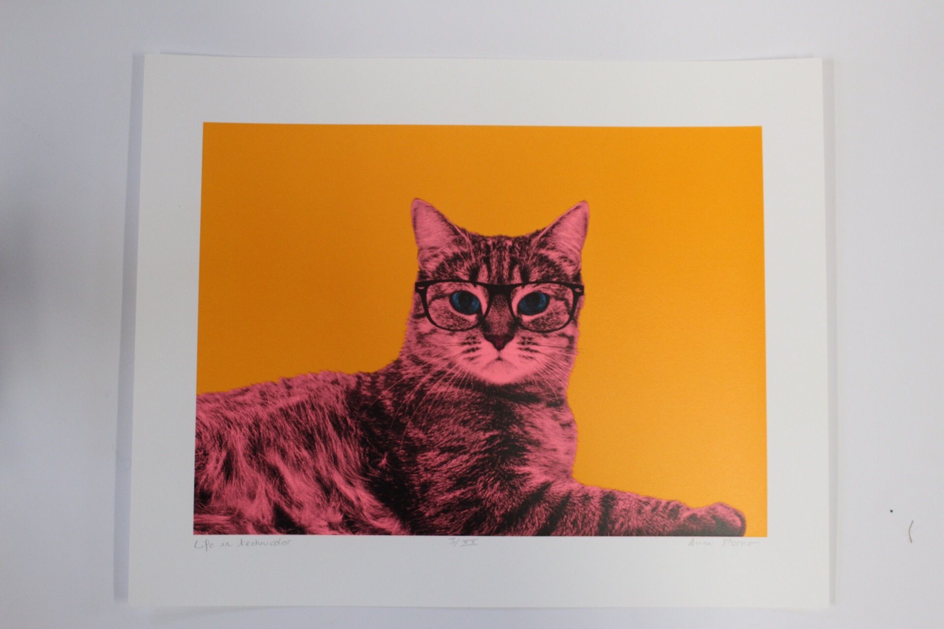 Anne Storno - Life in technicolor - Screenprinting - Limited edition of 12 A Bengale cat printed in fluorescent pink and blue on a bright orange background. This background provides a modern and pop touch. This a very colourful artwork with bright and shiny colours that gives energy, happiness and brings