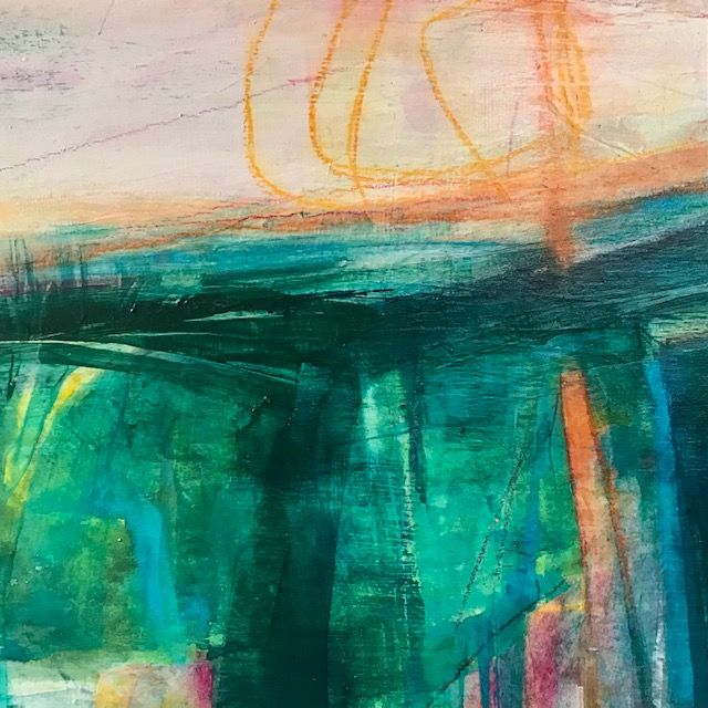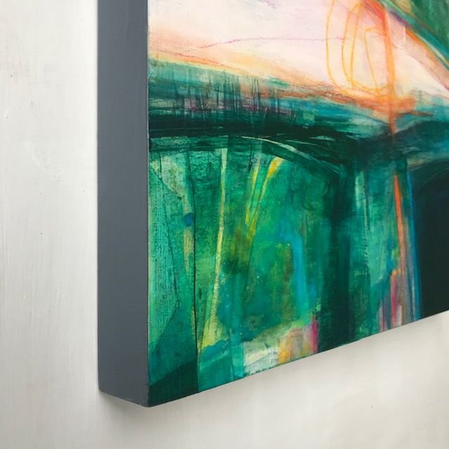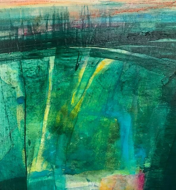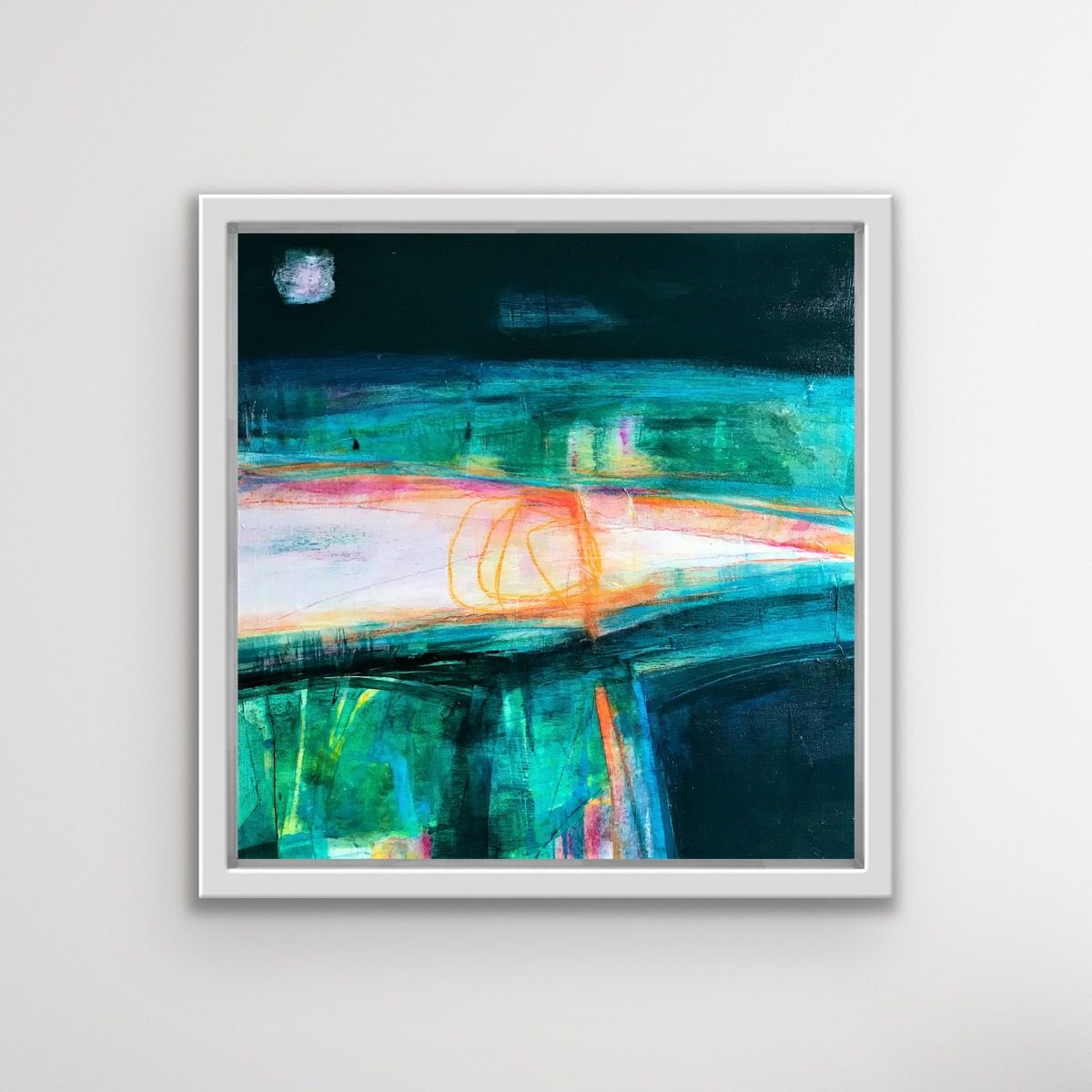 This painting is a landscape abstracted from dazzling moonlight over water, where colours and shadows dance and shimmer.