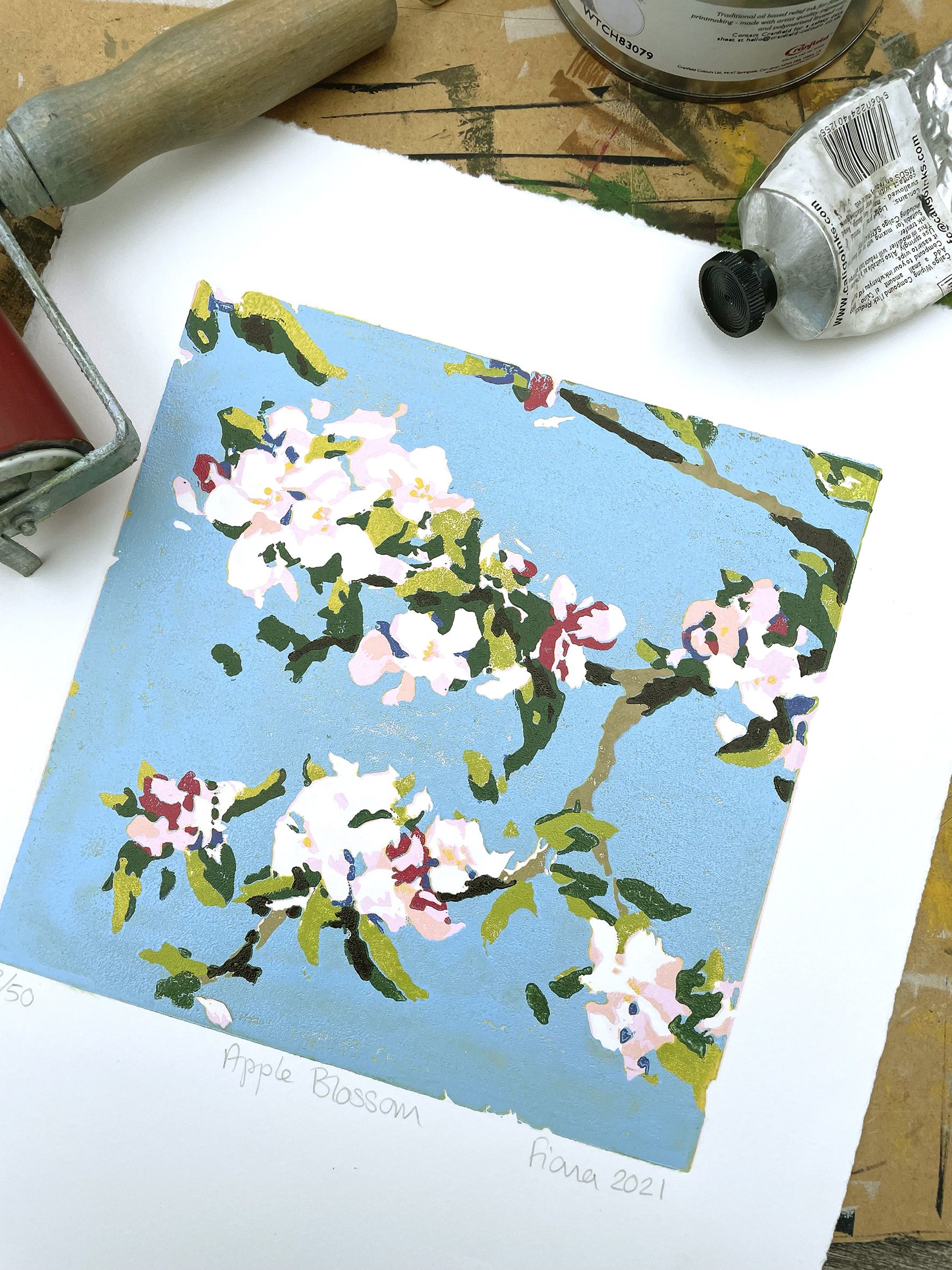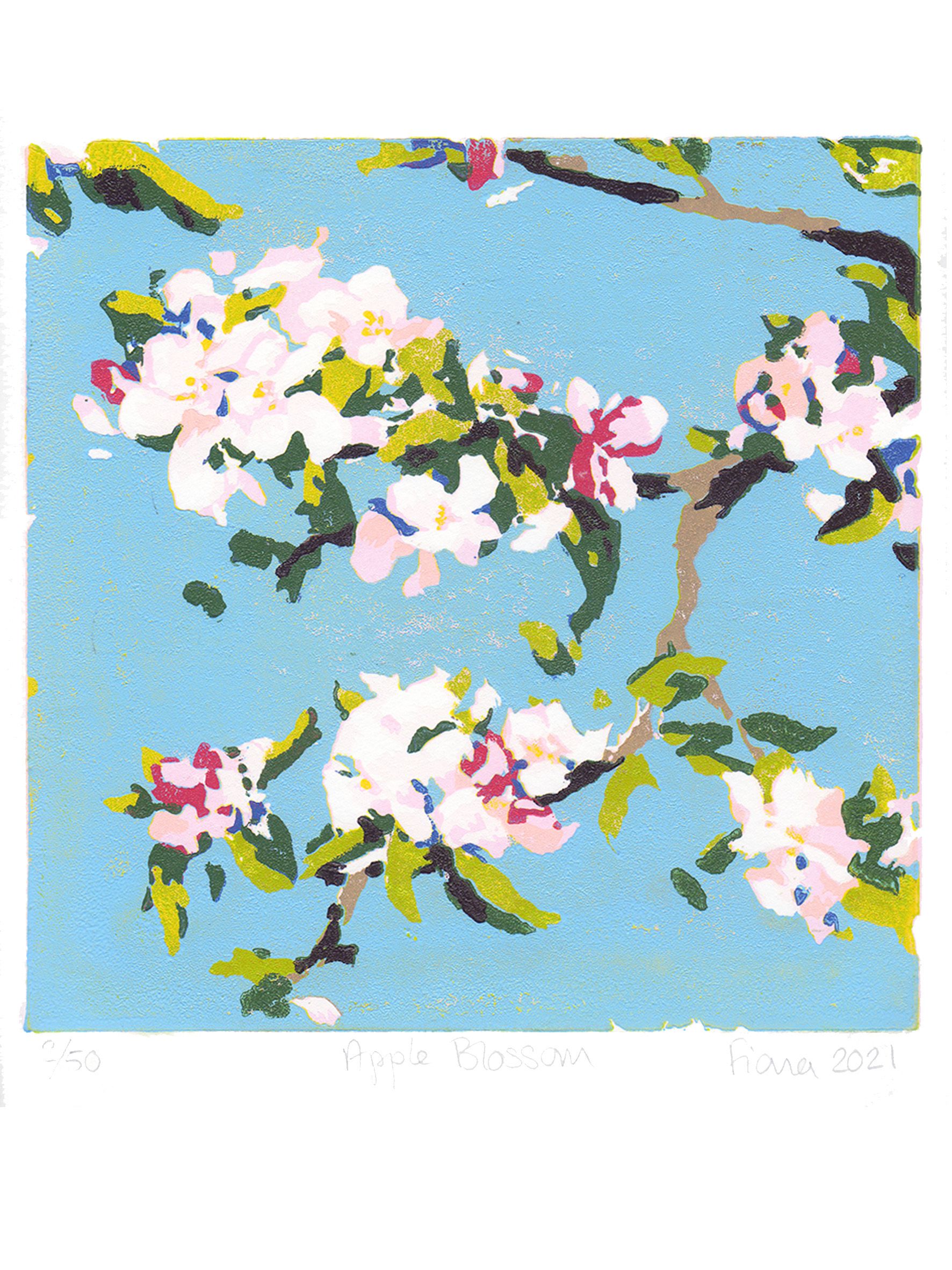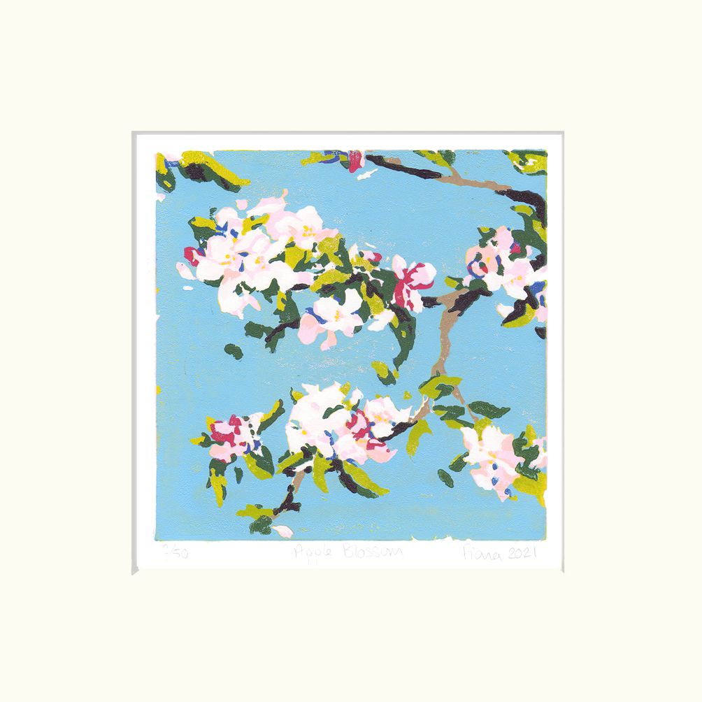 Apple Blossom is an original limited edition linocut print by Fiona Carver, inspired by the beautiful spring blossom in her garden. It is a reduction print, meaning that after each colour is printed, a bit more of the lino block is carved away before the next colour is printed.
