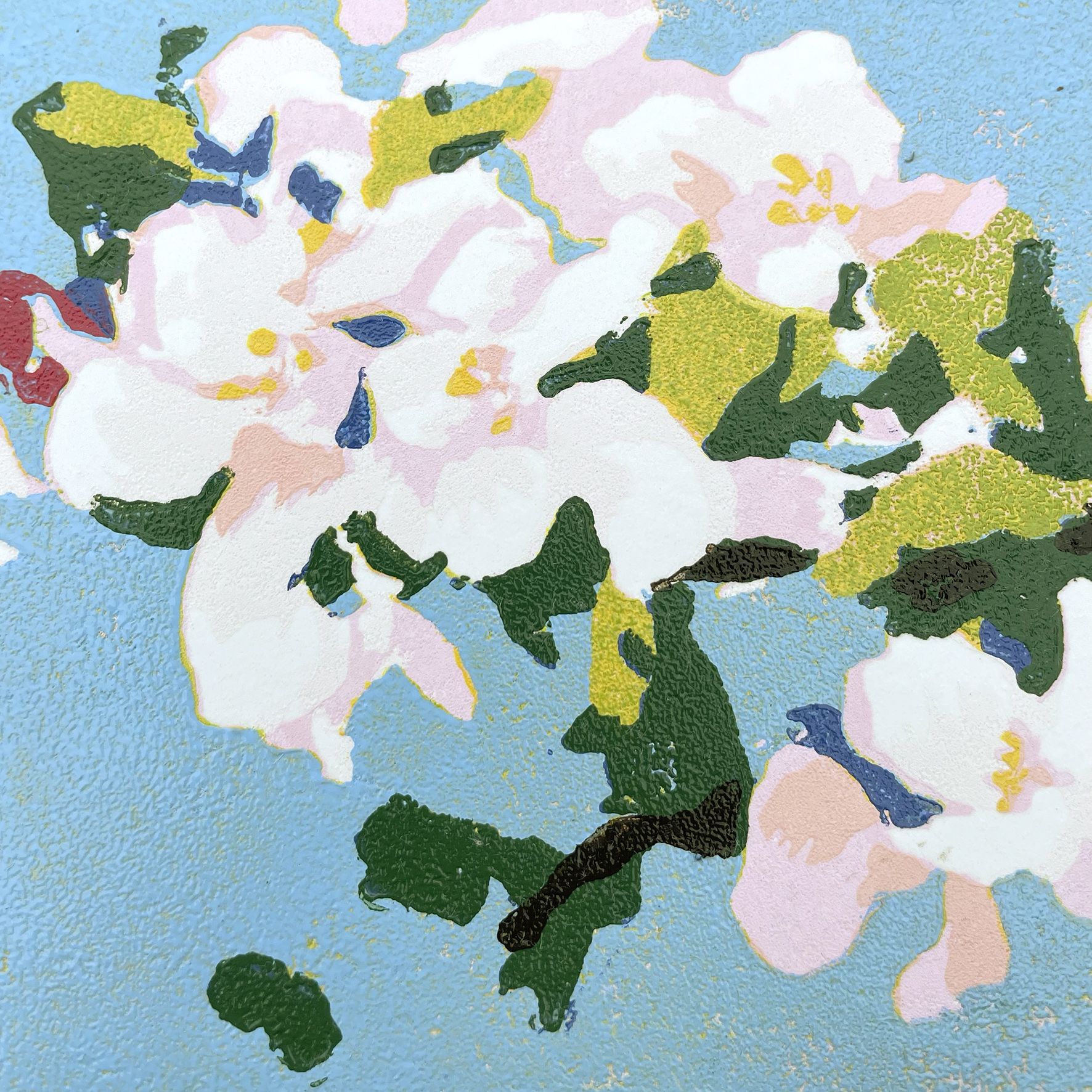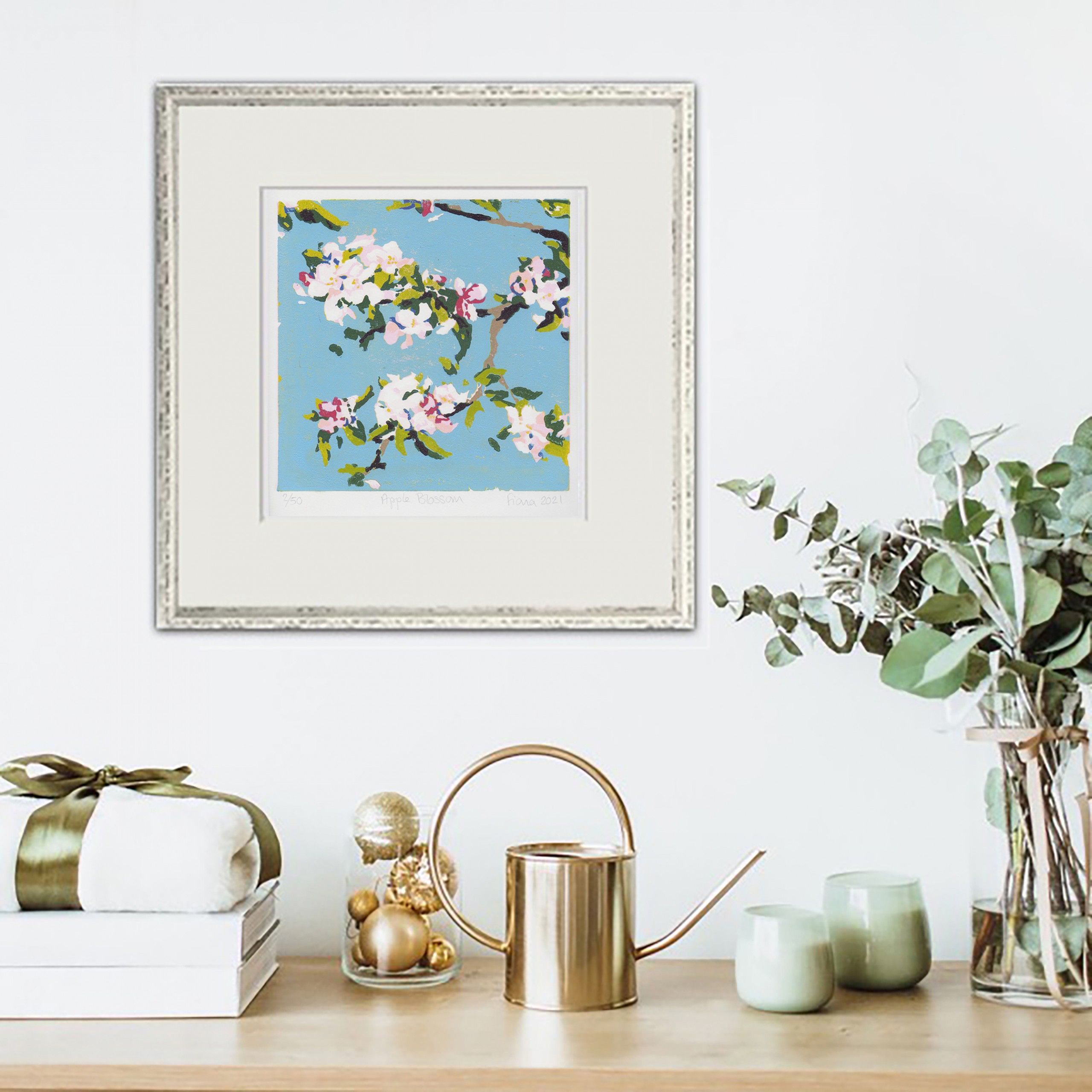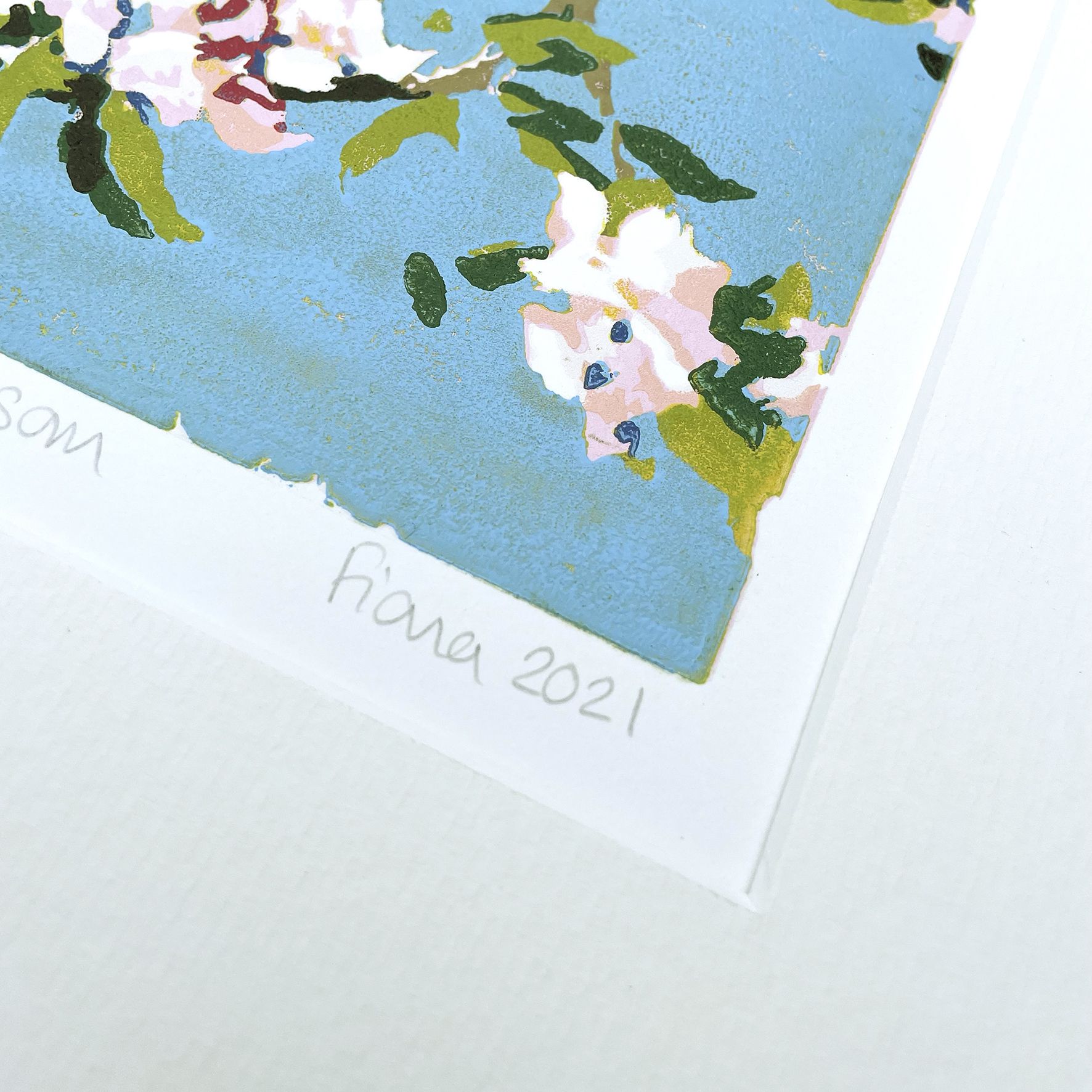 Apple Blossom is an original limited edition linocut print by Fiona Carver, inspired by the beautiful spring blossom in her garden. It is a reduction print, meaning that after each colour is printed, a bit more of the lino block is carved away before the next colour is printed.