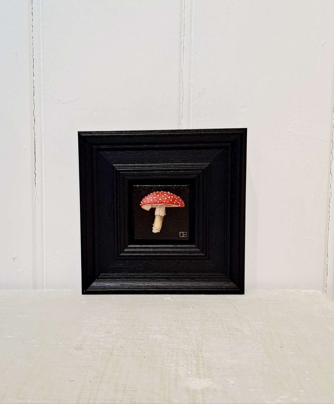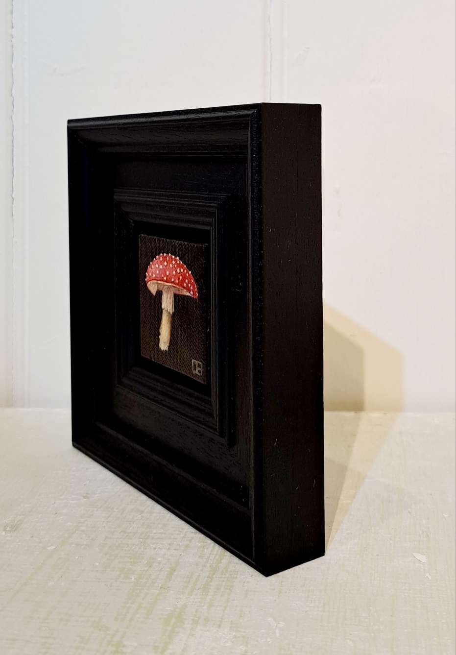 Autumn Collection: Pocket Toadstool is an original oil painting by Dani Humberstone as part of her Pocket Painting series featuring small scale realistic oil paintings, with a nod to baroque still life painting. The paintings are set in a black wood layered frame.