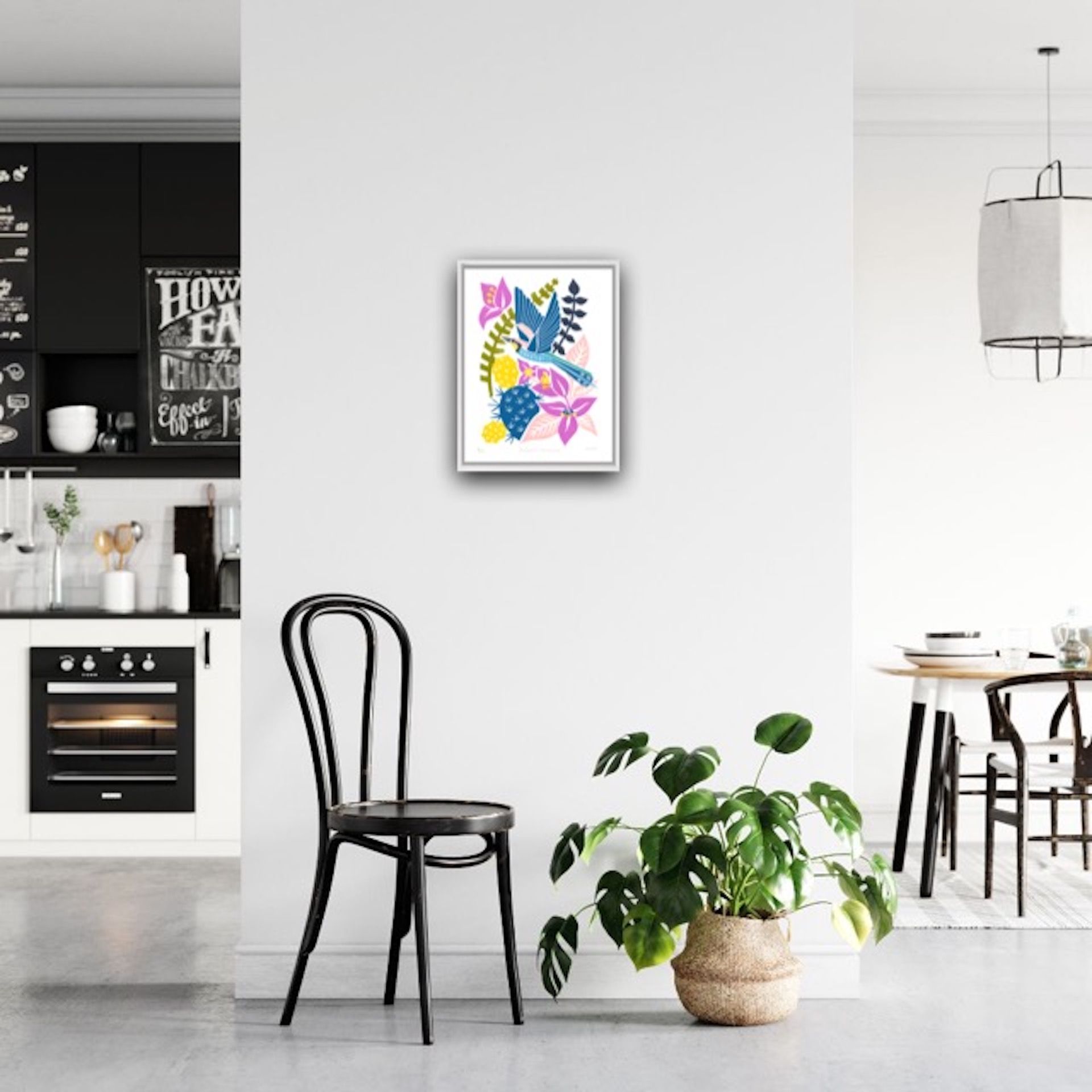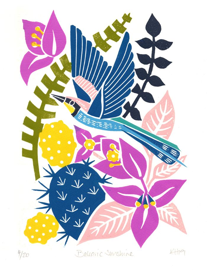 Kate Heiss Balearic Sunshine Limited Edition Linocut Print Edition of 20 Image Size: H 30cm x W 21cm Mounted Size: H 40cm x W 30cm x D 0.3cm Signed and Dated Sold Unframed Linocut Print – A relief printing technique where lino is cut, inked and rolled to create an inverse relief print, generating the image as seen. This