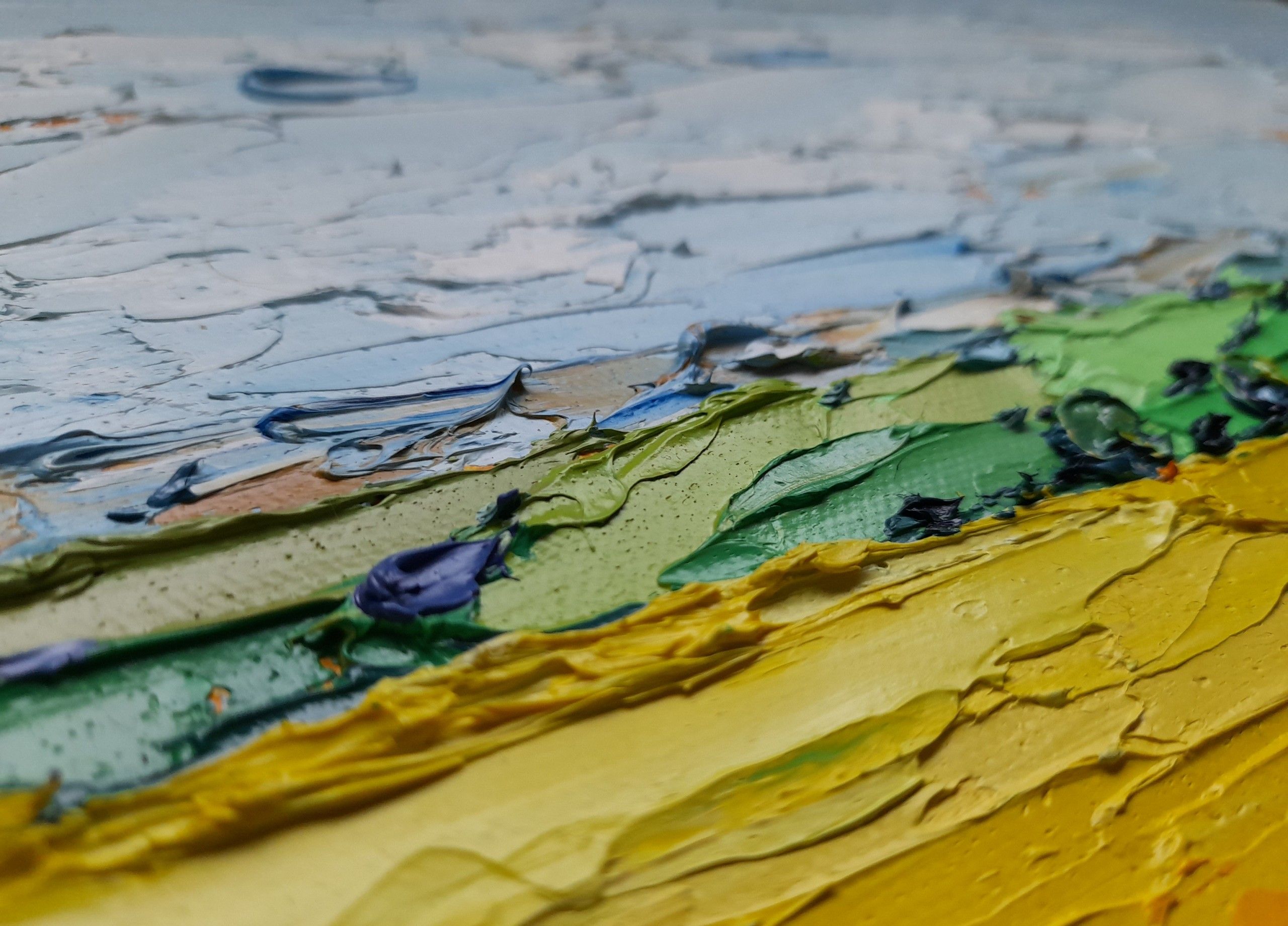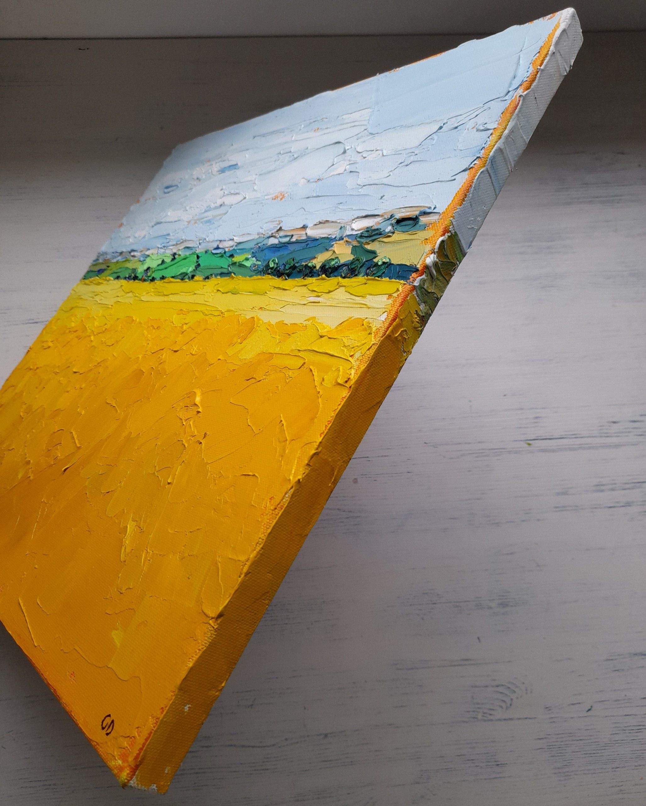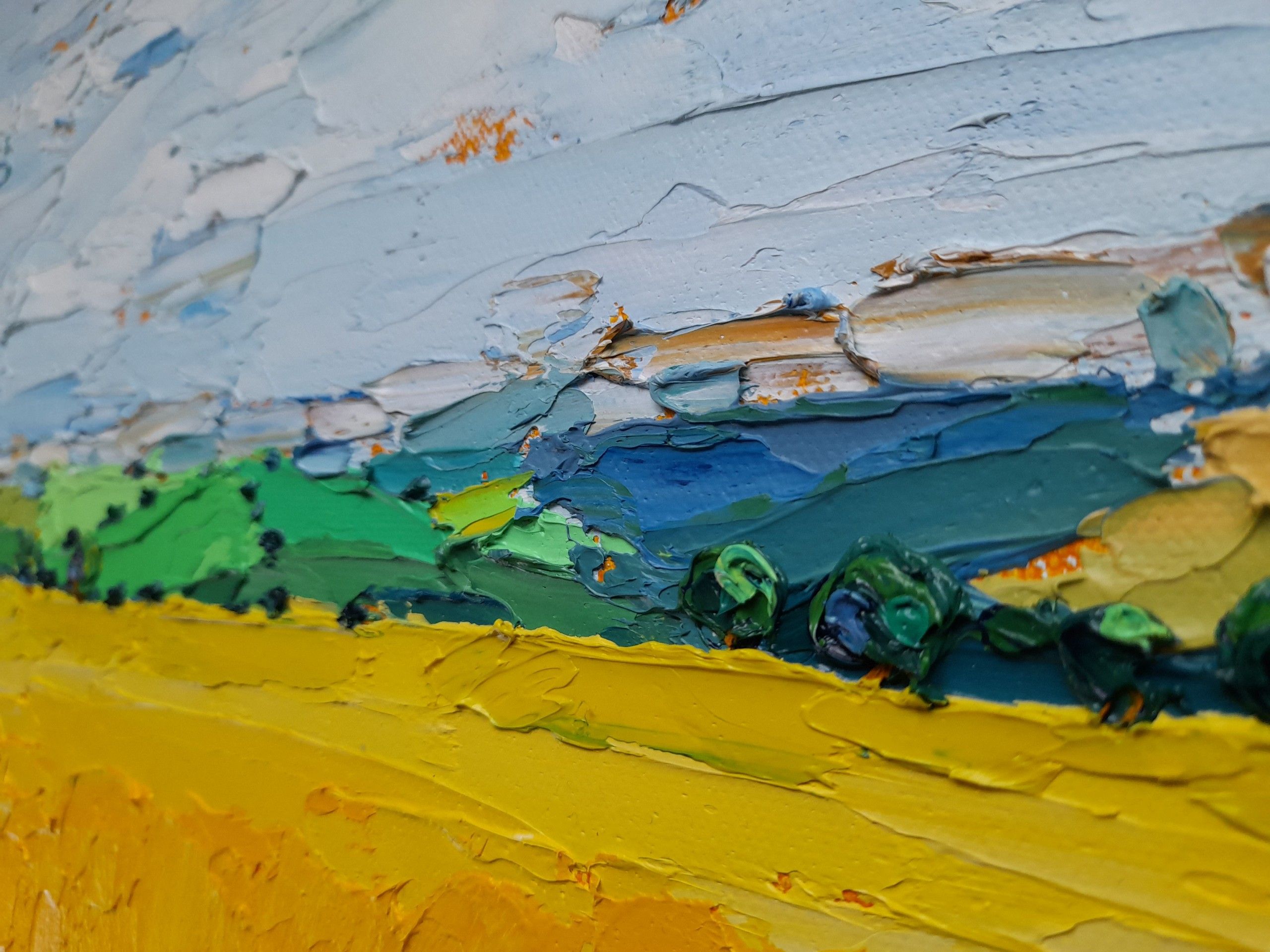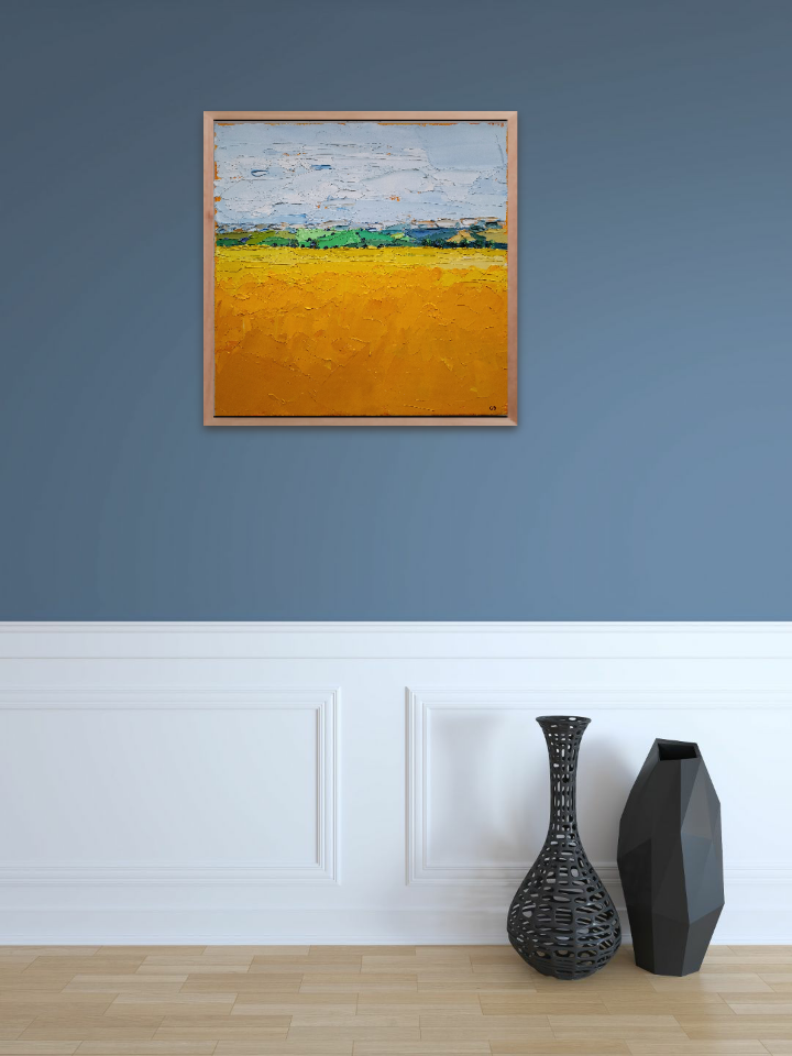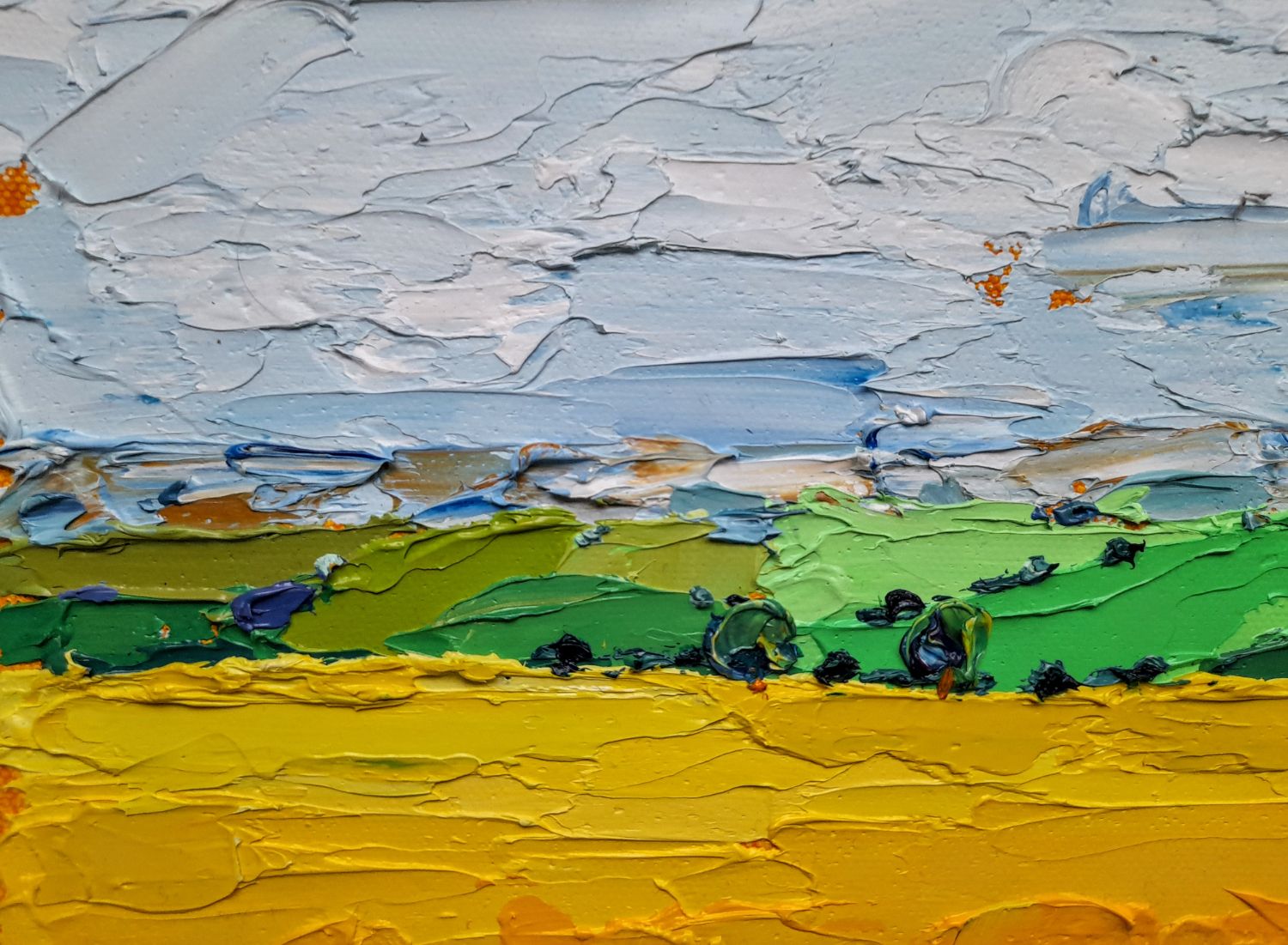 ‘Barley field in Dowdeswell, Cotswolds’ is an original landscape painting by Georgie Dowling. A photograph was taken on a dog walk as a reference for this piece which was then created in my home studio. The painting depicts a field of barley and a pattern of fields in the distance.