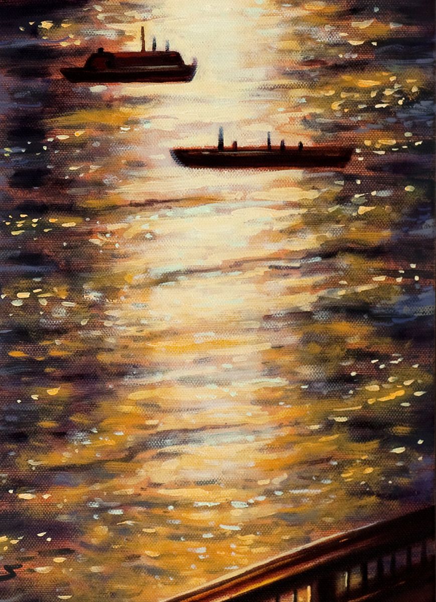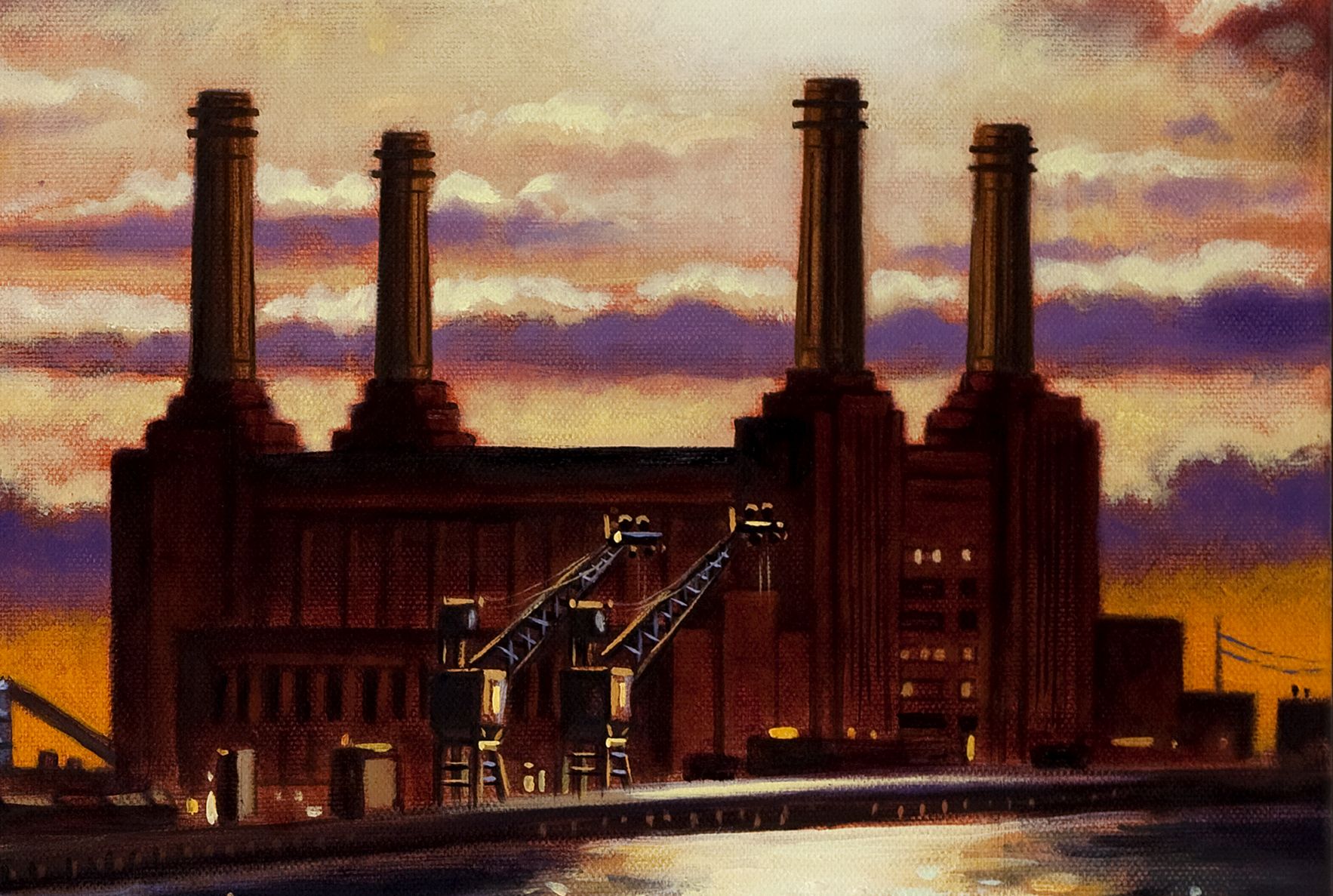 Battersea Power Station painted at dusk from Vauxhall Bridge in 2012. This view shows the Art Deco power station before the land all around it was developed, allowing the power station to stand out on the skyline. One of the greatest piece of architecture in London.