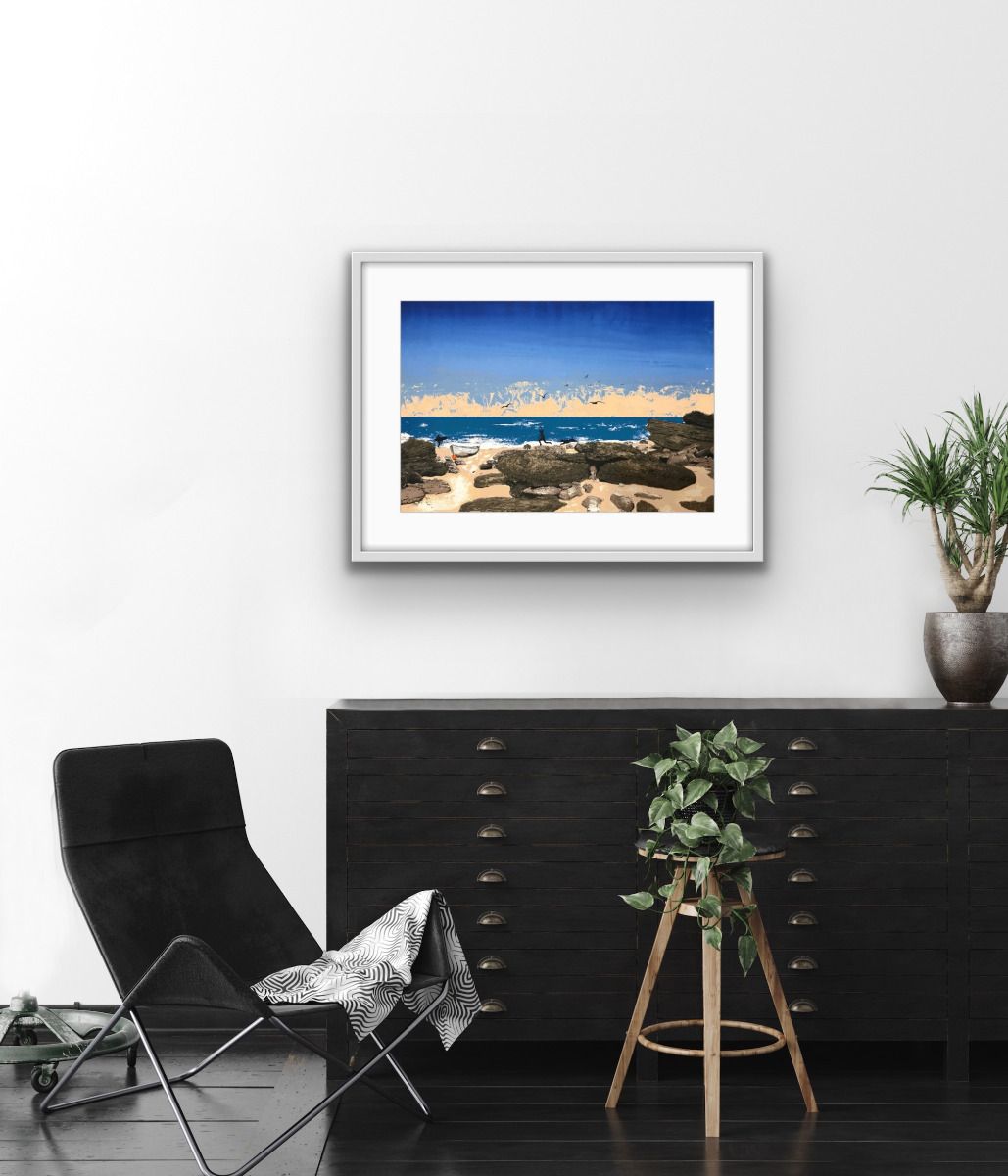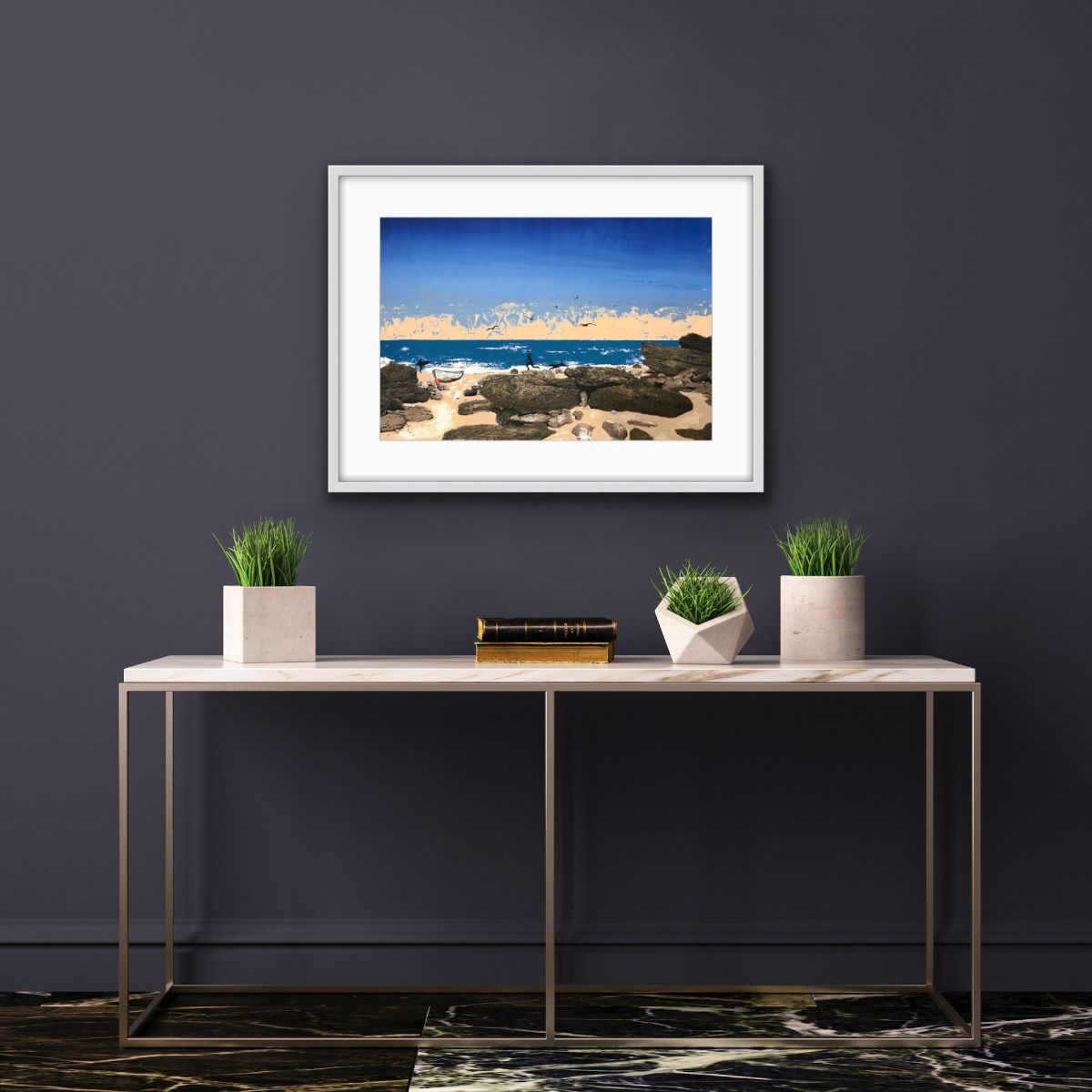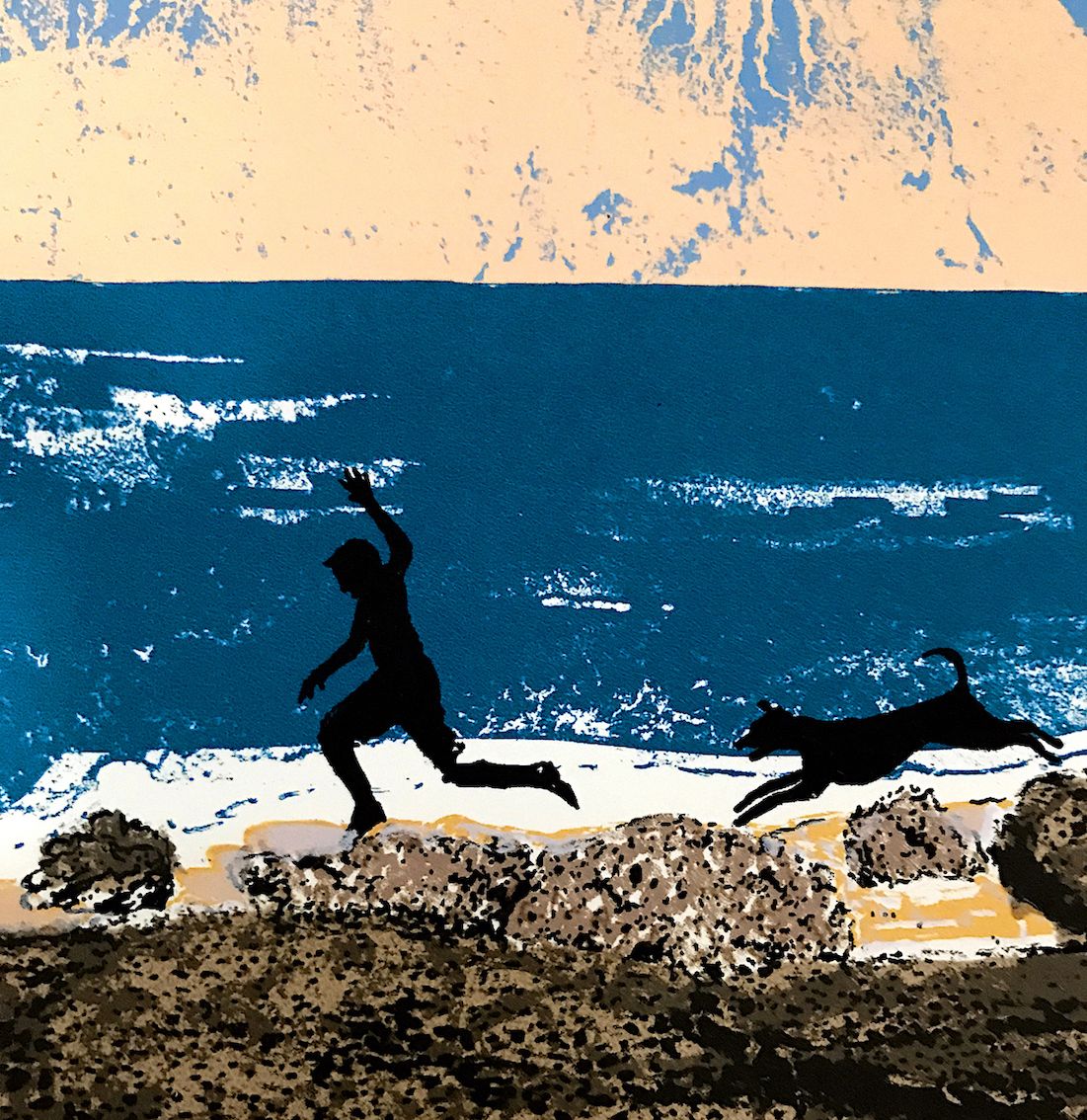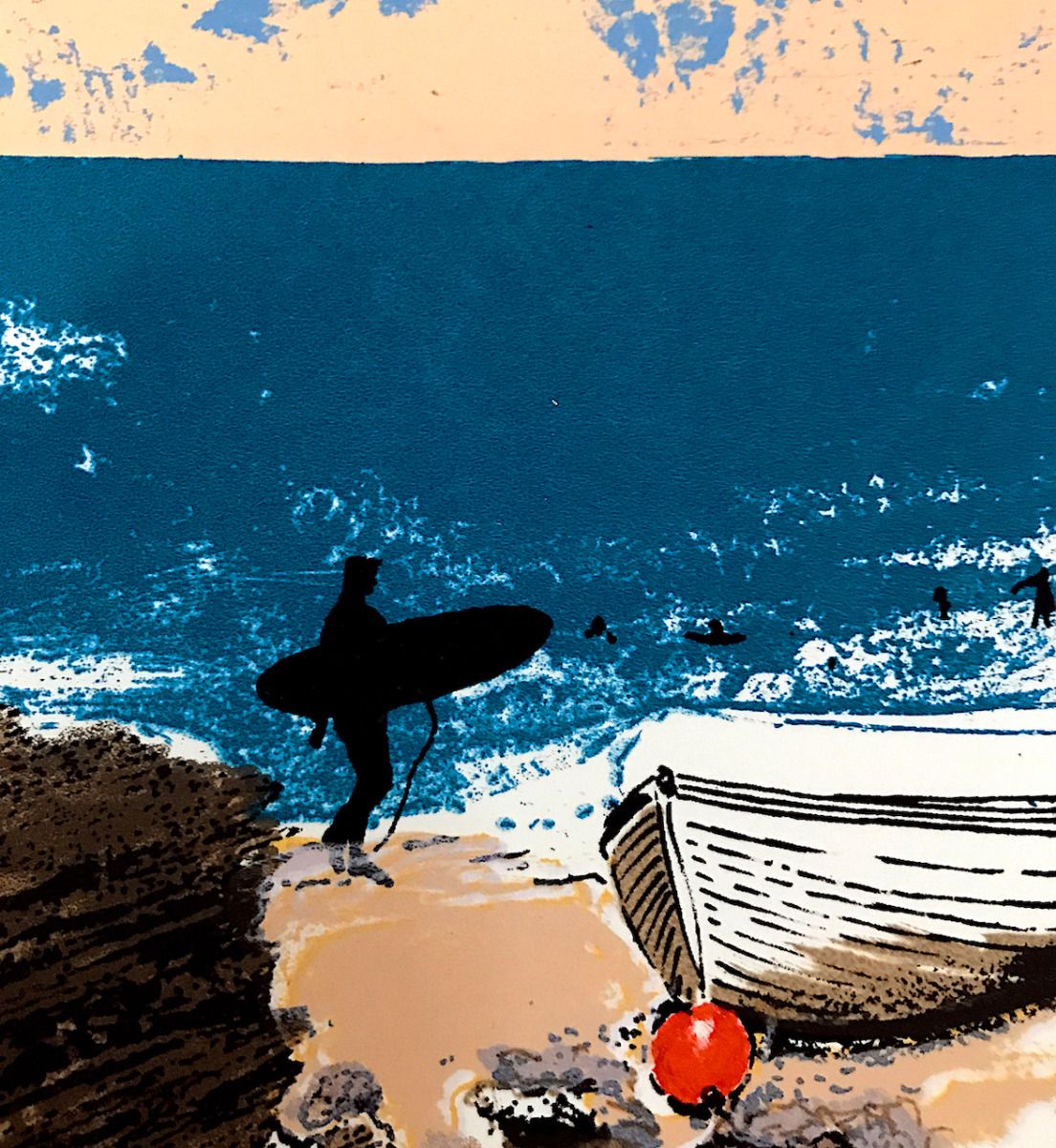 Beach Boys' is a snap-shot of bright and breezy day at the beach with boys surfing and playing with their dog. This fresh and evocative print captures the bright light of a carefree summer day on the coast where one can almost smell the salt in the air. This 7 colour