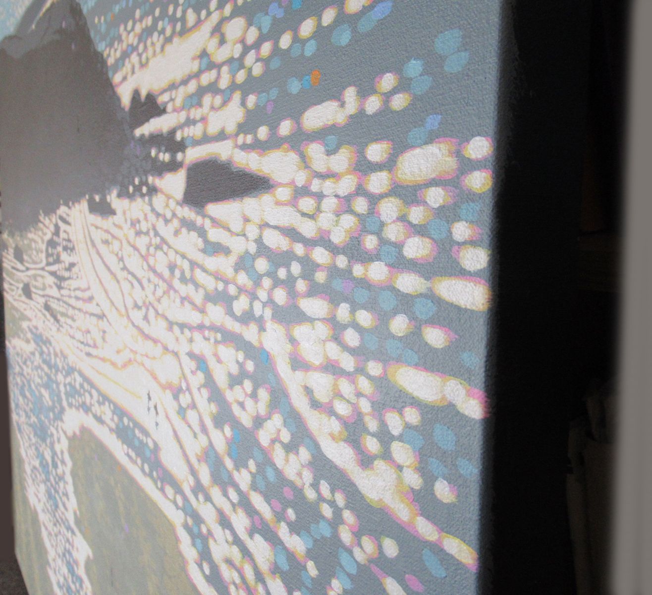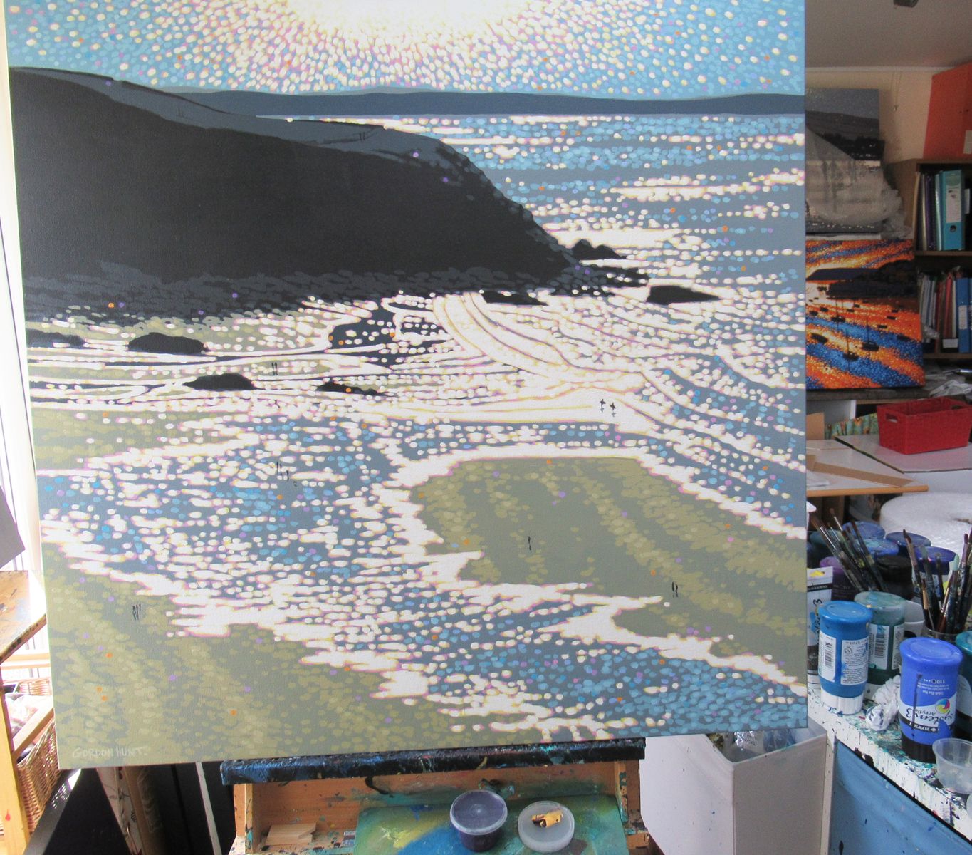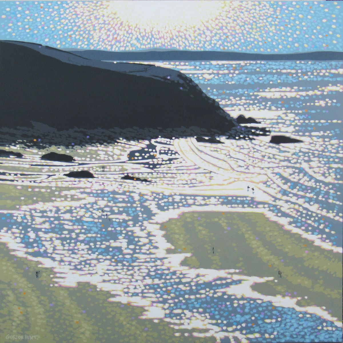 Beach sunshine sparkles Gordon Hunt Original acrylic painting on Belgium linen. As I stood on the beach - A burst of sunshine reached - Across the sea and the sand - ............................ (whats your line to complete the poem?) - 'Beach sunshine sparkles is taken from a recent visit to the north Cornwall coast. Walking the coast