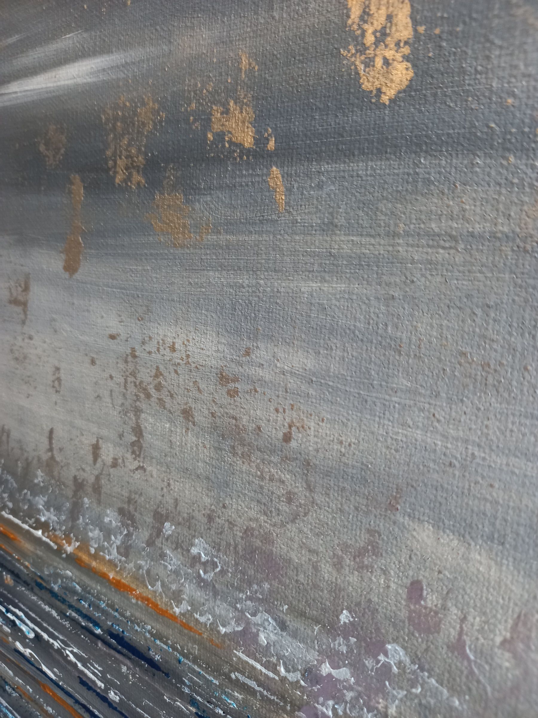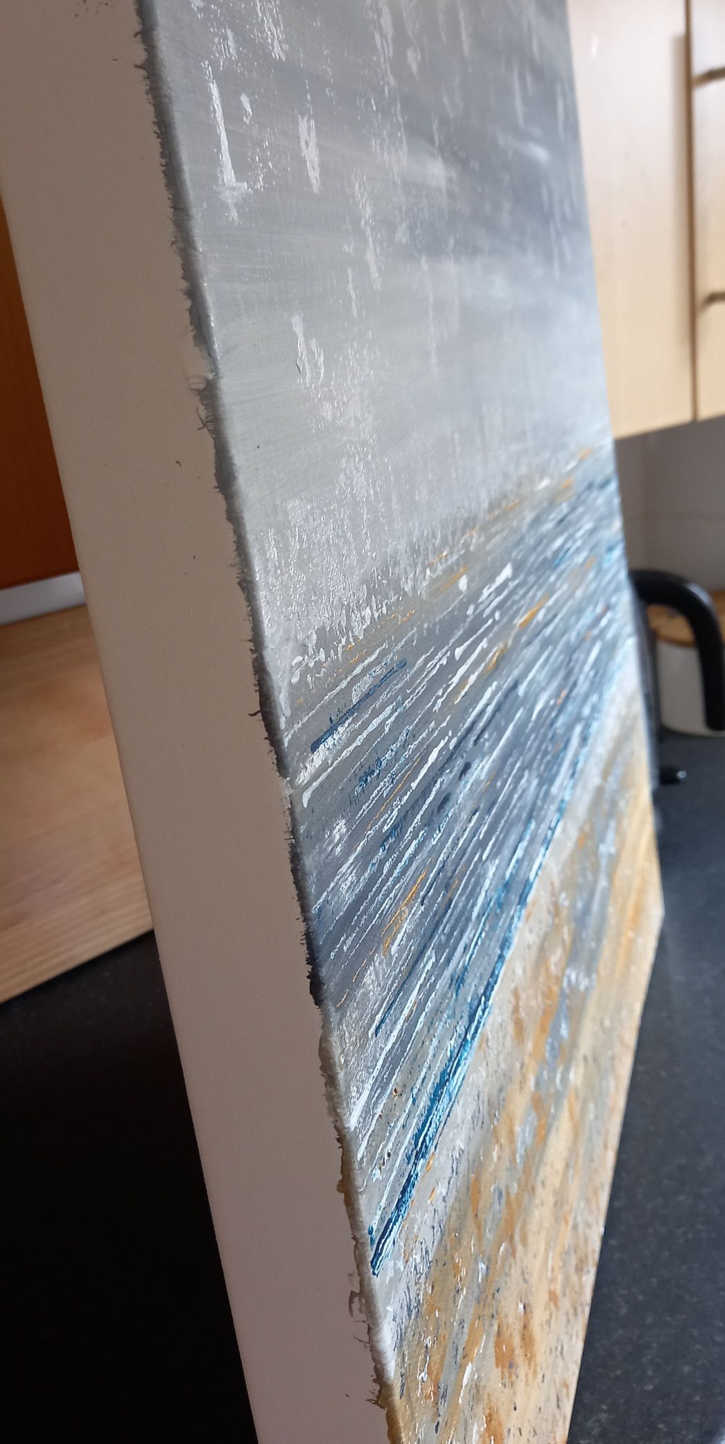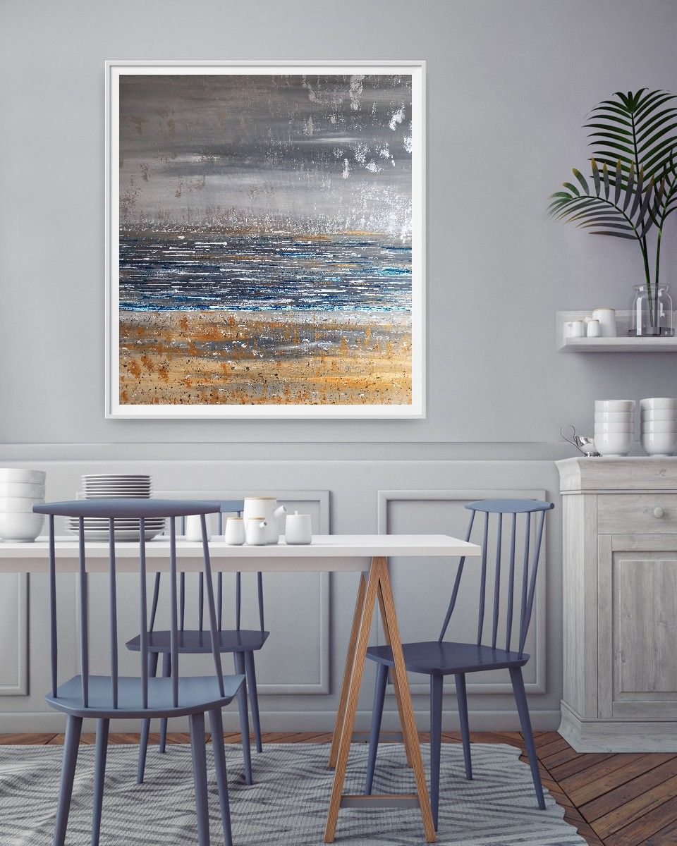 Inspired by the novel 'On Chesil Beach' by Ian McEwan, Beach Thoughts is about relationships. The relationship between sea and sand, between people and nature and people and each other. The gold colour brings warmth and positivity to it and the the silver sky depicts hope.
