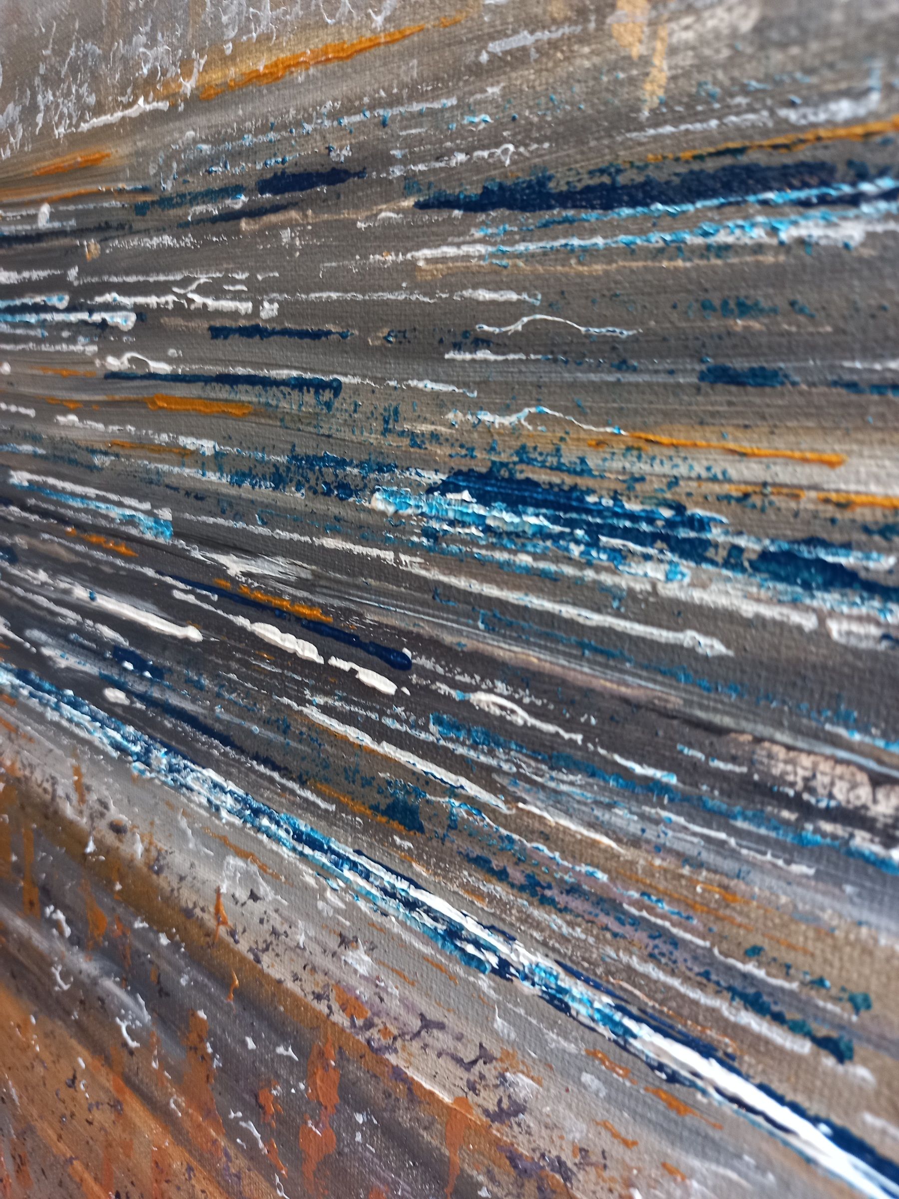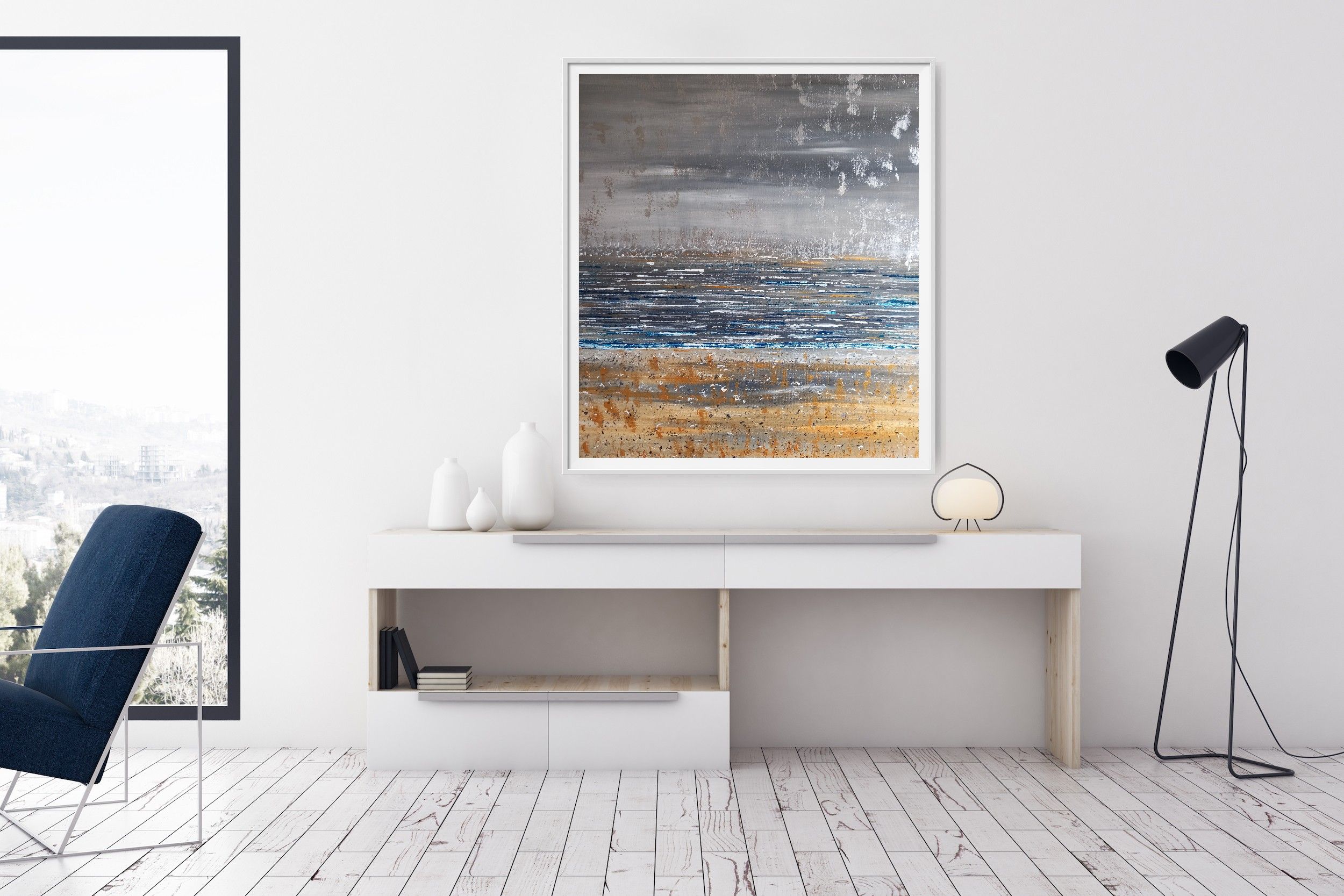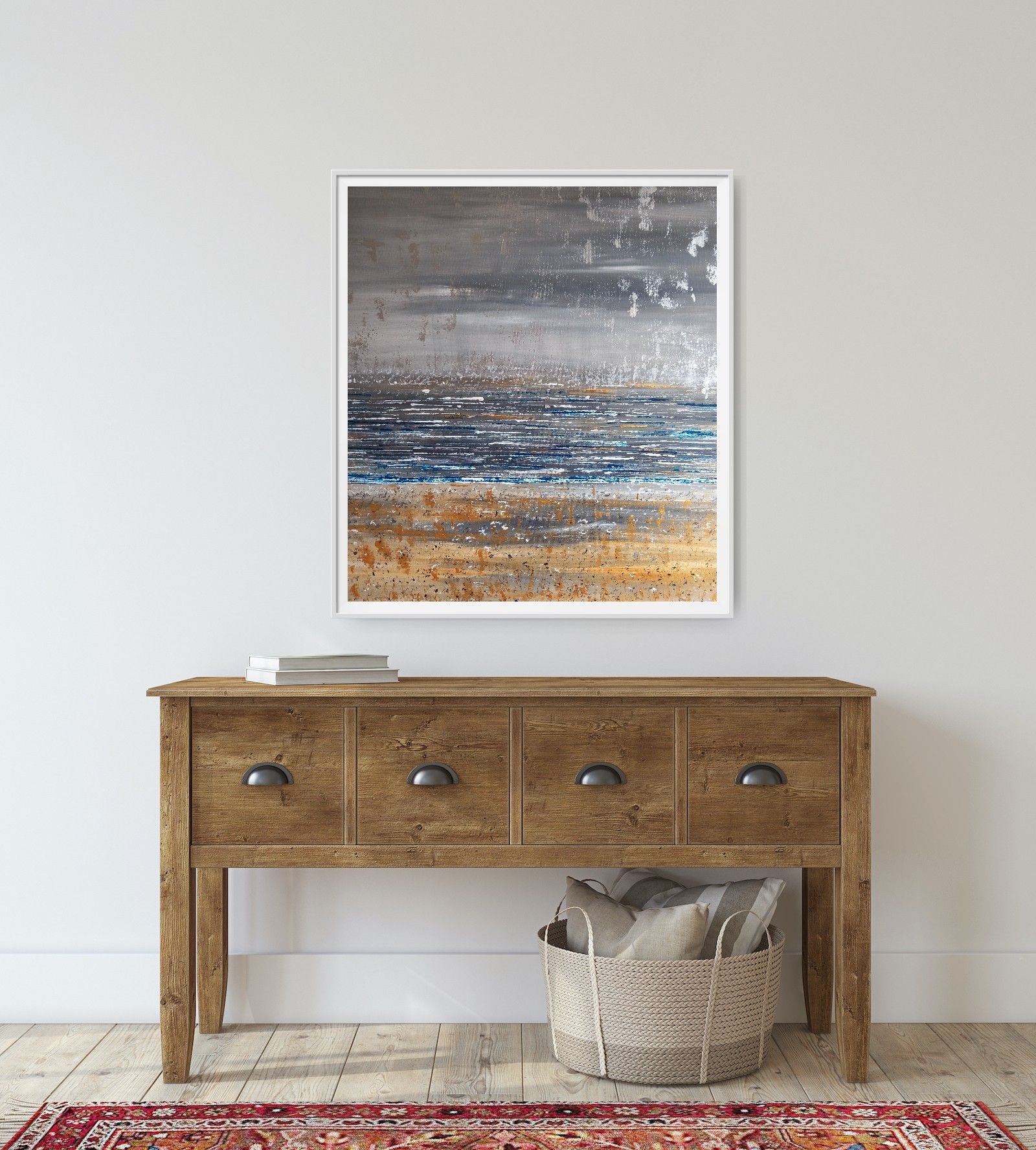 Inspired by the novel 'On Chesil Beach' by Ian McEwan, Beach Thoughts is about relationships. The relationship between sea and sand, between people and nature and people and each other. The gold colour brings warmth and positivity to it and the the silver sky depicts hope.