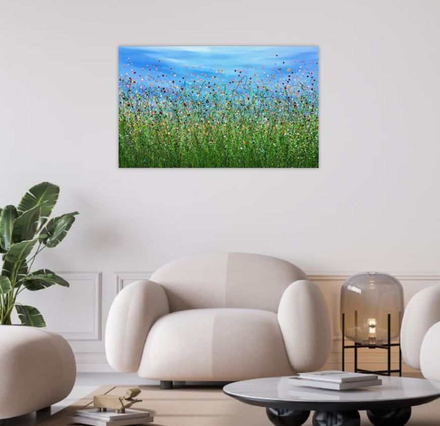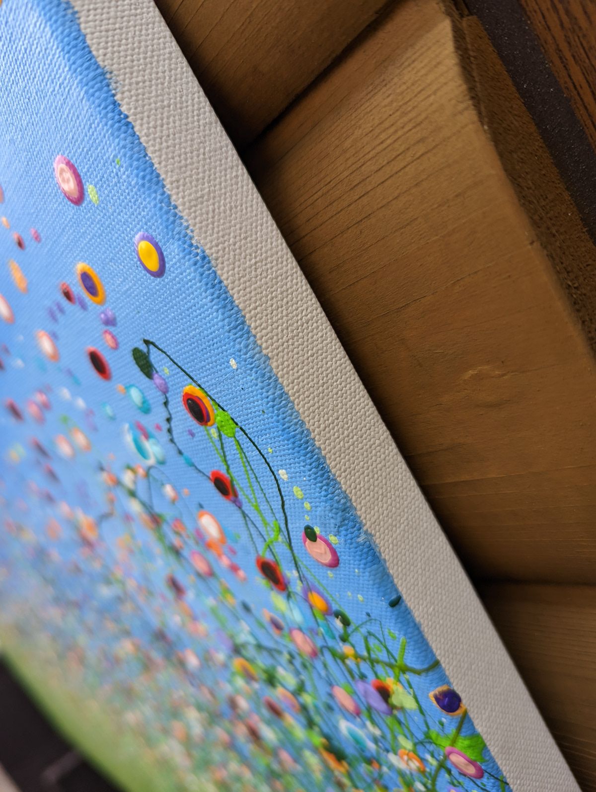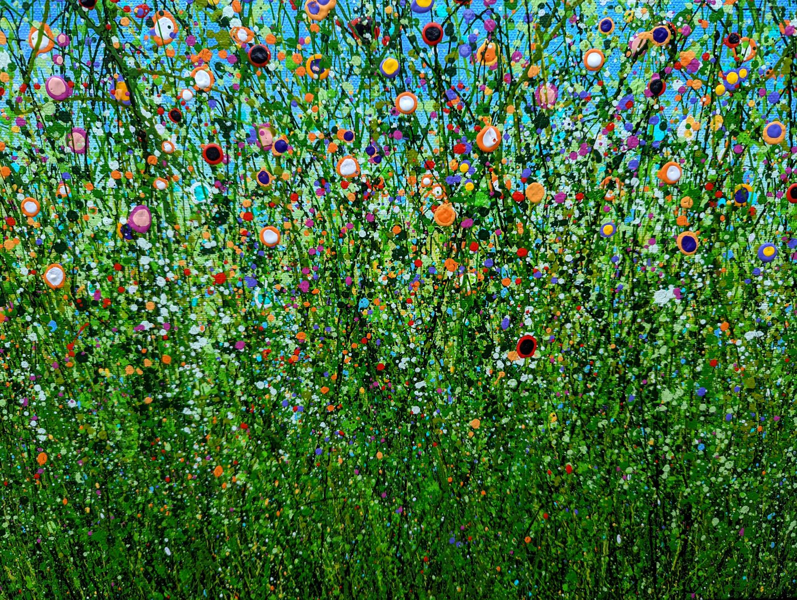 Beautiful Chaos #6 - An Original semi-abstract painting by Lucy Moore. Using her signature string grass technique Lucy has created a semi-abstract twist to her classic meadow paintings. Colourful pastels flowers beneath a sunlit skyline. This piece would brighten any home or office, bring a little of the outside inside.