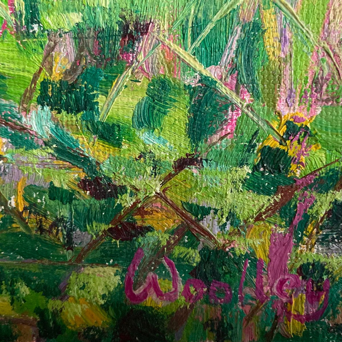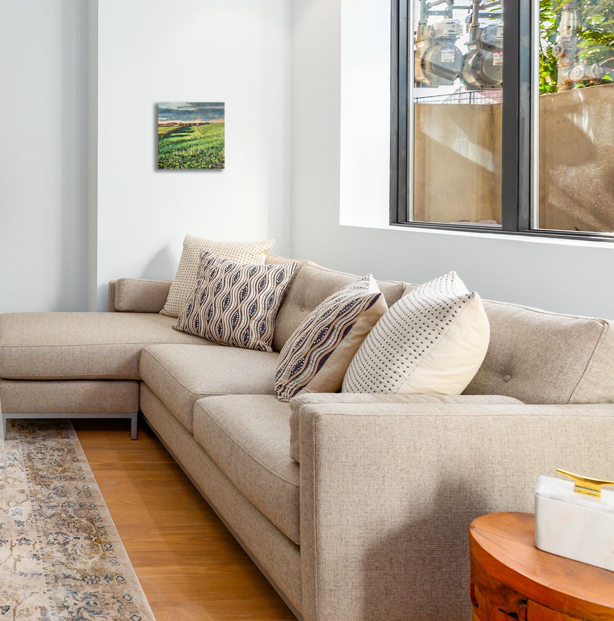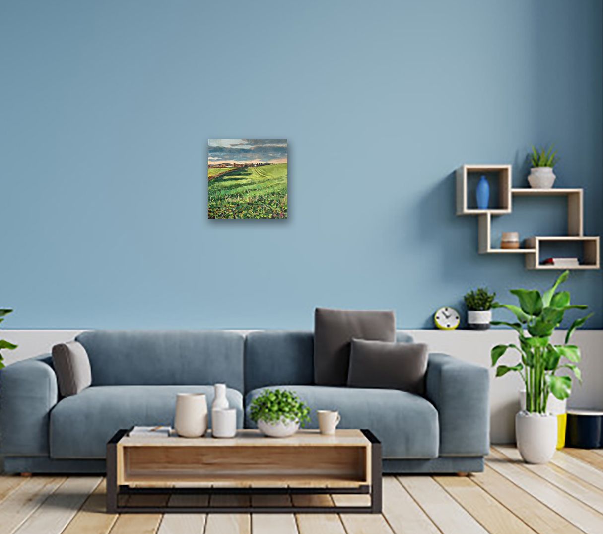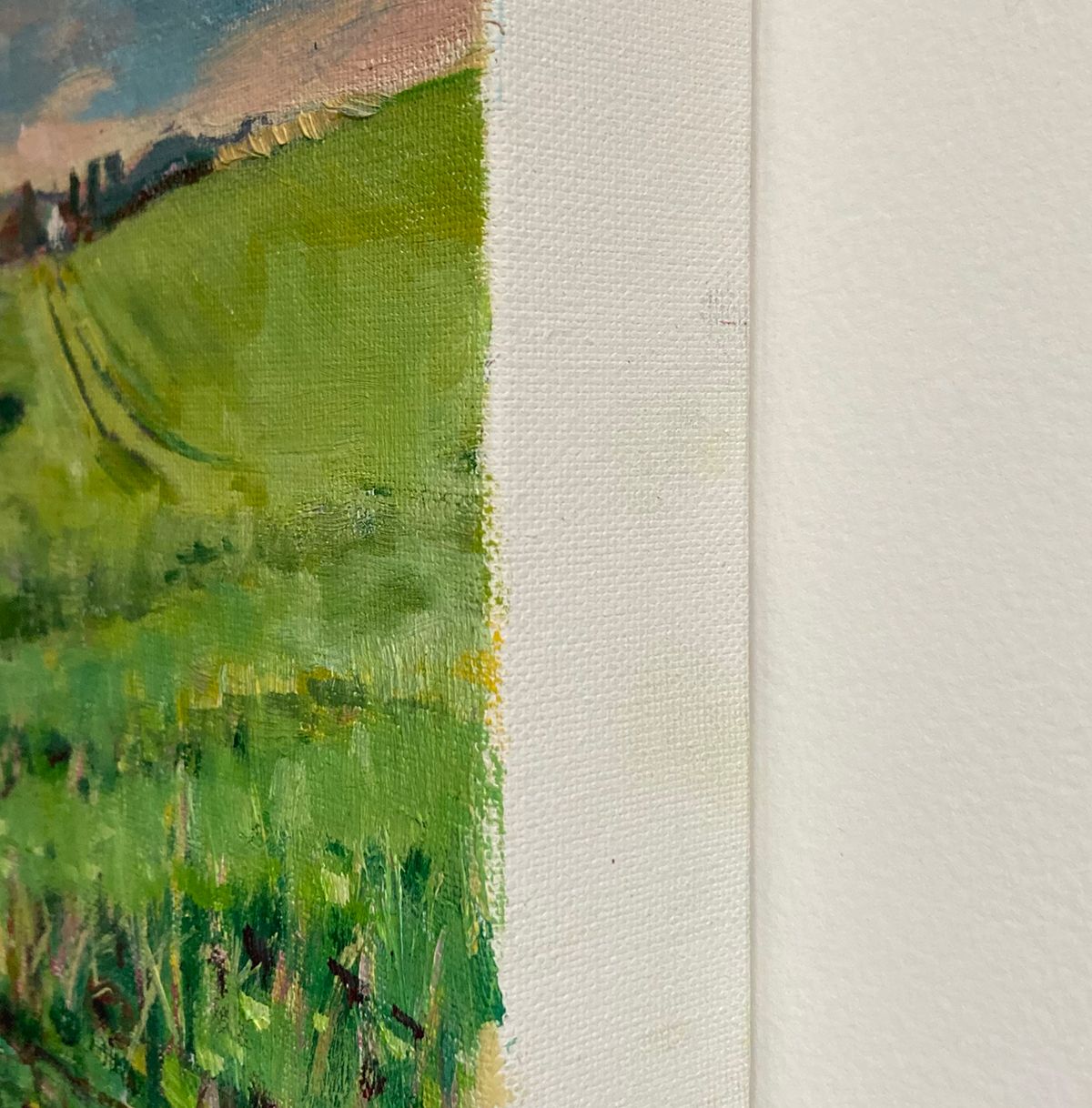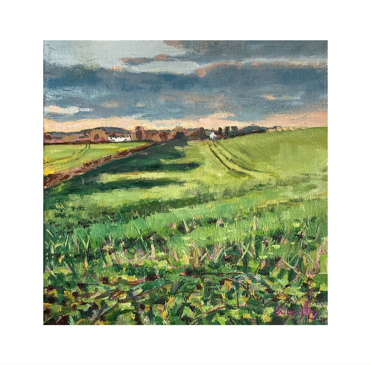 Before the Harvest is an Original Oil Painting by Eleanor Woolley. Painted when the fields a green and deep with the summers wheat. The lovely tracks leaving dark stripes, and long hedgerow, shadows adding depth and colour. The darkening sky gives a moody atmosphere to the piece.