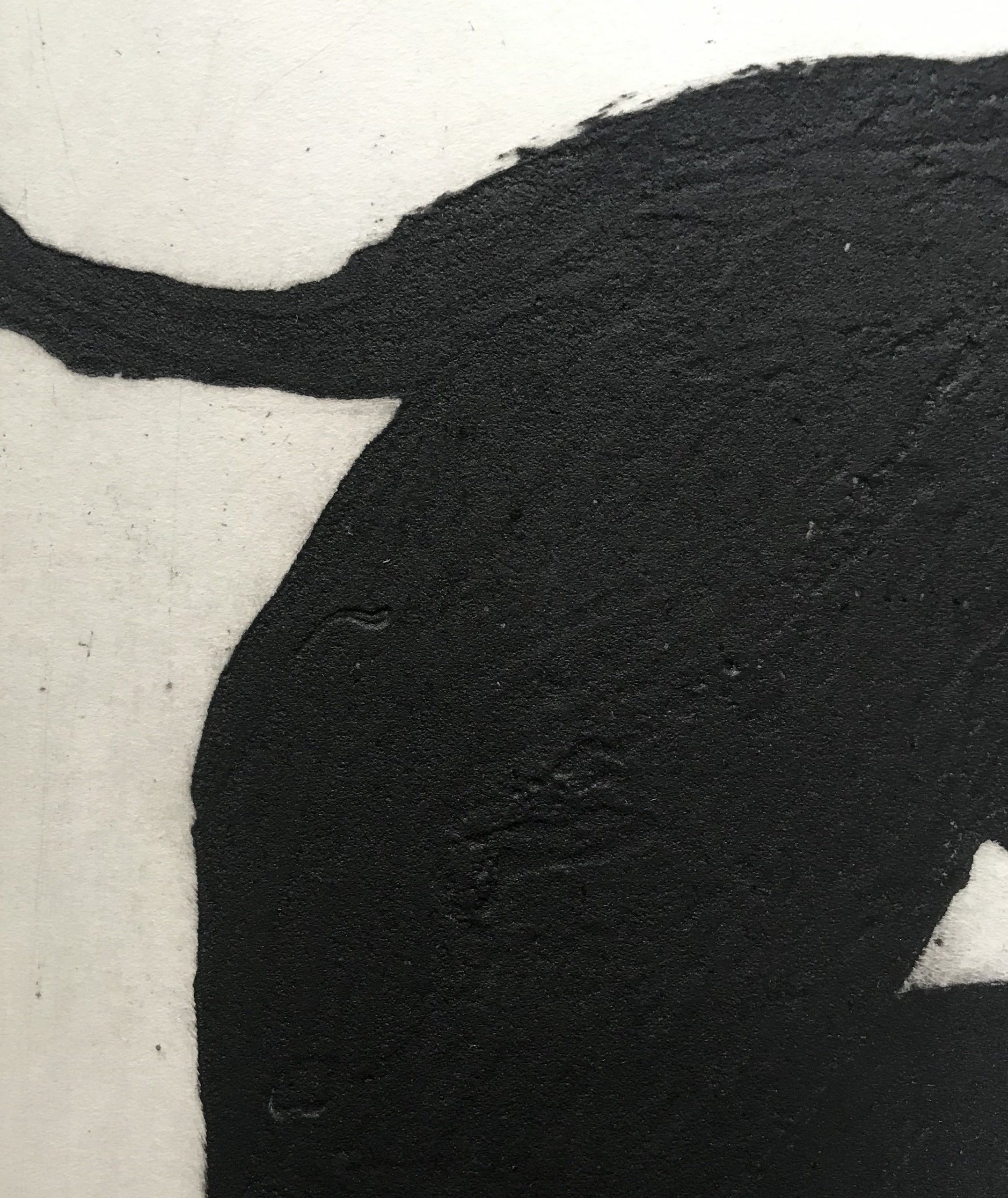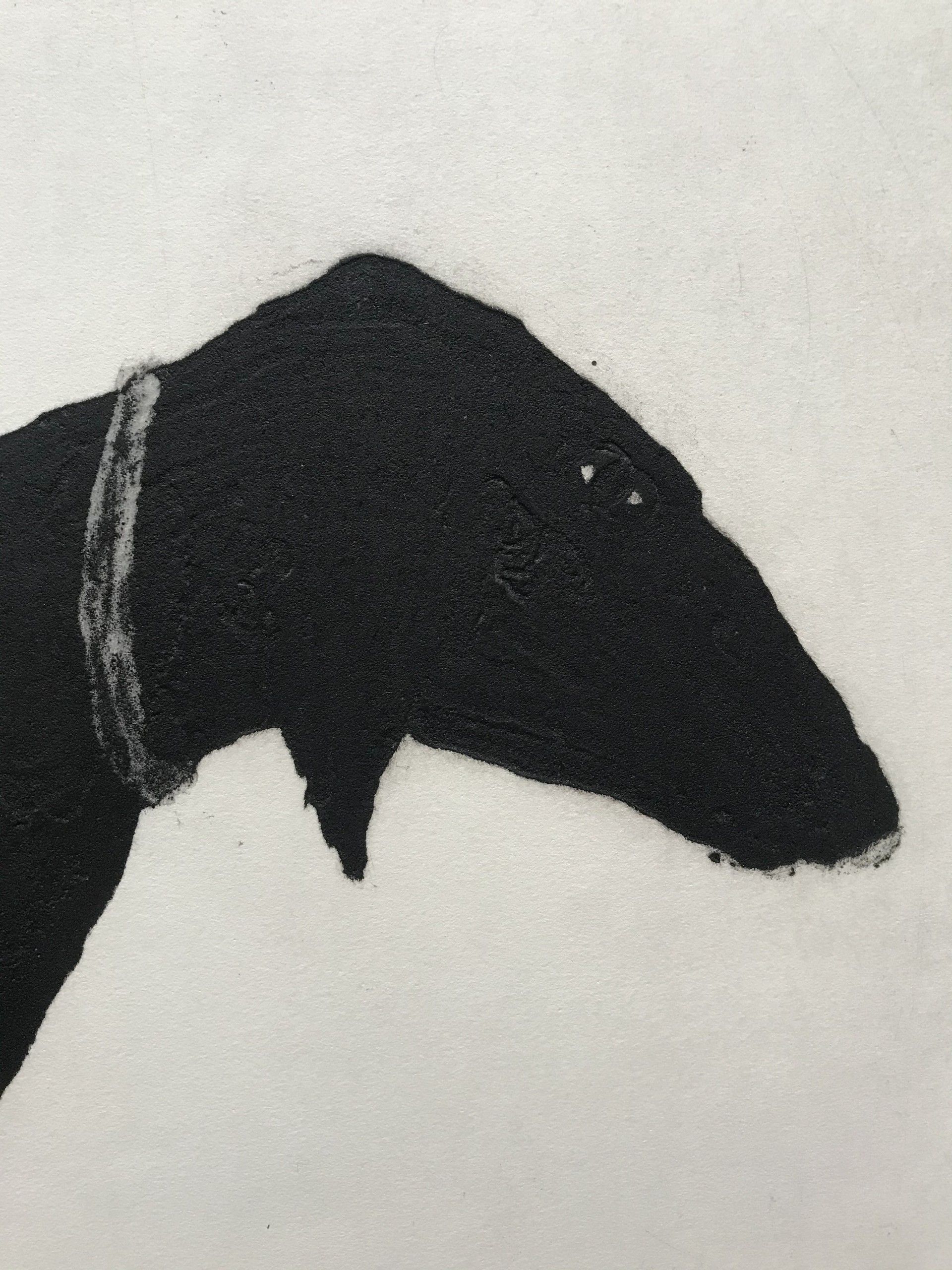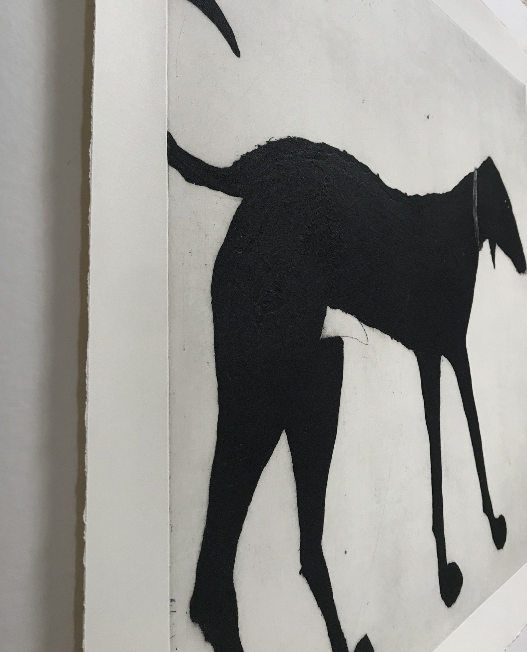 Black Dog is a limited edition drypoint etching with carborundum by Kate Boxer. This is a contemporary art print made using drypoint and carborundum of a standing black dog. Kate Boxer makes the plates in her studio which are then sent to to the master printmakers. After they have been