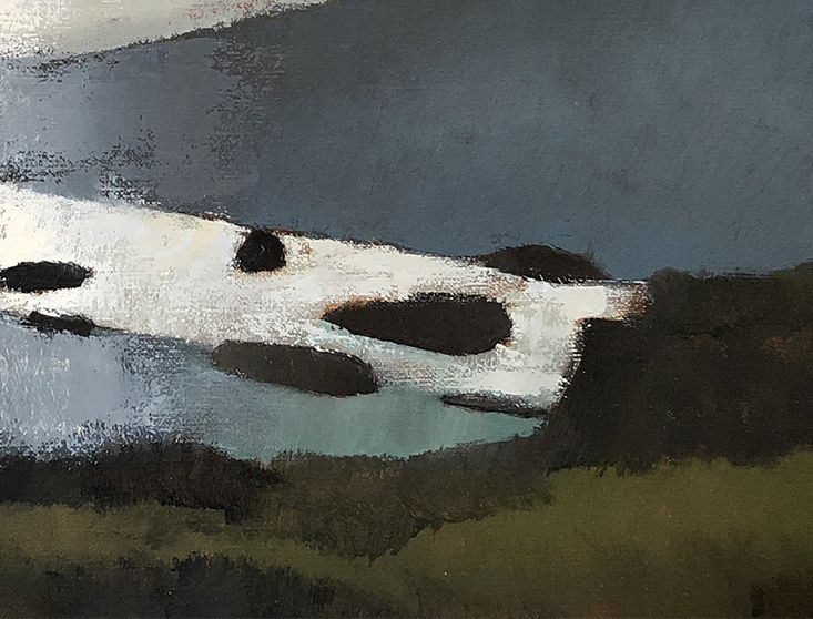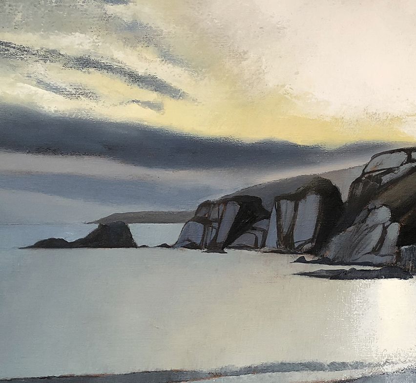 Blue Cliffs, Tim Woodcock-Jones. Landscape/seascape painting in oil on canvas. Canvas Size: H:60 cm W40cm Blue Cliffs depicts a beach near Bigbury in Devon at dusk. The contemporary style of this seascape piece is typical of Woodcock-Jones. Tim Woodcock-Jones is a full time painter and designer who has worked for various design groups,