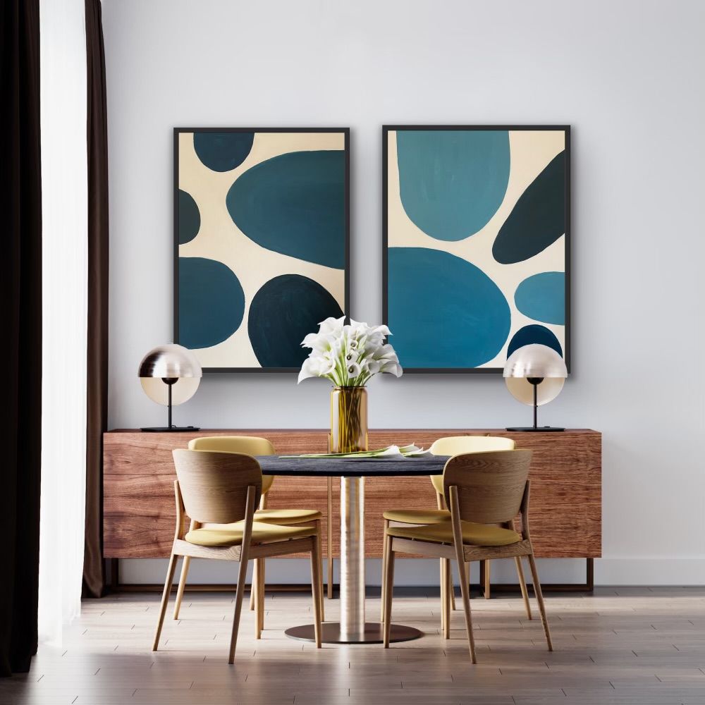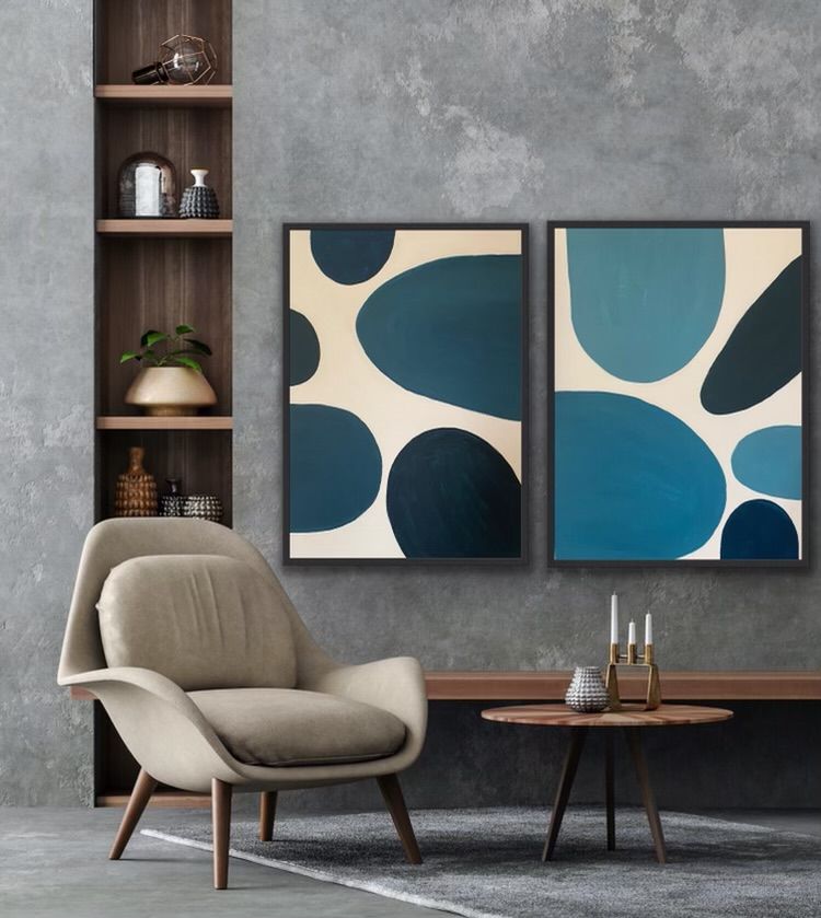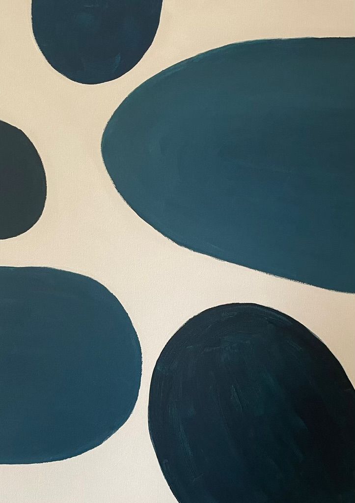 Complete size of diptych: H:190 x W:120cm x D:3.5cm Original contemporary abstract painting by Fleur Park. Blue Form 1 and 2 feature her signature monochromatic palette, exploring the relationship between spaces, form and colour in a geometric abstract way. In this piece the black circular formations appear to be moving through