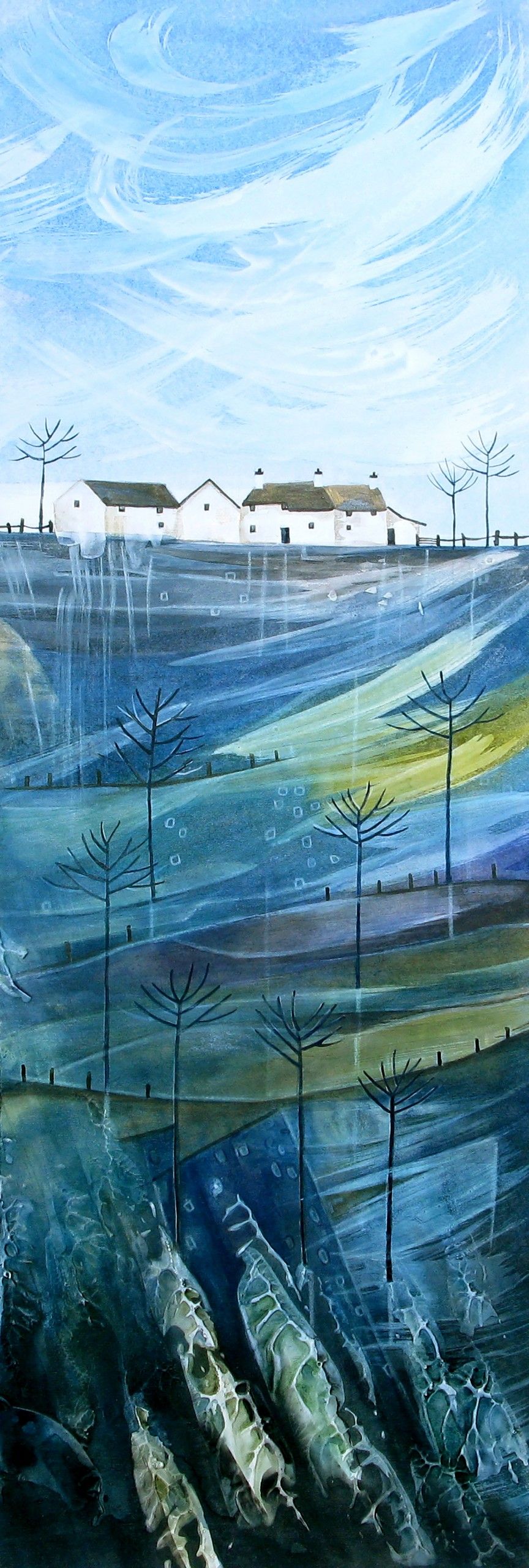 Blue Ridge Valley 2. Original landscape painting. Mixed Media on board (Gesso, acrylic and acrylic inks). Image Size. 47cm x 16cm. Framed size. 72cm x 40cm x 4cm. Sold framed – Beautifully framed in a triple white wooden moulding with non-reflective art glass. (Please note that in situ images are purely an indication of how a