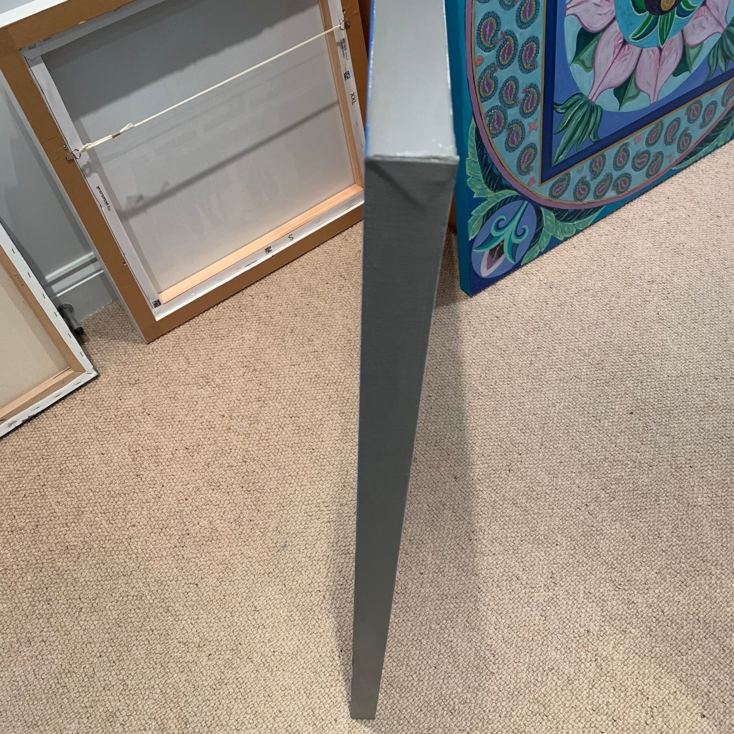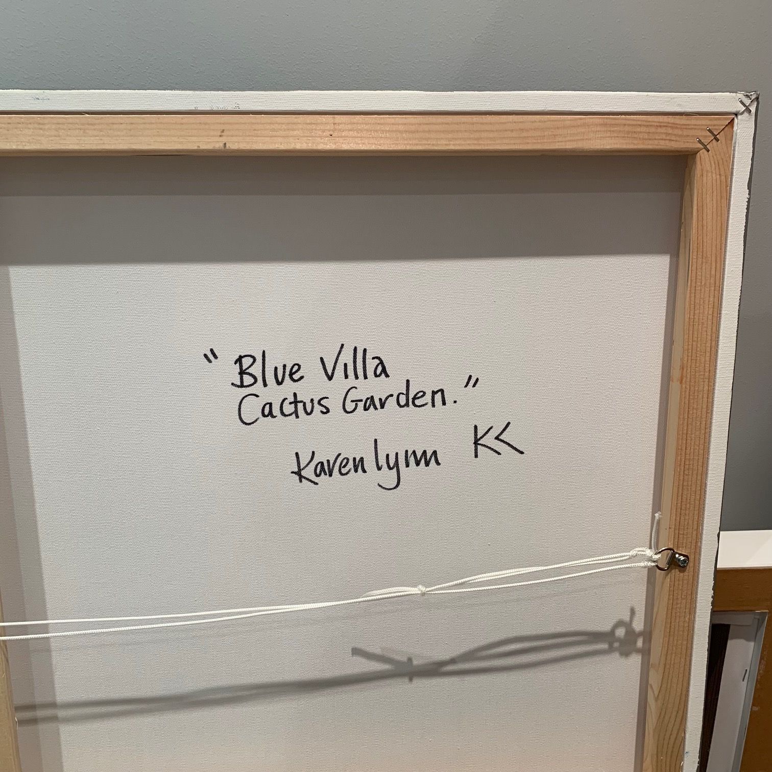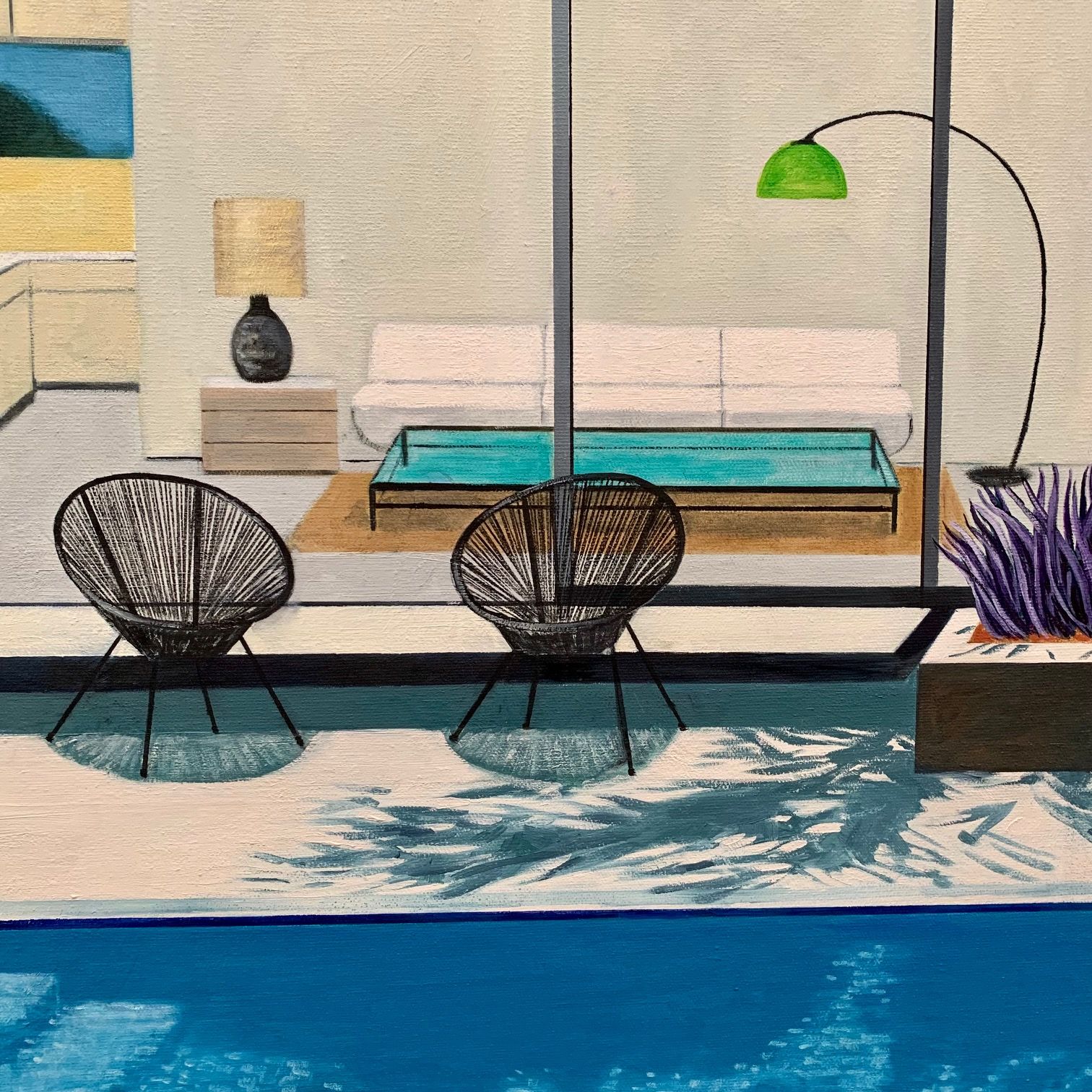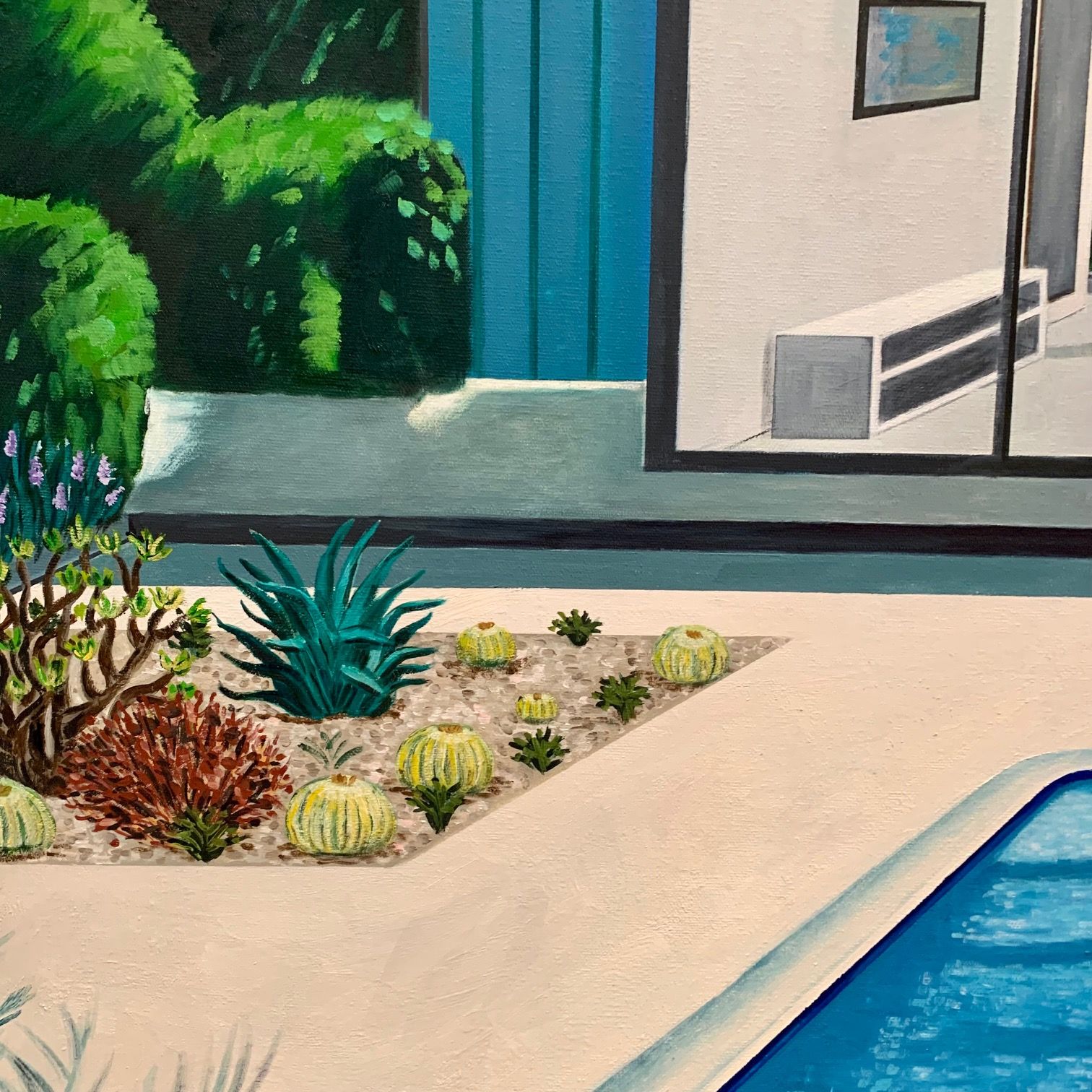 This is a painting from my series of modernist architectural paintings. In this particular painting I tried to capture the setting sun capturing the last rays of light across a lit up mid century modernist villa ,terrace and a shimmering pool. I love painting trees and cacti and they add splashes of