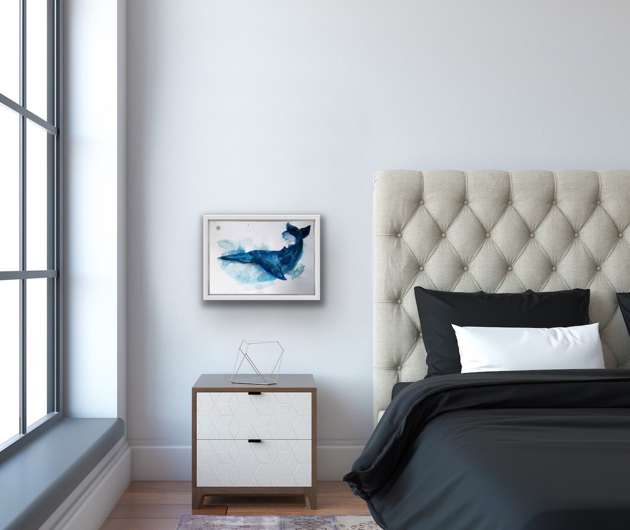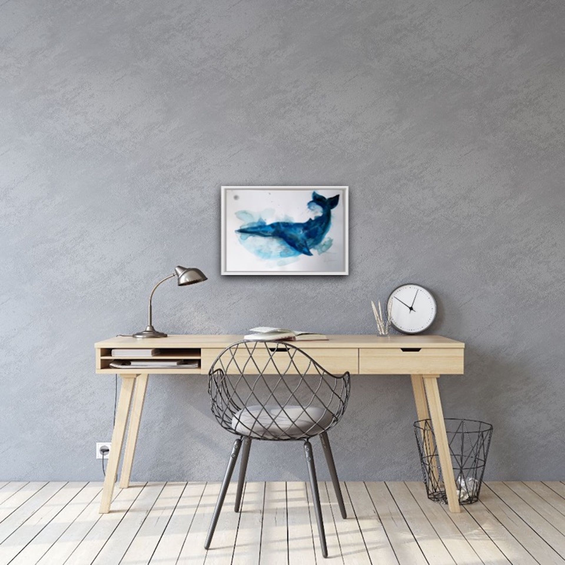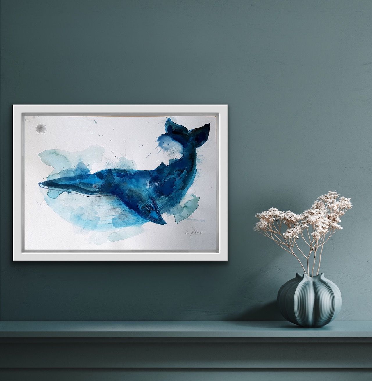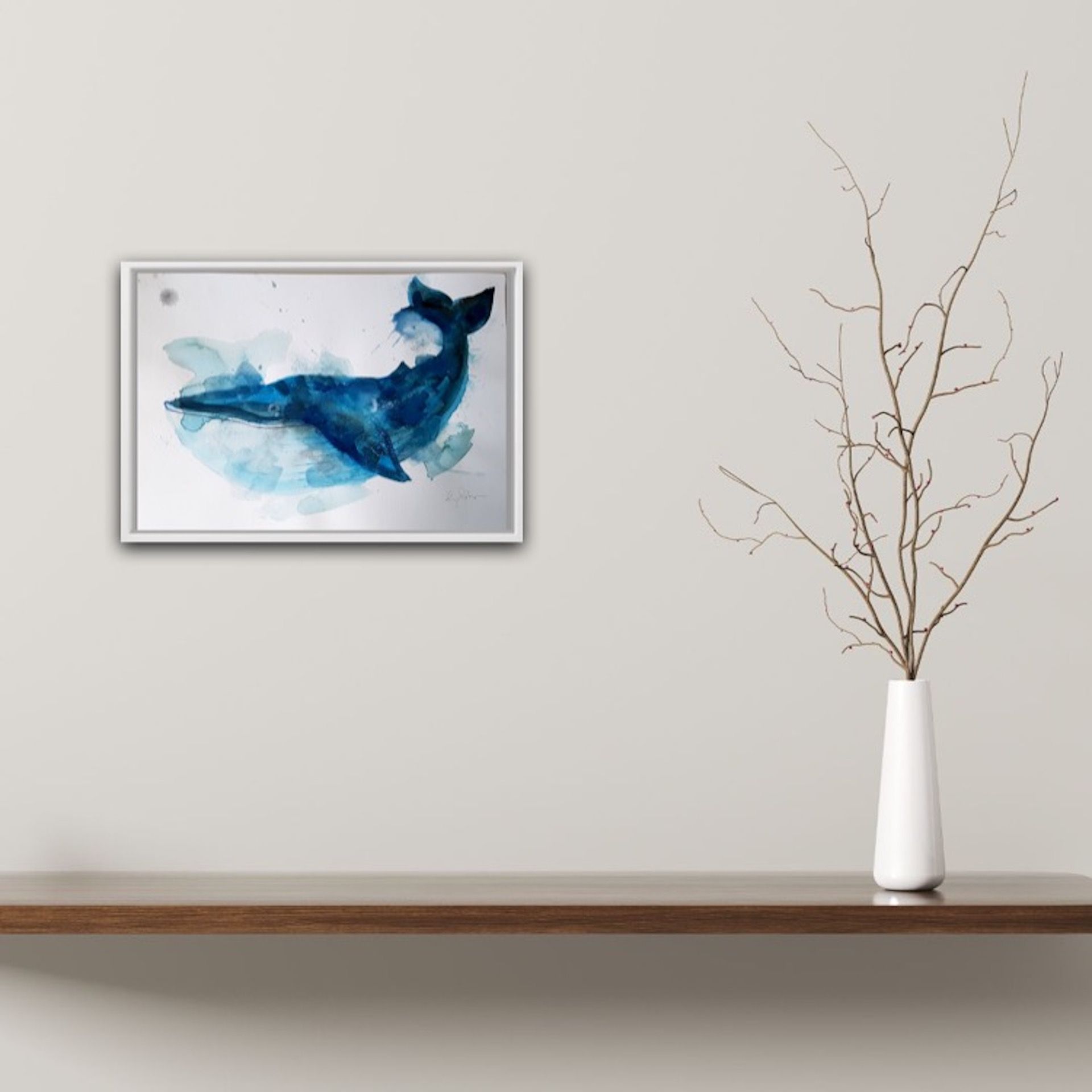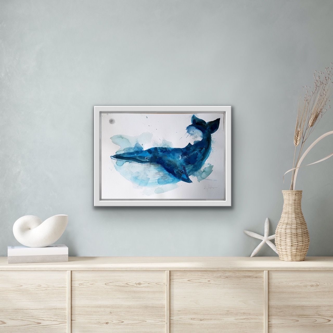 Gavin Dobson Blue Whale Original Animal Painting Watercolour Paint on Paper Sheet Size: H 29.7cm x W 42cm x D 0.1cm Sold Unframed Please note that in situ images are purely an indication of how a piece may look. Blue Whale is an impressionistic watercolour by Gavin Dobson. This is the original artwork for my Blue whale screen
