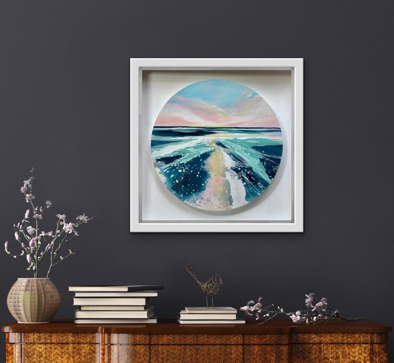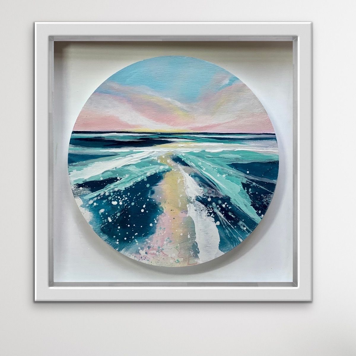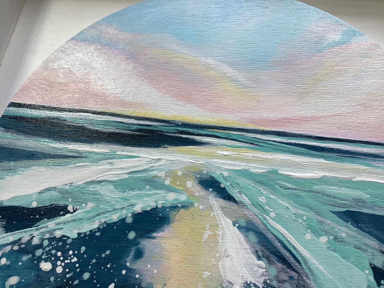Blushed Skies is an original seascape painting by artist Adele Riley. Adele love of colour and painting the Cornish coastline is evidence in this piece. A wonderful palette of chalky pastel hues is offset beautifully with Adele’s use of marine and aqua blues. This textural Tondo, with its thick