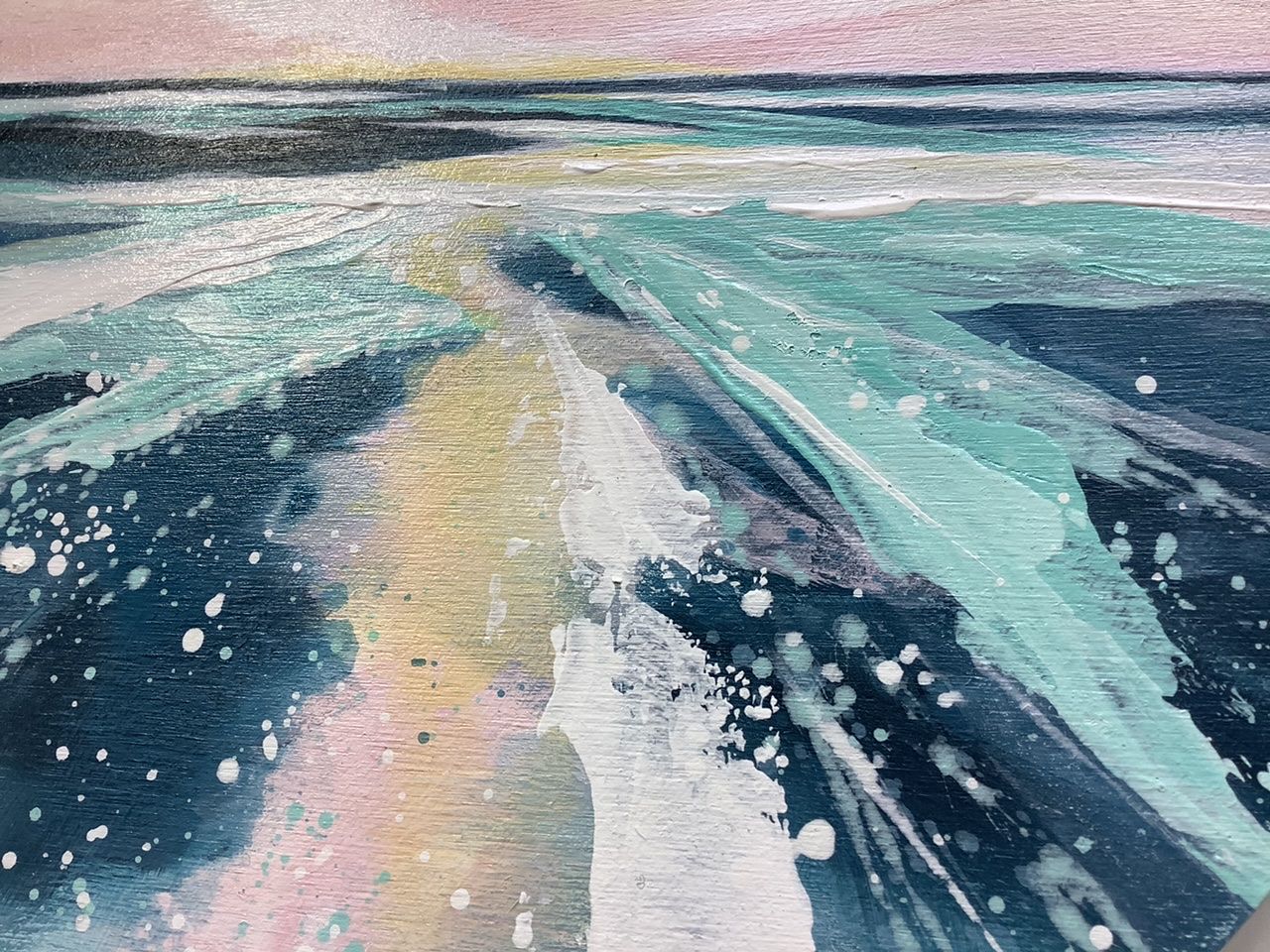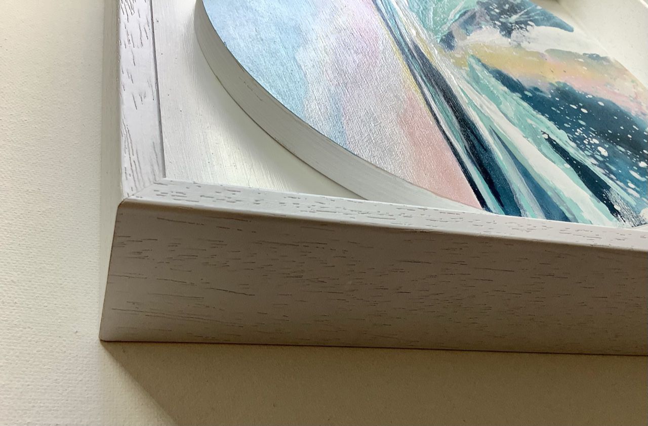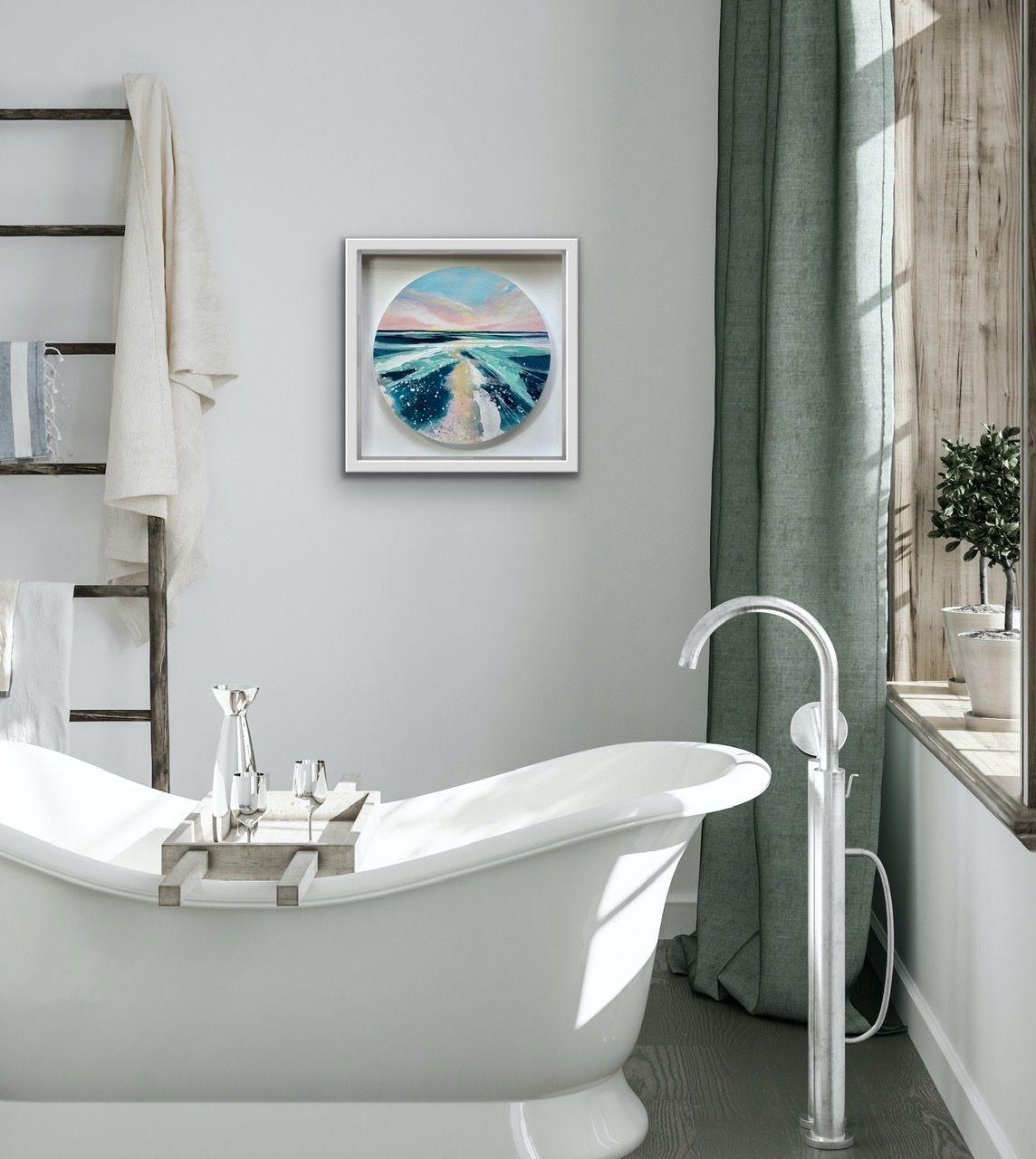 Blushed Skies is an original seascape painting by artist Adele Riley. Adele love of colour and painting the Cornish coastline is evidence in this piece. A wonderful palette of chalky pastel hues is offset beautifully with Adele’s use of marine and aqua blues. This textural Tondo, with its thick