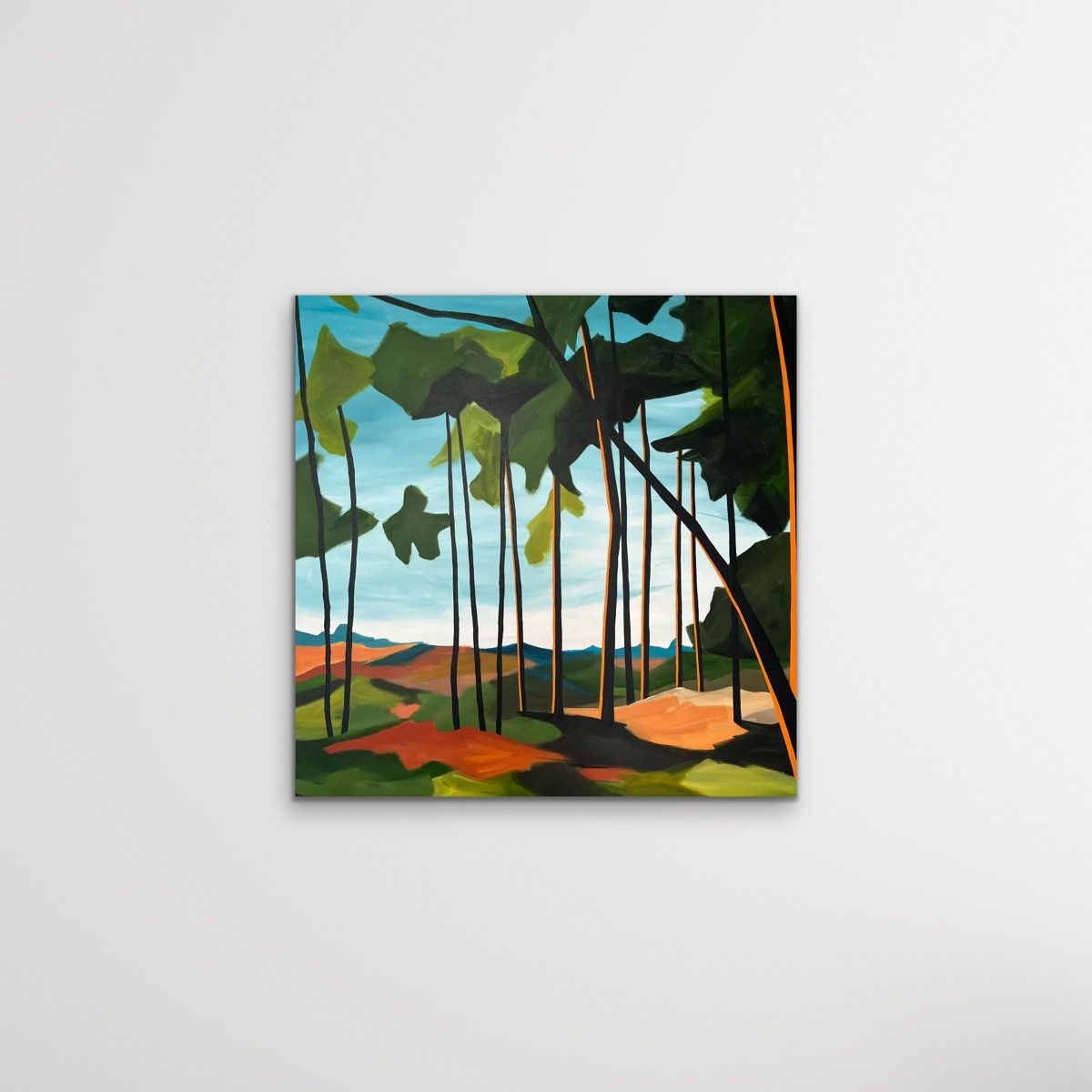 Bracken was inspired by a childhood haunt of Fionas’, Frensham Ponds in Surrey. It was originally designed on the ipad. Breaking the scene down into shapes and then planning the palette and composition is key before being let loose on to the final piece. The paints are mixed