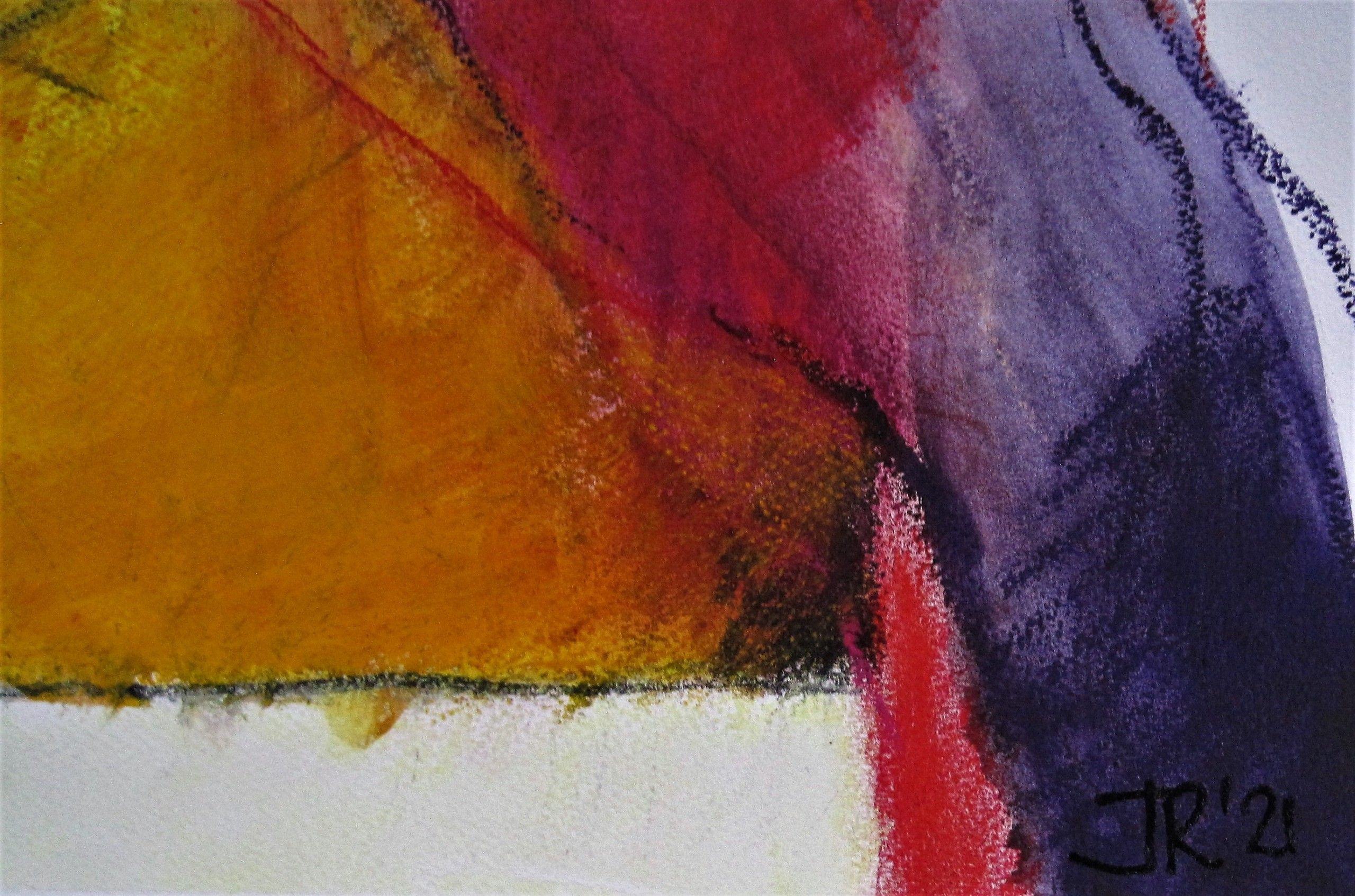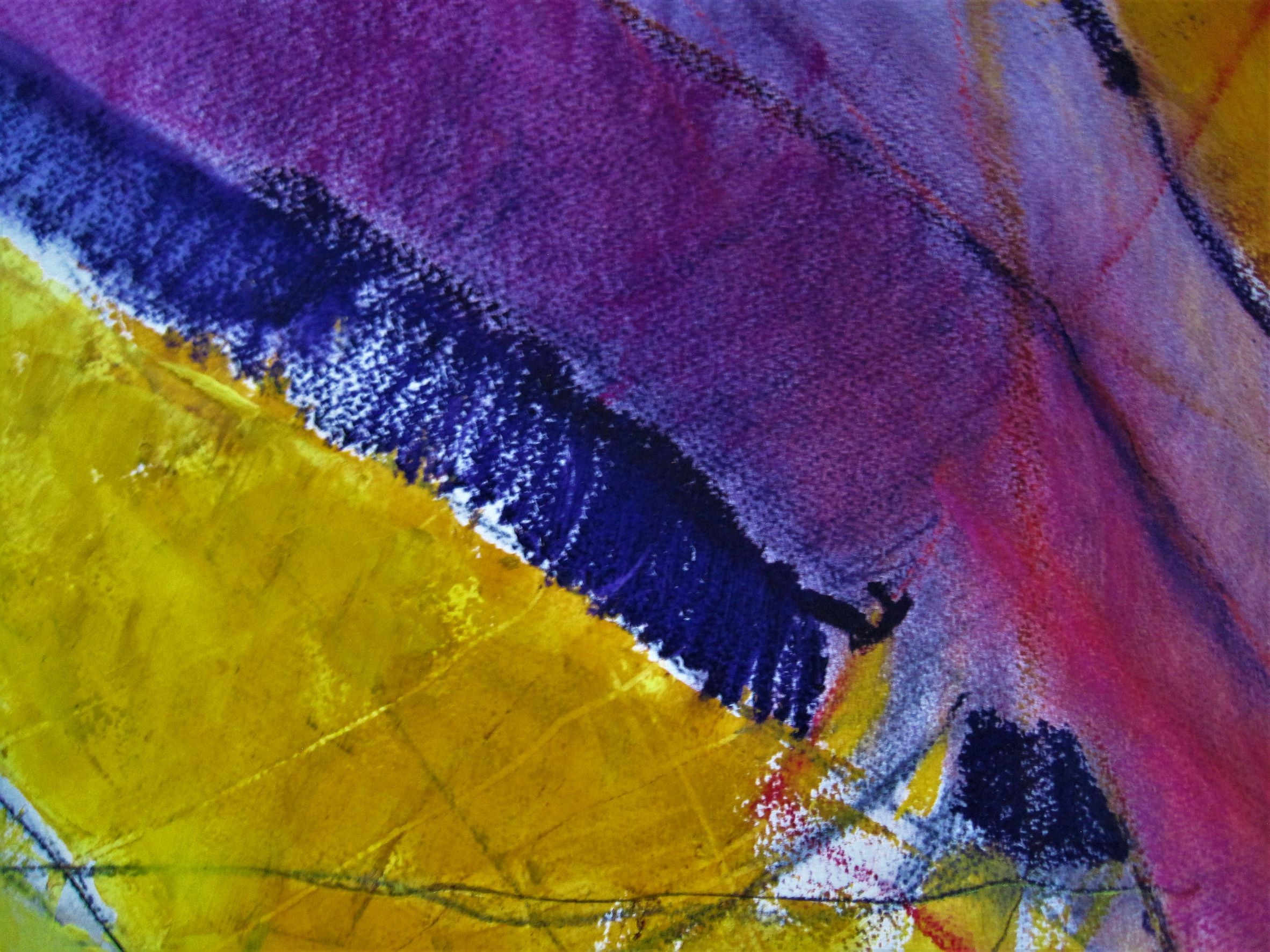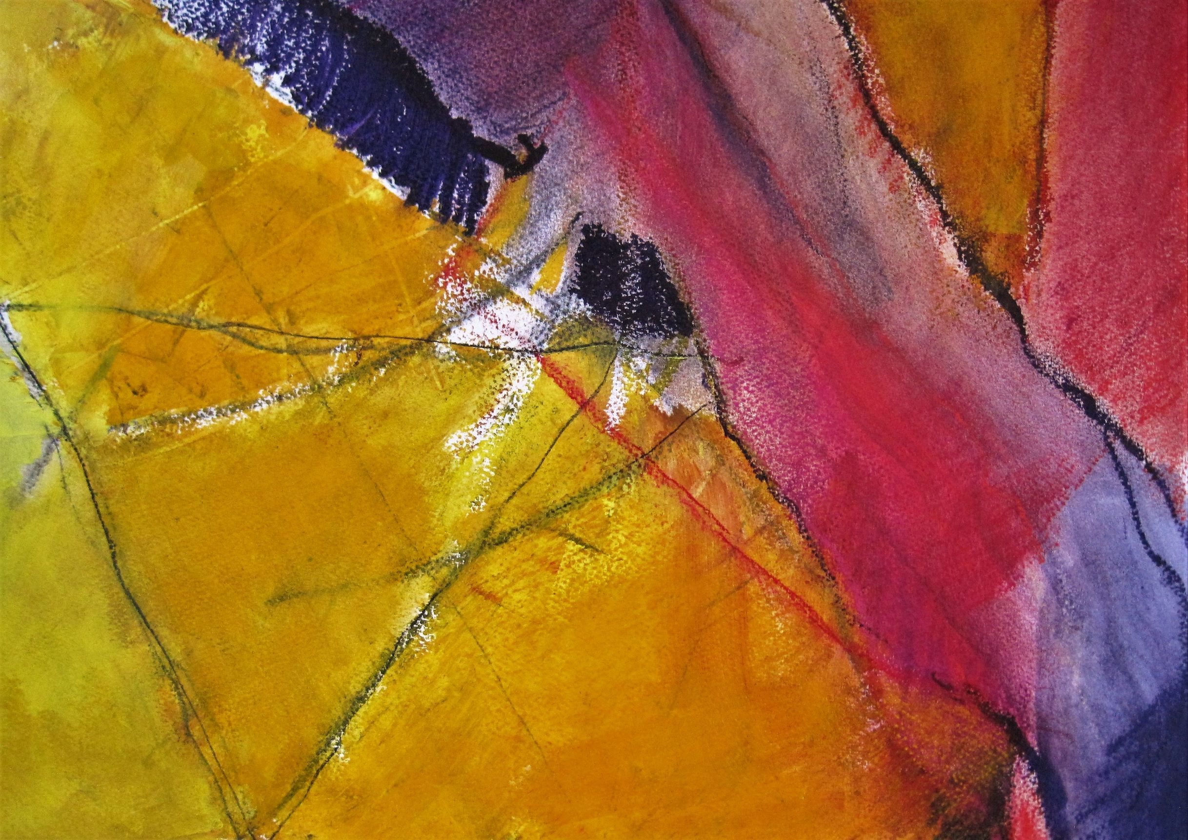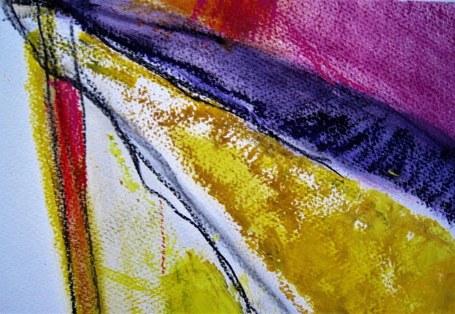 This is one of a series of abstract multi-media paintings that have emerged of walks through neighbouring woods and peering out to open fields. The painting is also my response to the impact of wind. The colour palette reflects the usage of pastels, and the bright colours and abstract nature