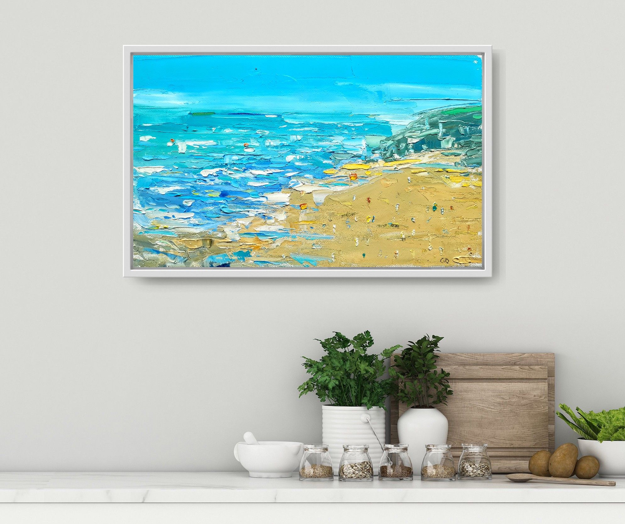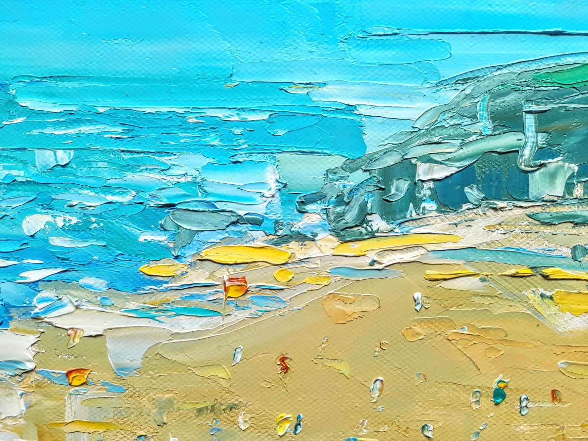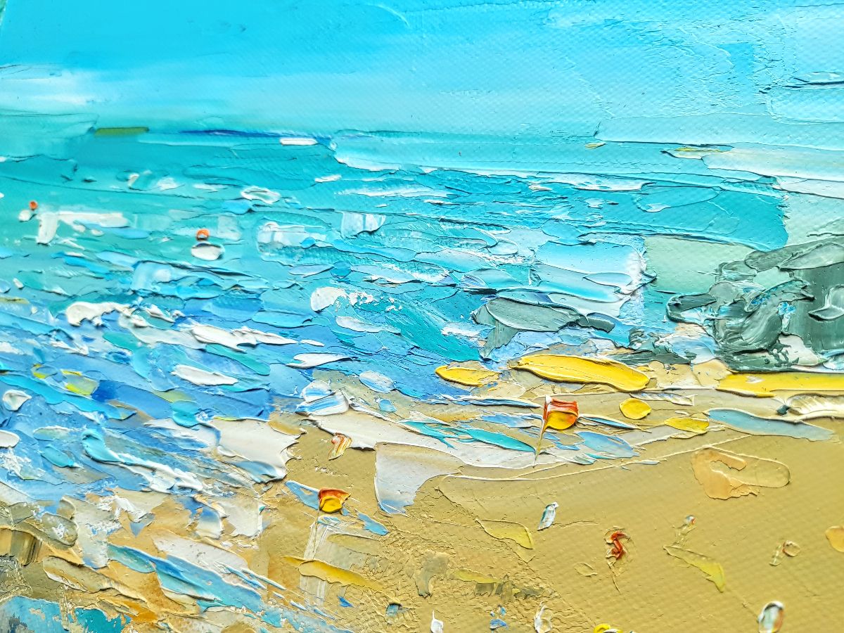 A 32x20cm palette knife oil painting on canvas painted en plein air on Bude beach in Cornwall. The unpredictable marks produced by the palette knife are perfect for conveying the movement of the sea, creating a lot of texture in the process. The vibrant colour palette conveys the energy of
