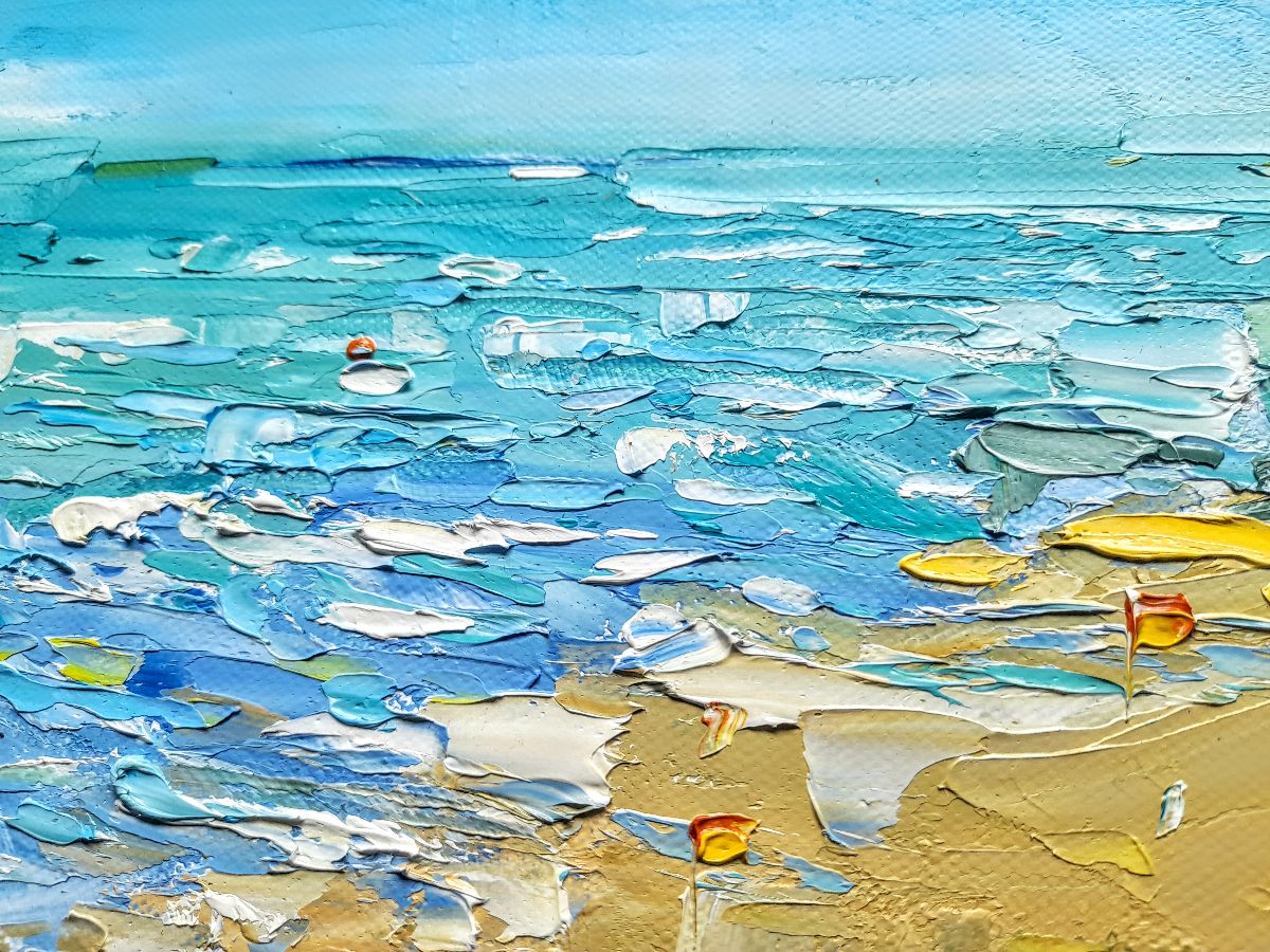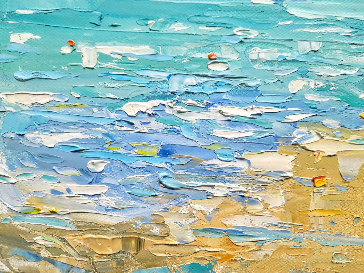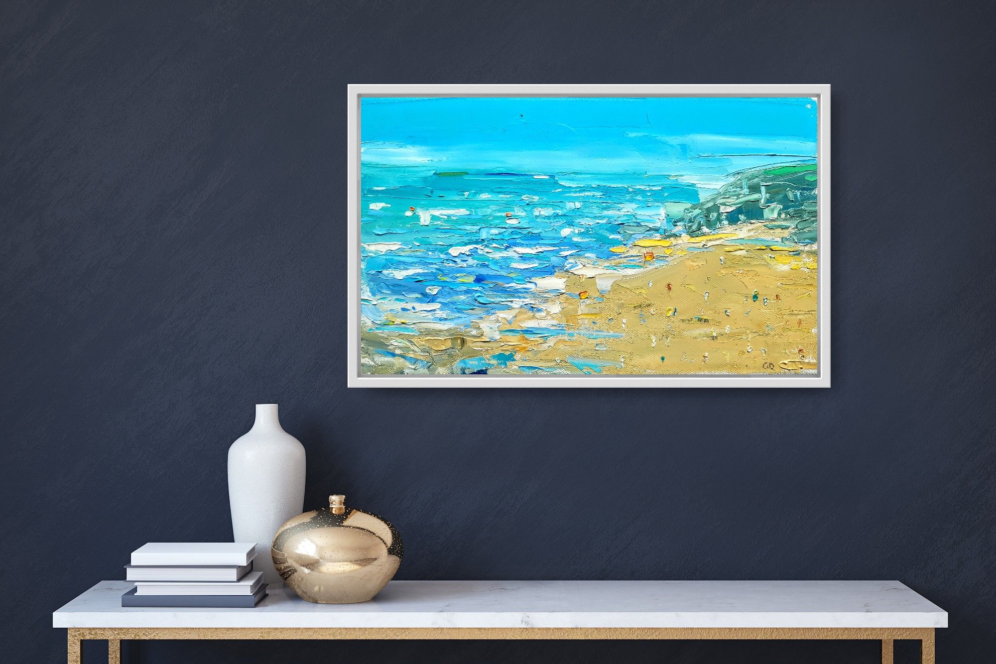 A 32x20cm palette knife oil painting on canvas painted en plein air on Bude beach in Cornwall. The unpredictable marks produced by the palette knife are perfect for conveying the movement of the sea, creating a lot of texture in the process. The vibrant colour palette conveys the energy of