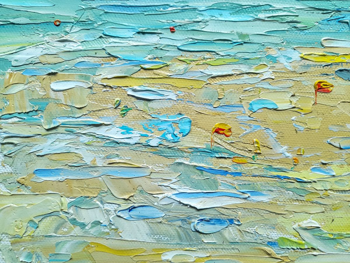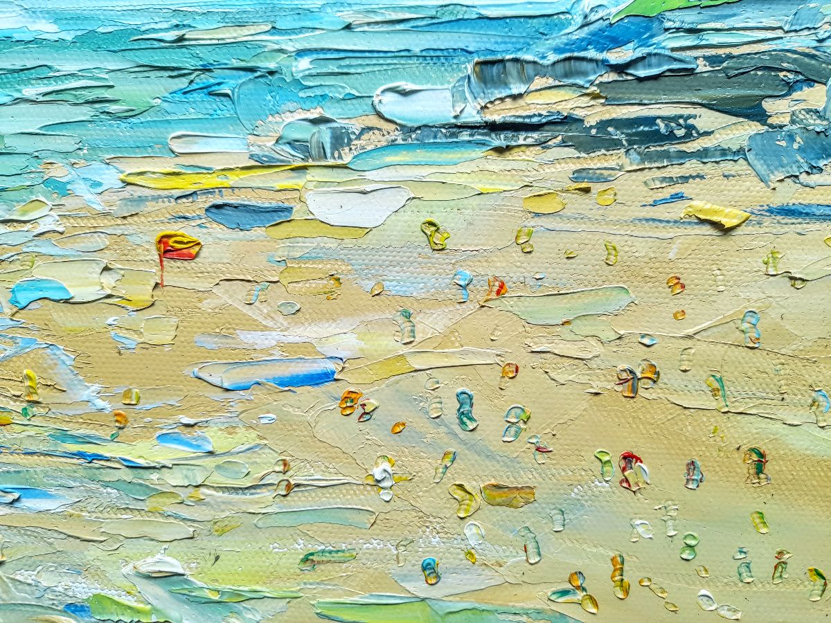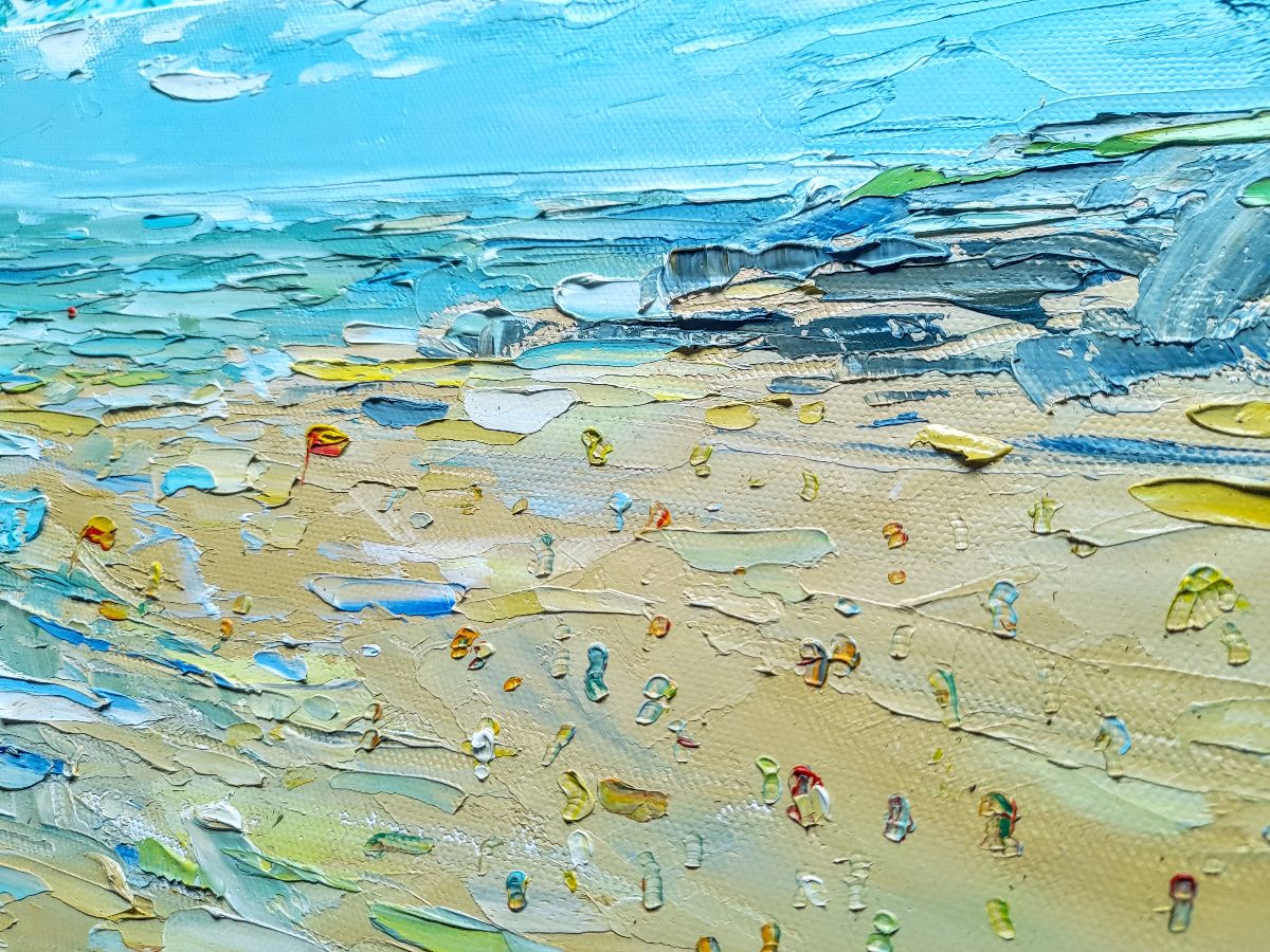 A 32x20cm palette knife oil painting on canvas painted en plein air on Bude beach in Cornwall. The unpredictable marks produced by the palette knife are perfect for conveying the movement of the sea, creating a lot of texture in the process. The vibrant colour palette conveys the energy of