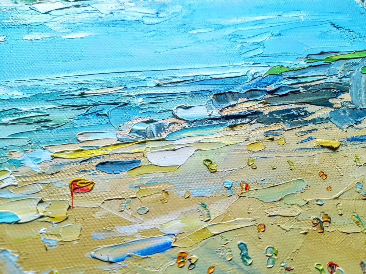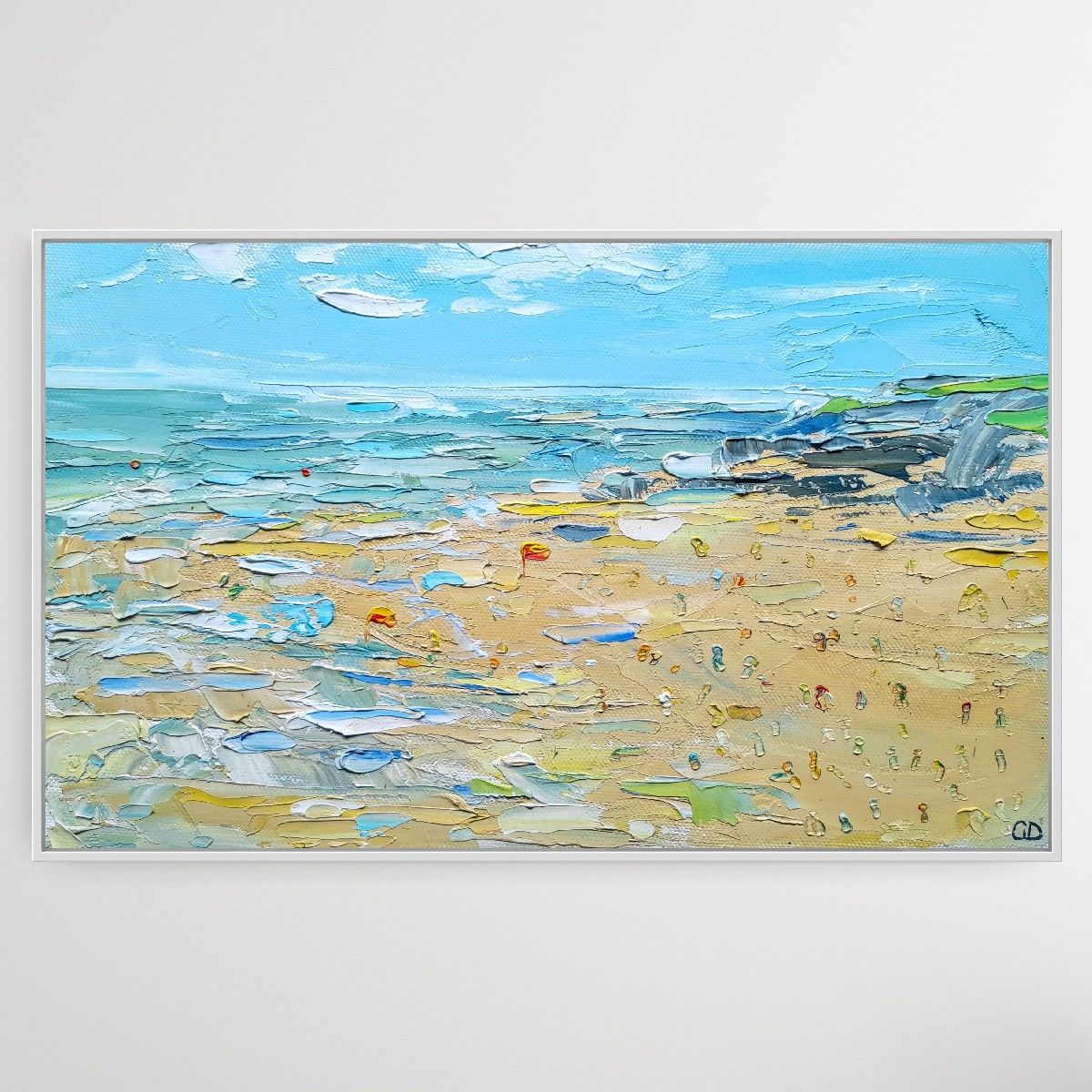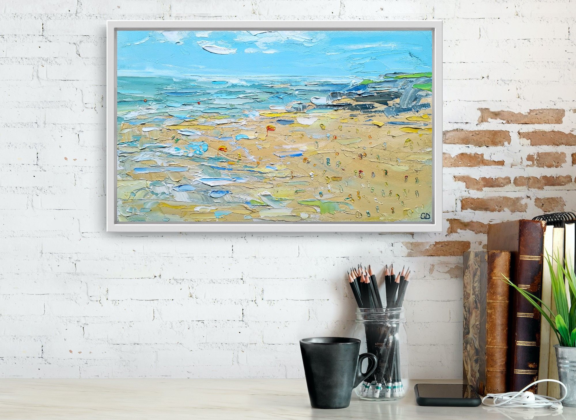 A 32x20cm palette knife oil painting on canvas painted en plein air on Bude beach in Cornwall. The unpredictable marks produced by the palette knife are perfect for conveying the movement of the sea, creating a lot of texture in the process. The vibrant colour palette conveys the energy of