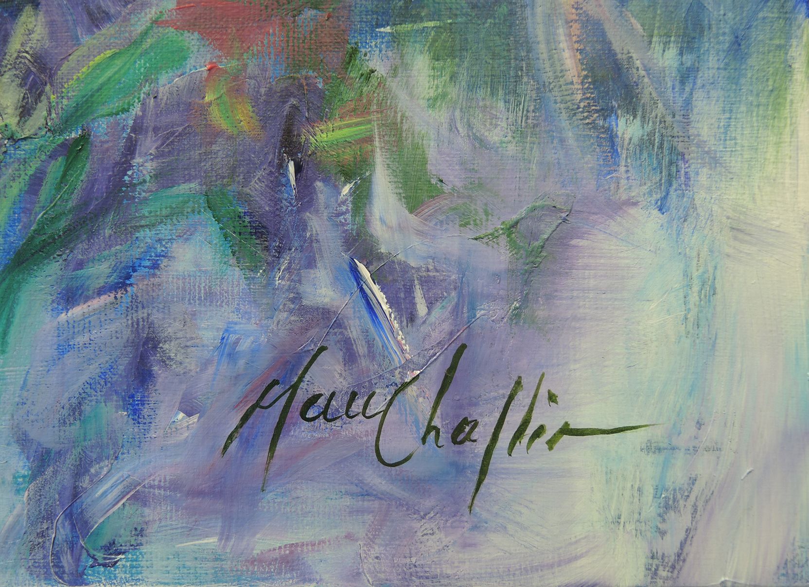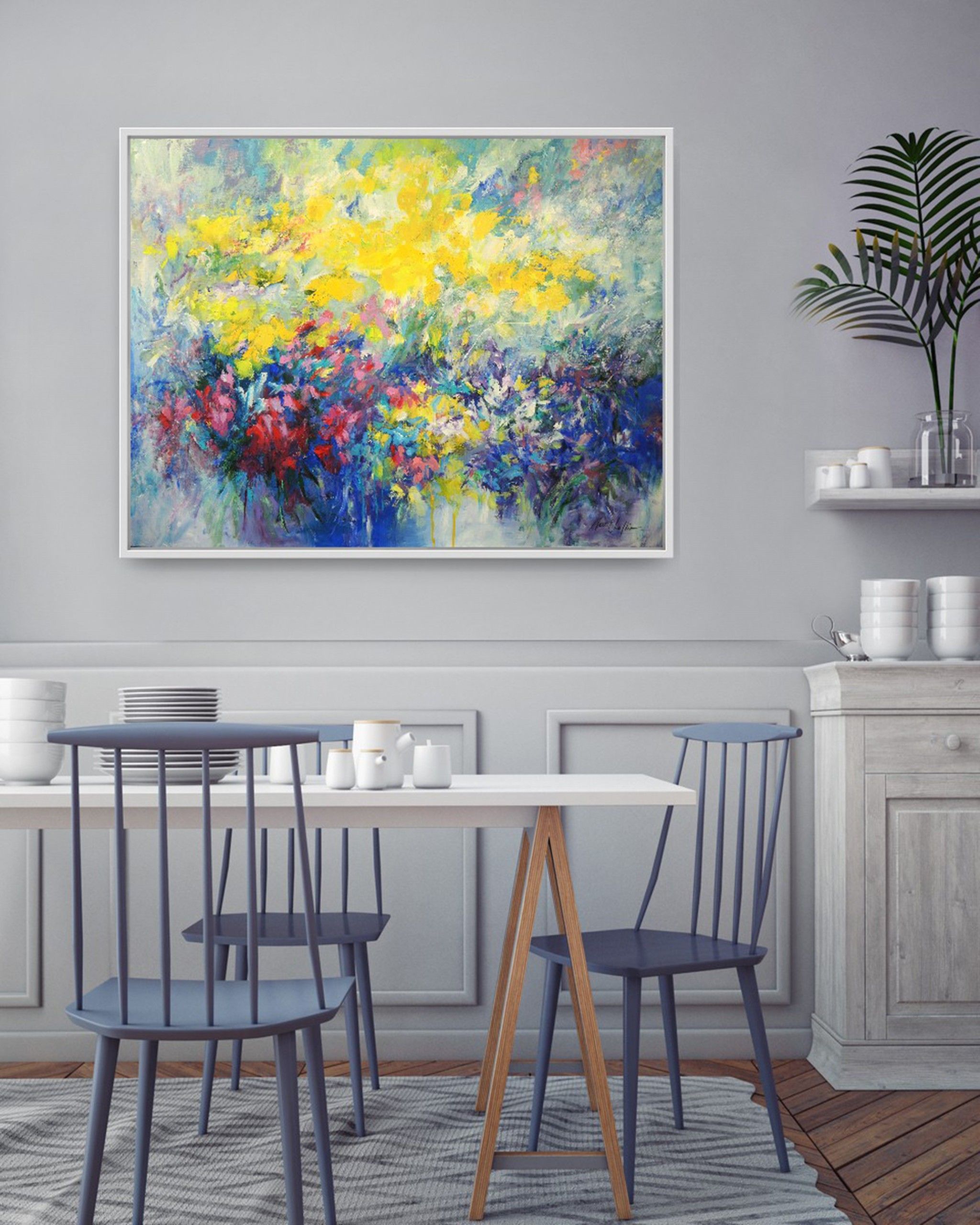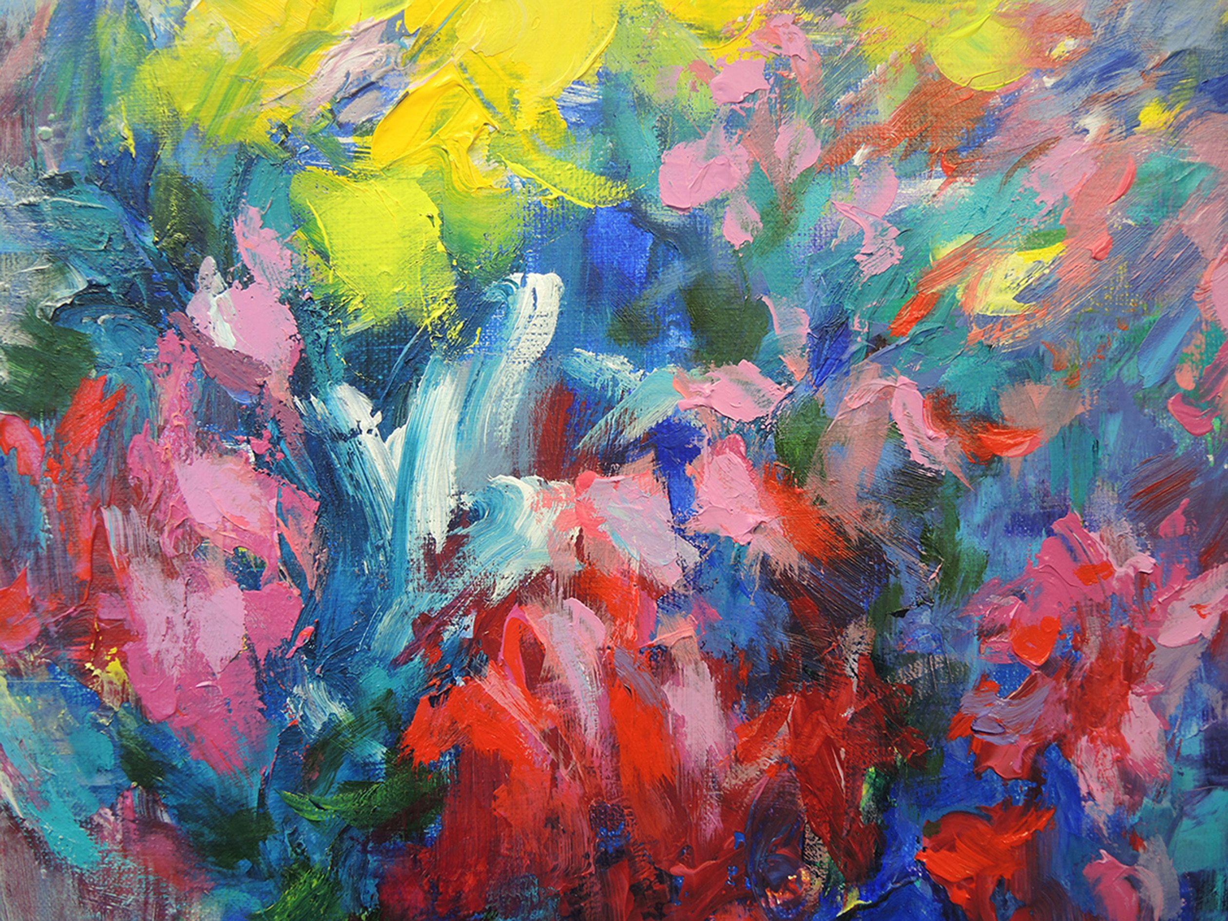 Butterflies paradise' Large semi-abstract painting Artist Mary Chaplin is passionate about gardening and spends a lot of time observing life in her garden where many insects are attracted by the different varieties of flowers. 'Butterflies paradise' is a work inspired by her garden. More than a figurative achievement, the artist prefers