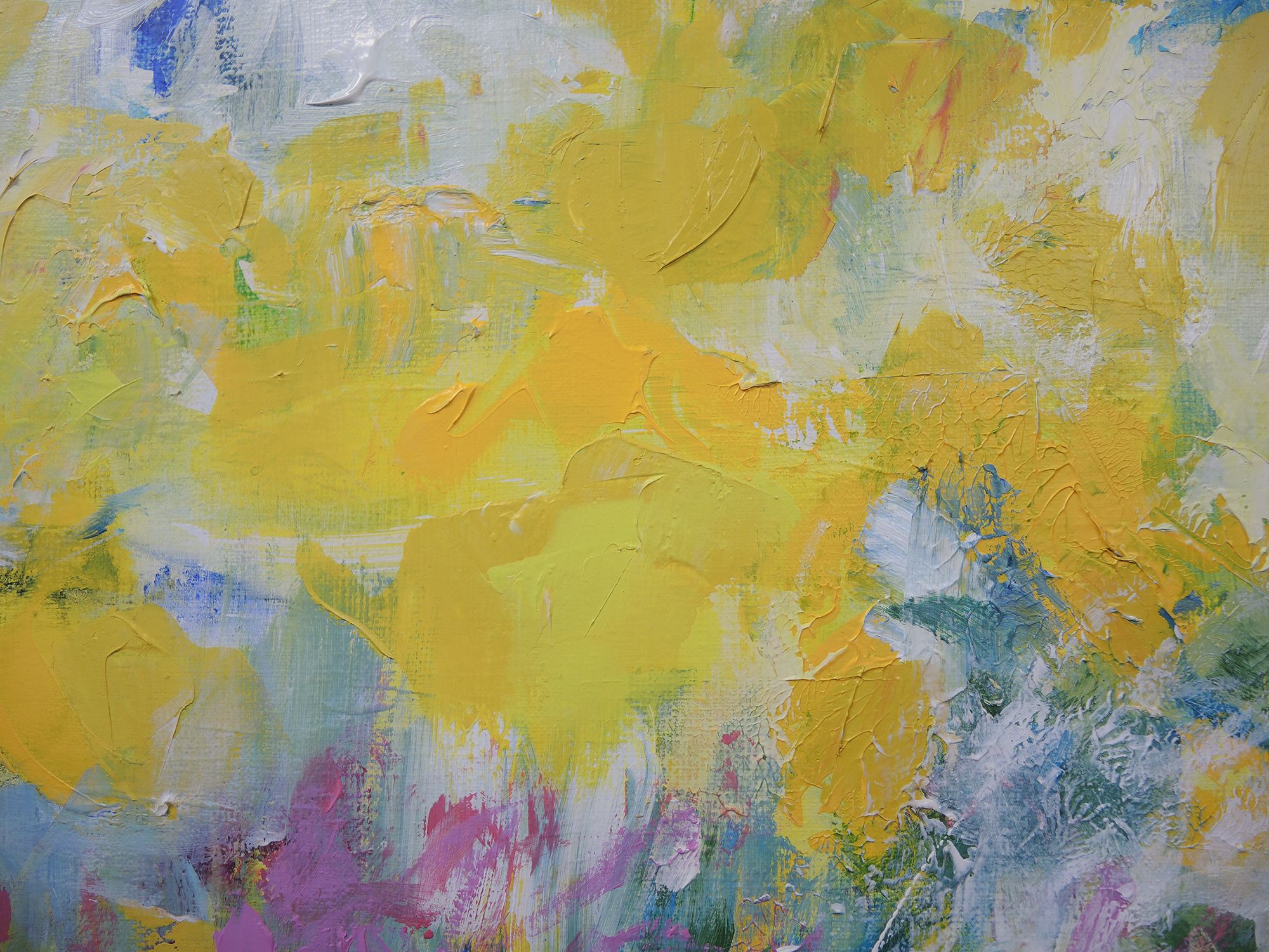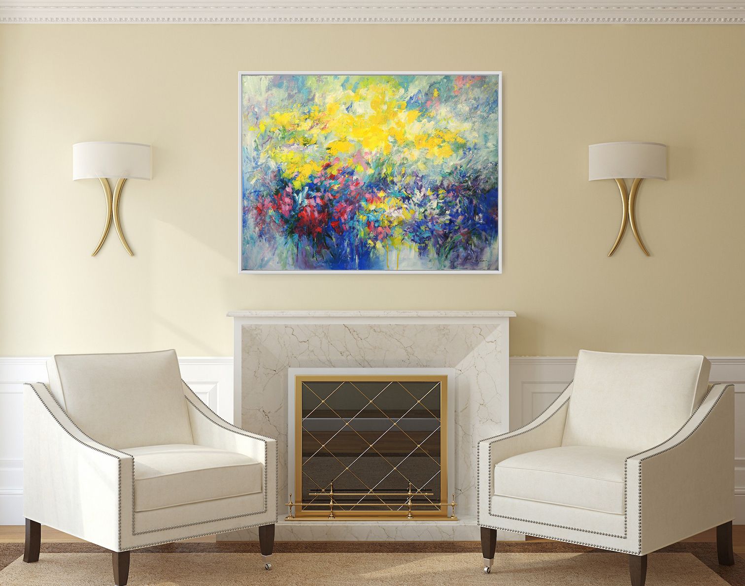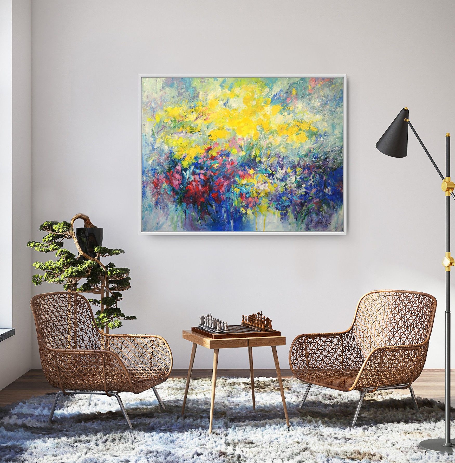 Butterflies paradise' Large semi-abstract painting Artist Mary Chaplin is passionate about gardening and spends a lot of time observing life in her garden where many insects are attracted by the different varieties of flowers. 'Butterflies paradise' is a work inspired by her garden. More than a figurative achievement, the artist prefers