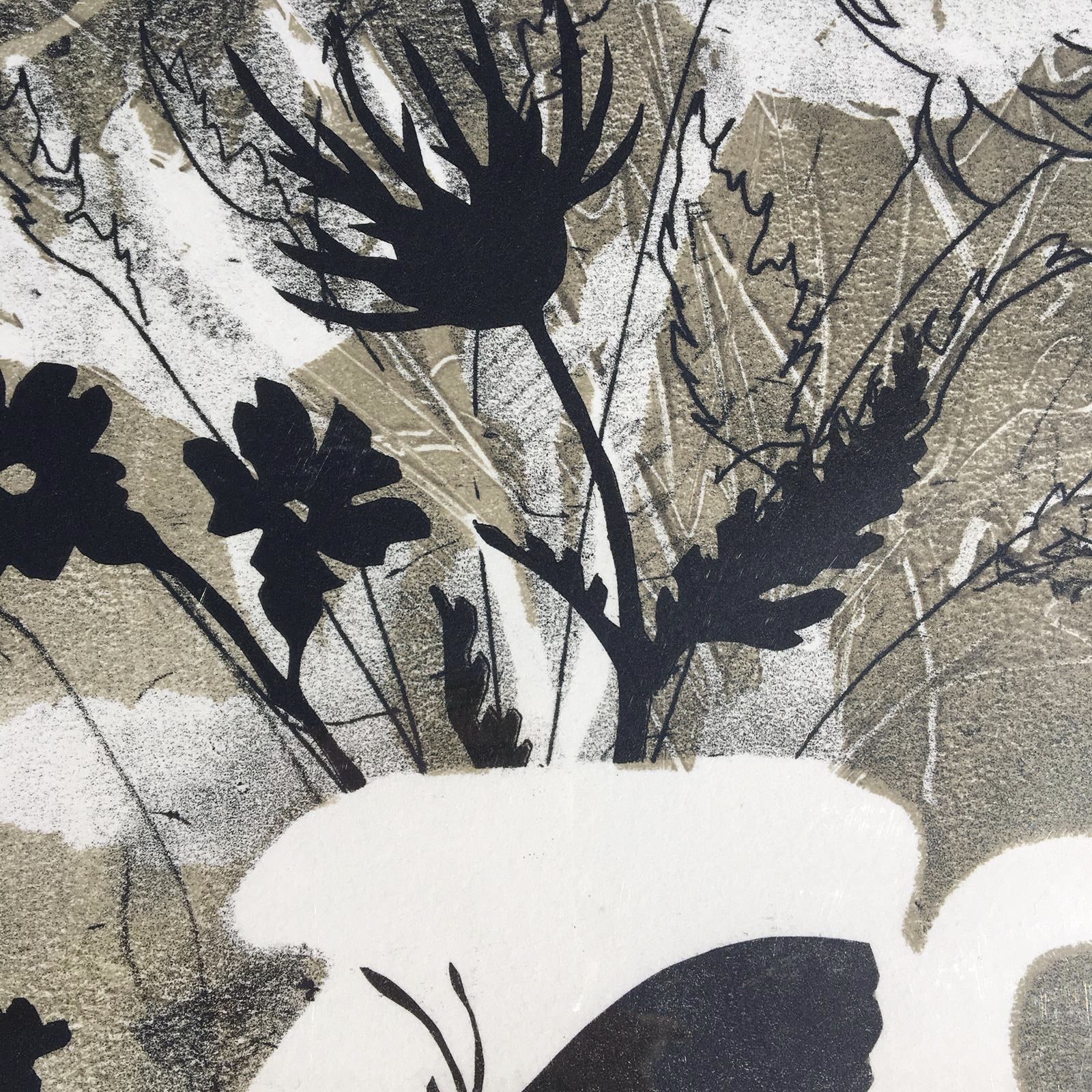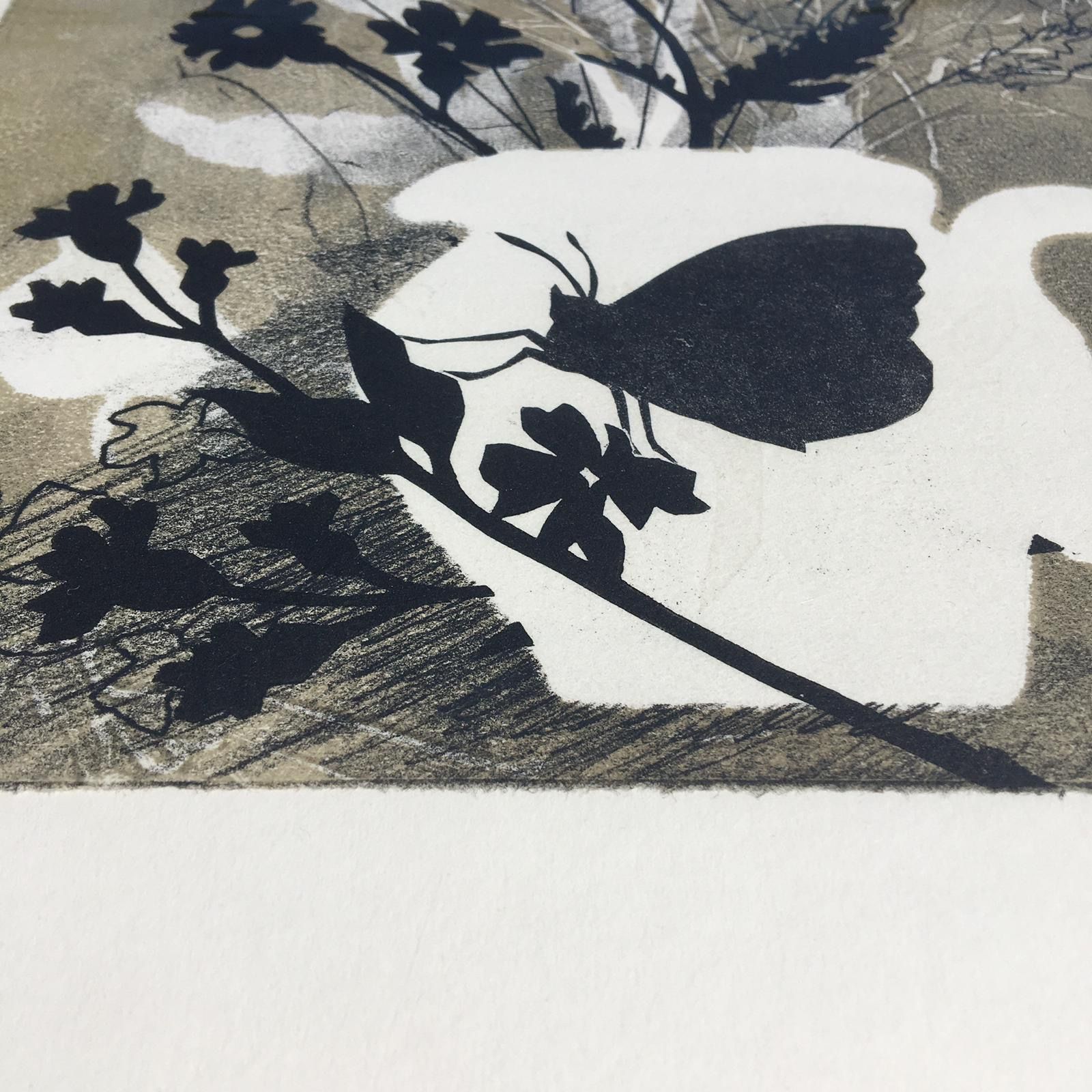 Rosemary Farrer Butterfly Campion Limited Edition Print Image Size: H 30cm x W 21cm Sheet Size: H 40cm x W 31cm Signed Sold Unframed 'Butterfly on Campion' is a still life of wild flowers by Rosemary Farrer. It is made using an unusaul combination of media including Mono Type, stencils and transfer drawing