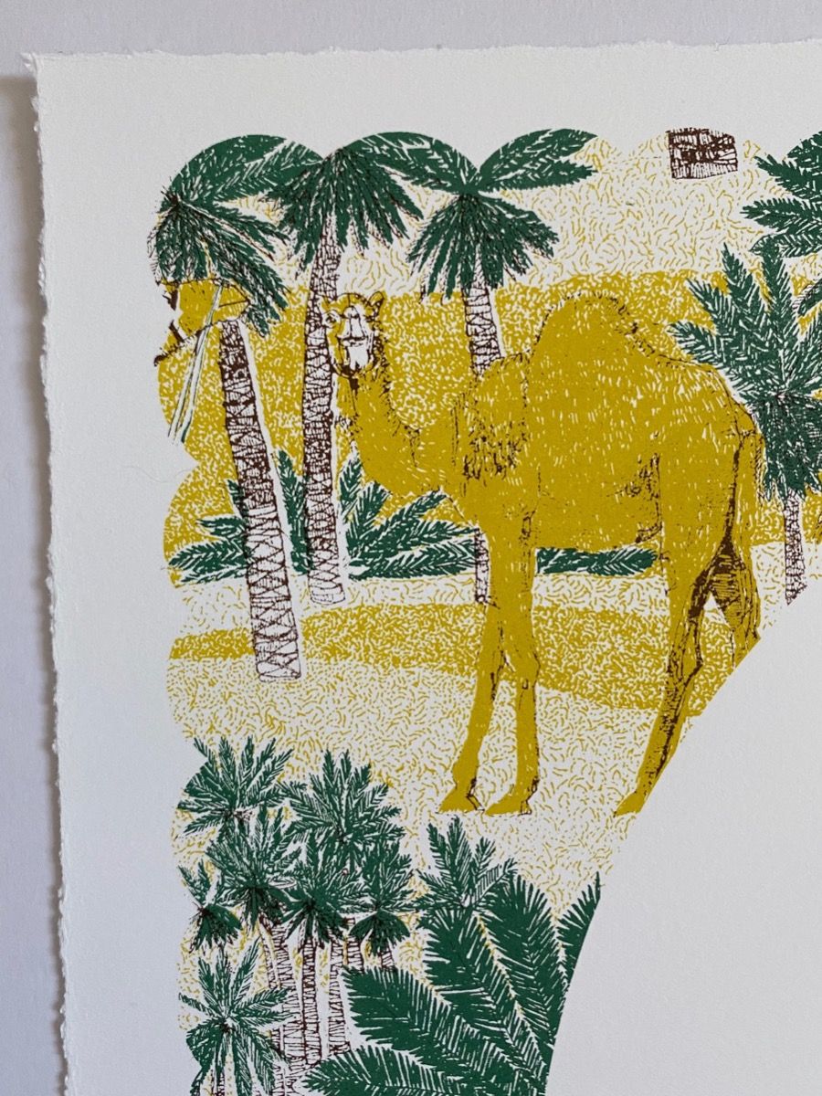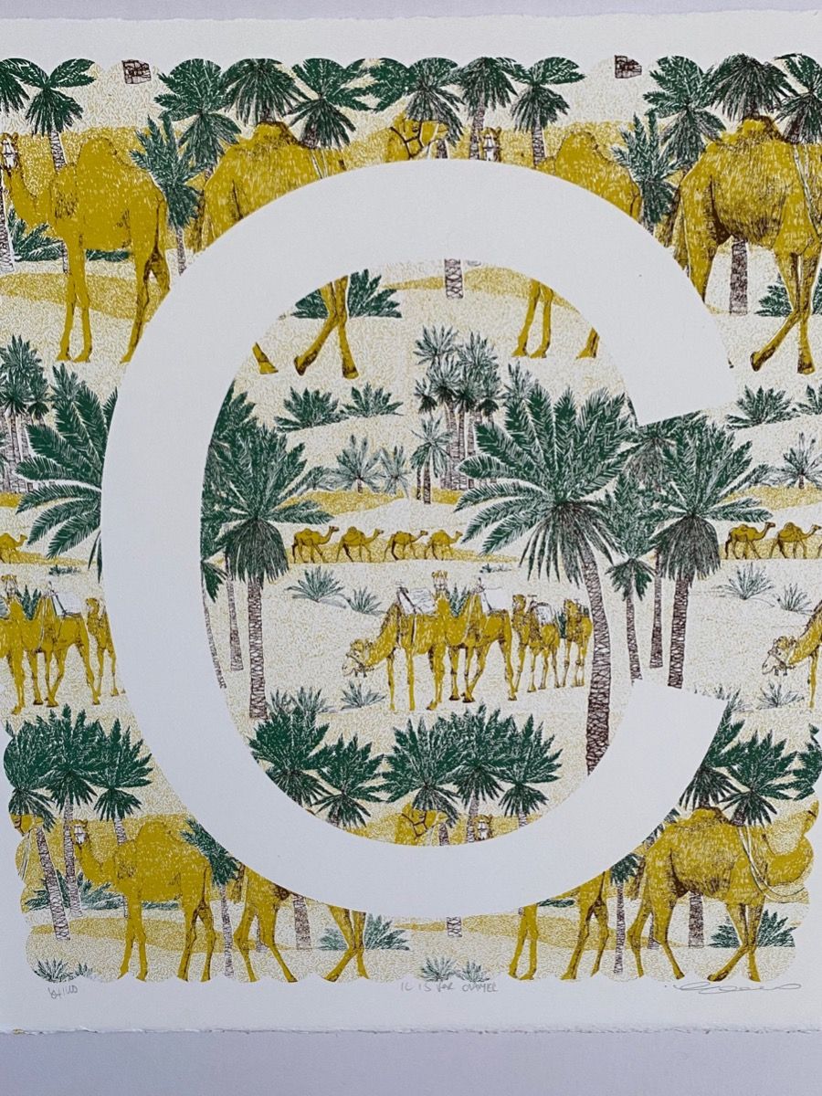Clare Halifax C is for Camel Limited Edition 3 Colour Silkscreen Print Edition of 100 Image Size: H 35cm x W 35cm Sheet Size: H 37cm x W 38cm x D 0.1cm Sold Unframed (Please note that in situ images are purely an indication of how a piece may look) The process involved in producing a print starts