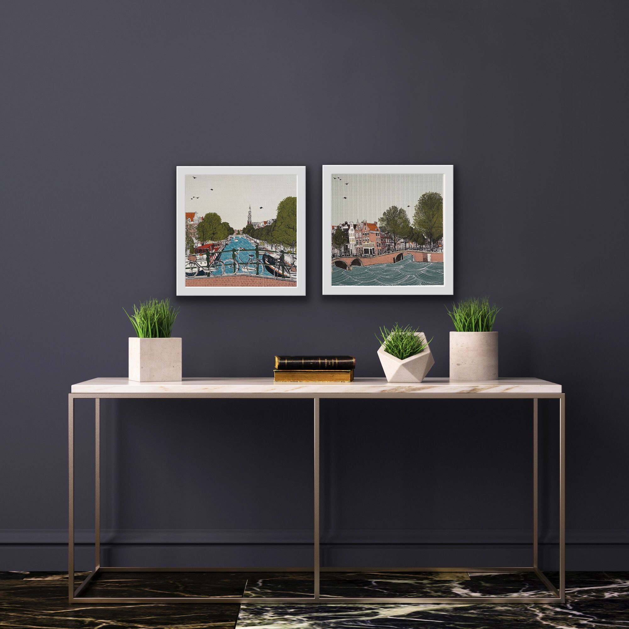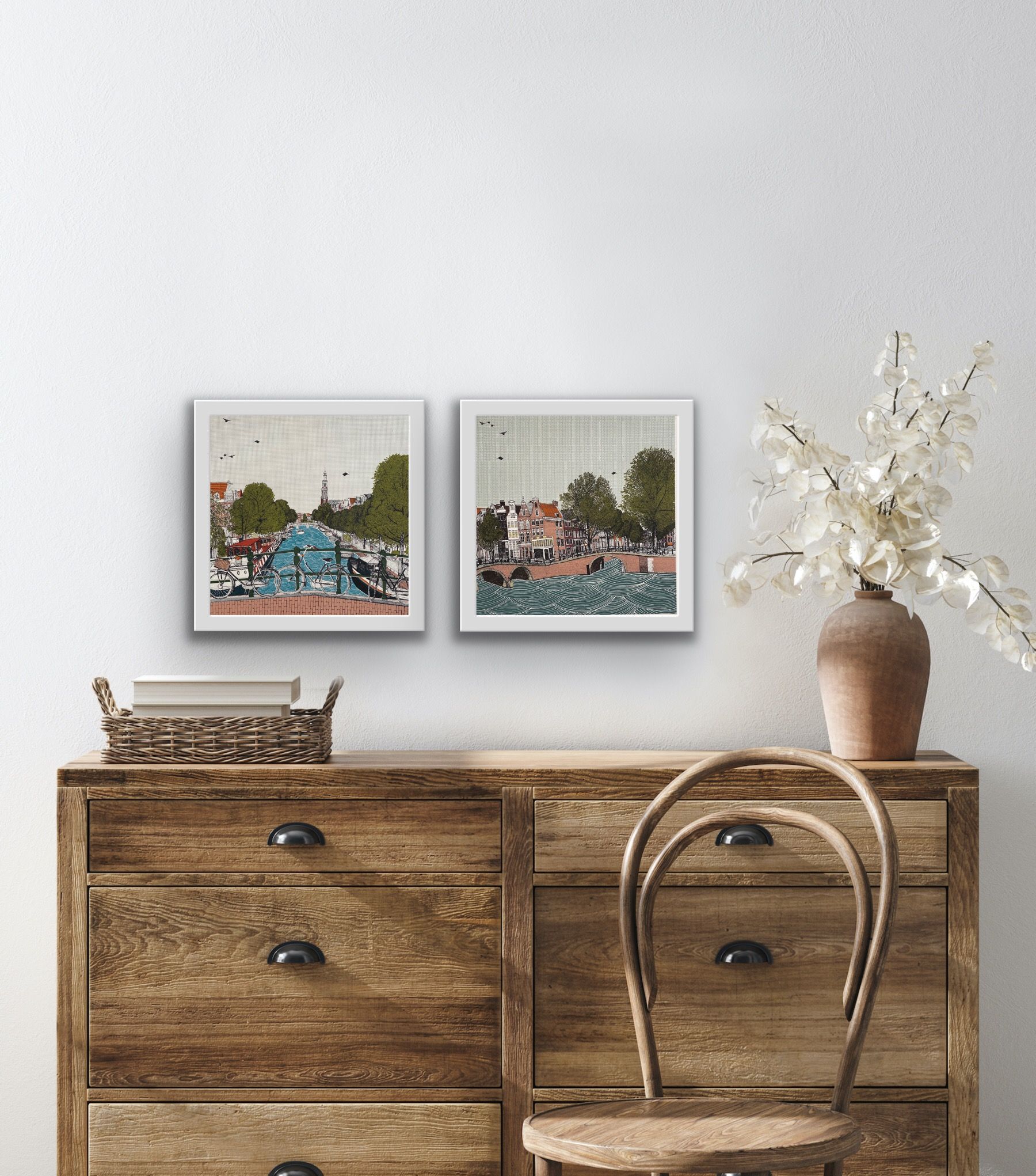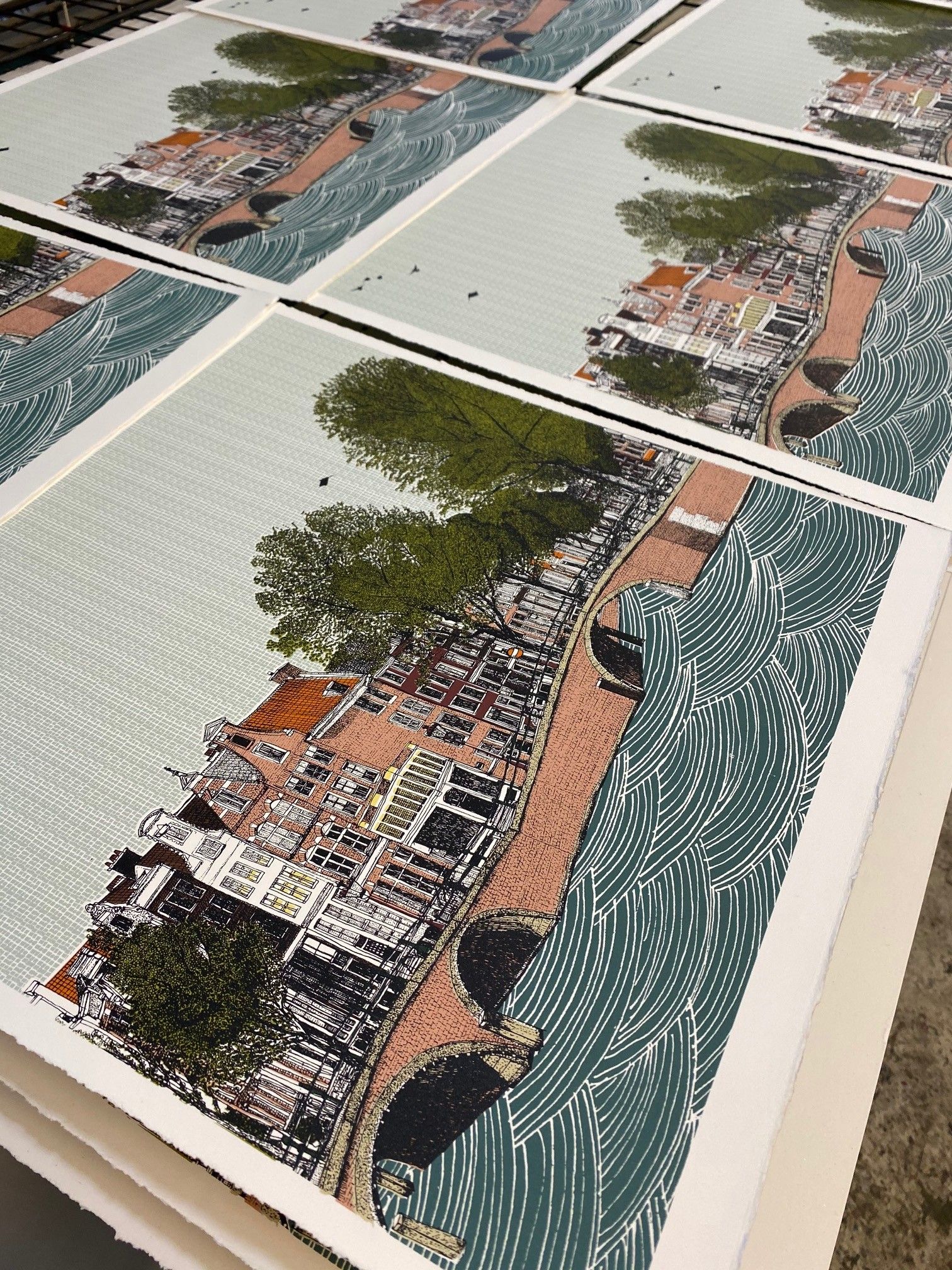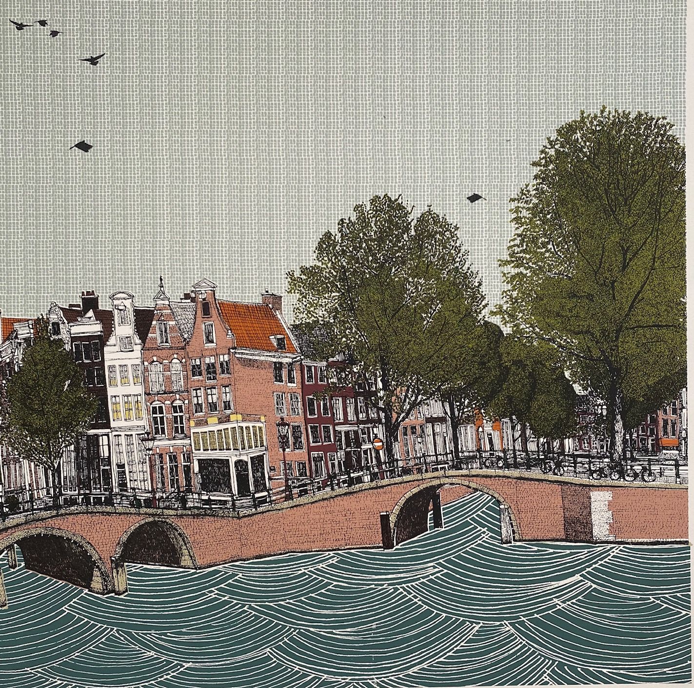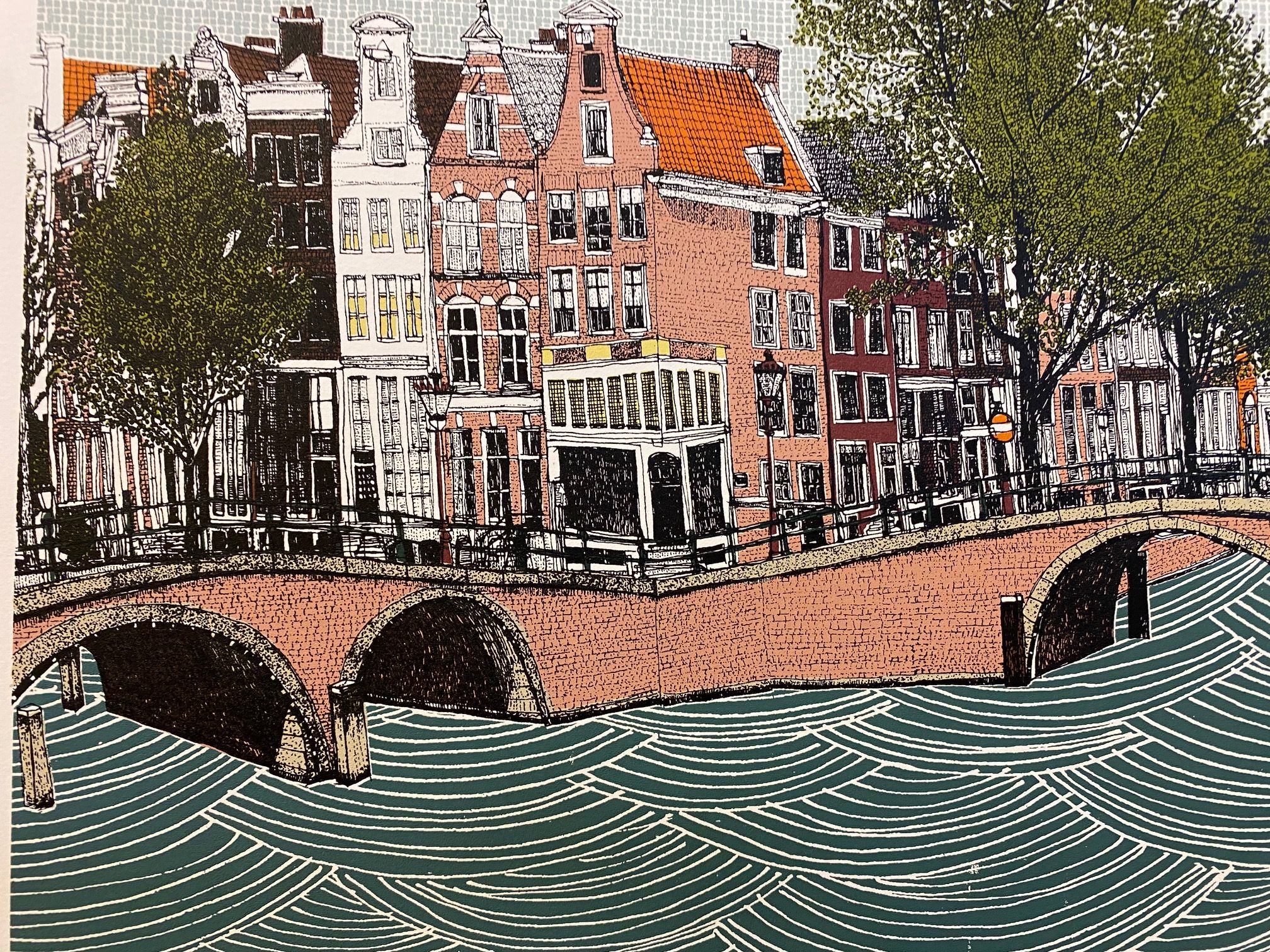 Canal Ring, Amsterdam and Cycle City, Amsterdam is a 10 colour silkscreen print Diptych by Clare Halifax. The process involved in producing a print starts with an observational pen drawing of the subject being portrayed. Once this image is finished, it is then scanned at a high resolution and taken into